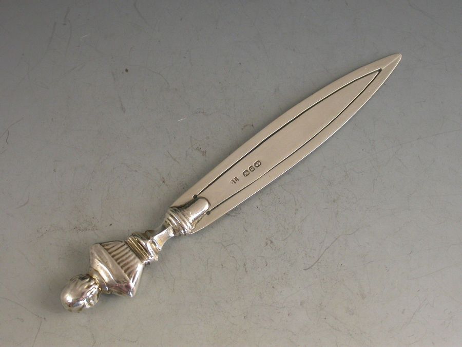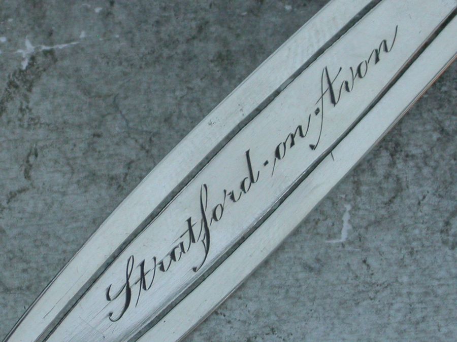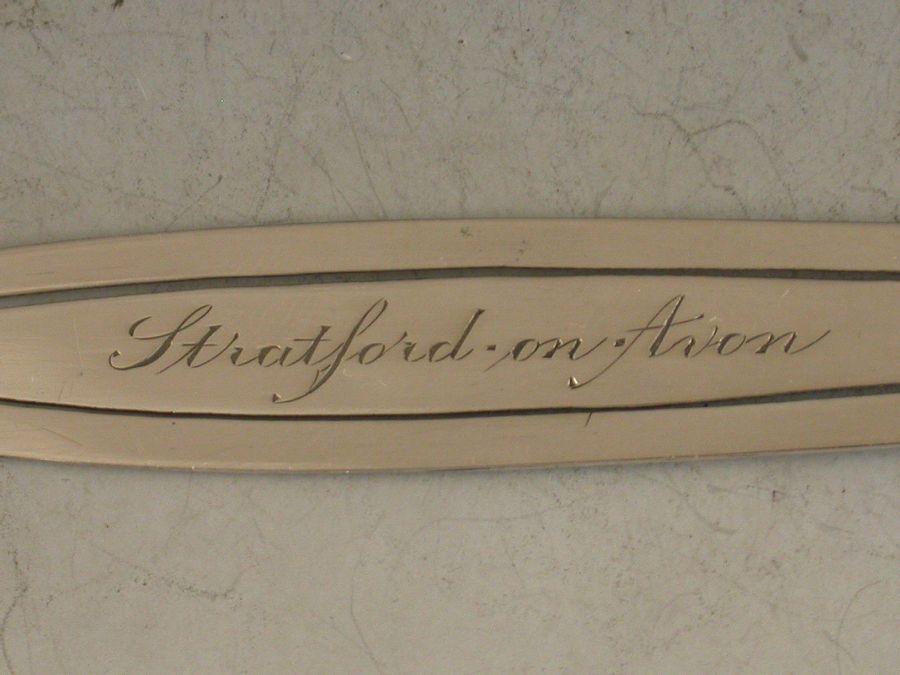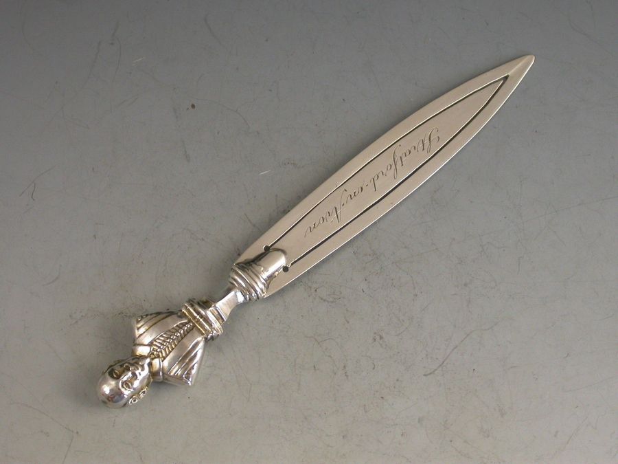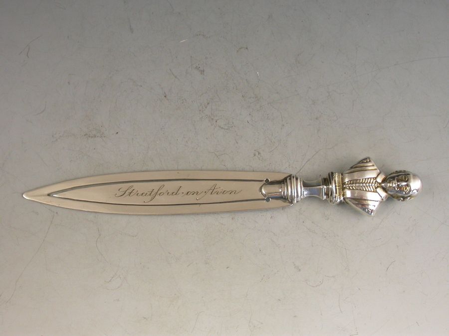 A rare Victorian silver Bookmark, the dagger shaped blade engraved; 'Stratford-on-Avon', the terminal formed as a partly gilded bust of William Shakespeare.