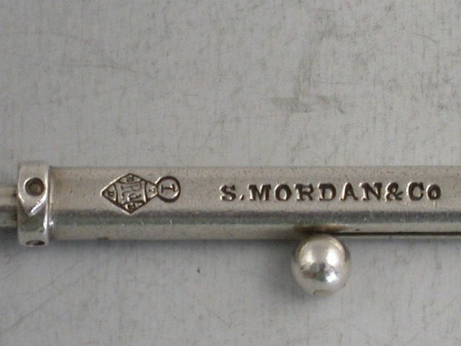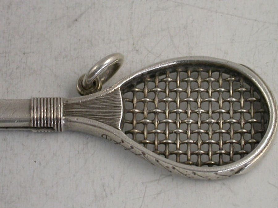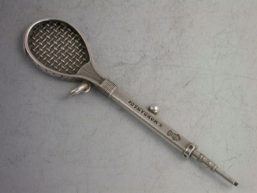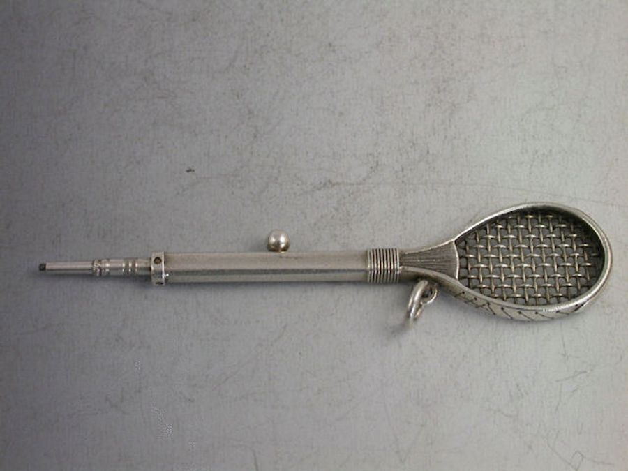 A rare Victorian Novelty silver Propelling Pencil in the form of a Tennis or Rackets Racket, with slide out pencil. Stamped - S.Mordan & Co and with Diamond Registration mark for 7th September 1878.