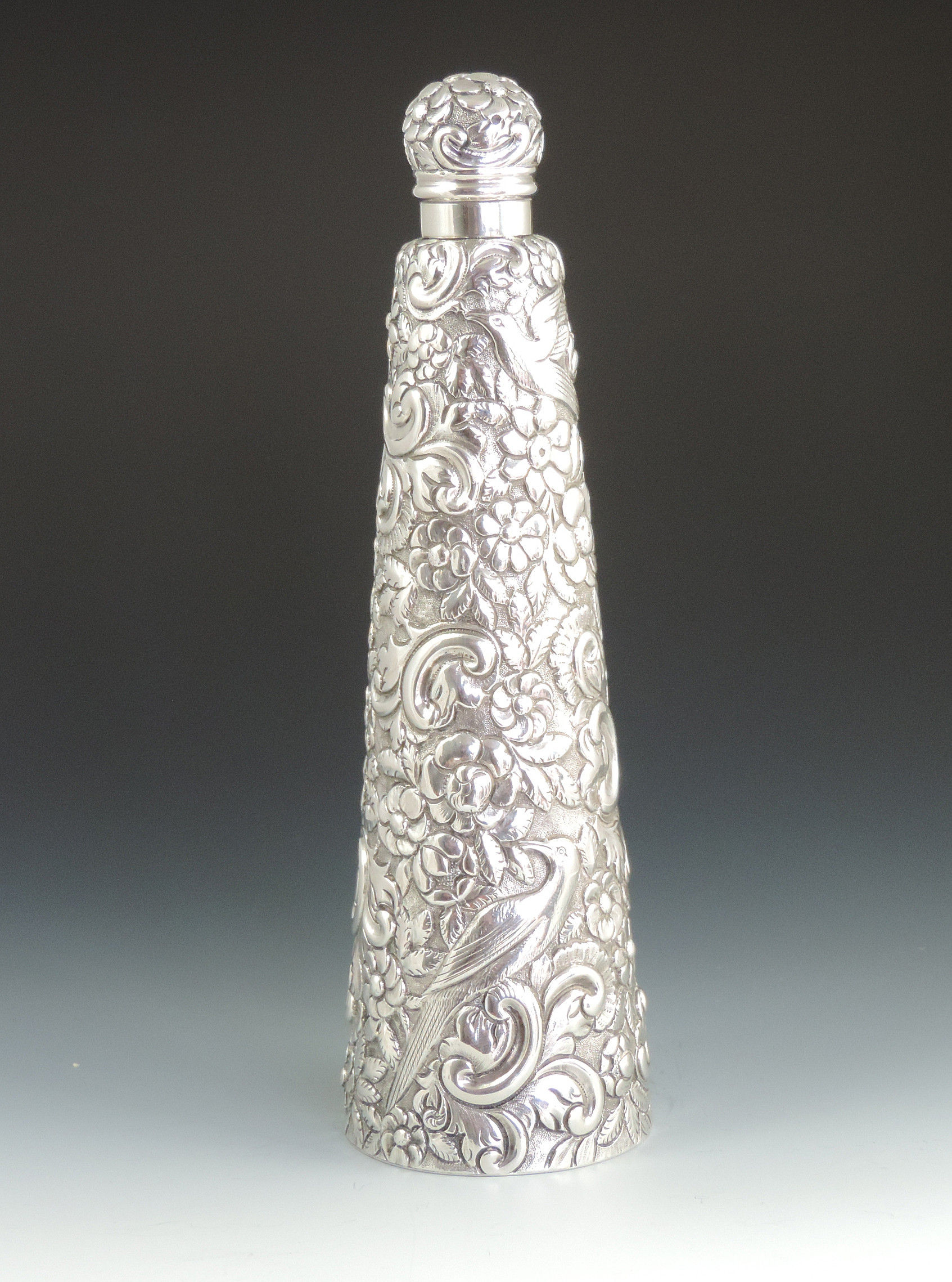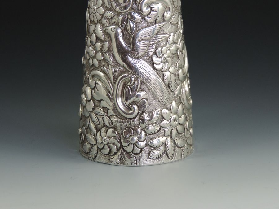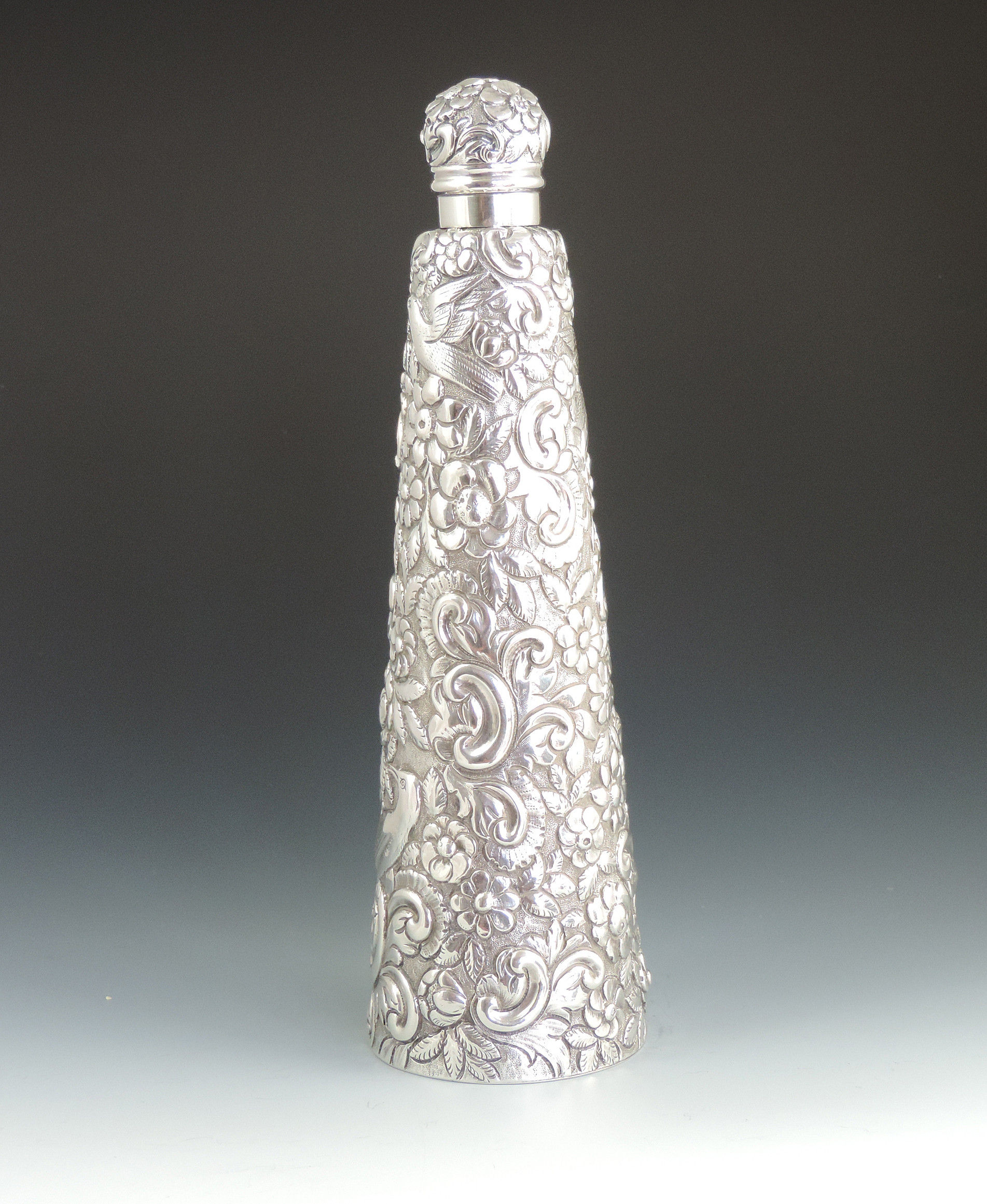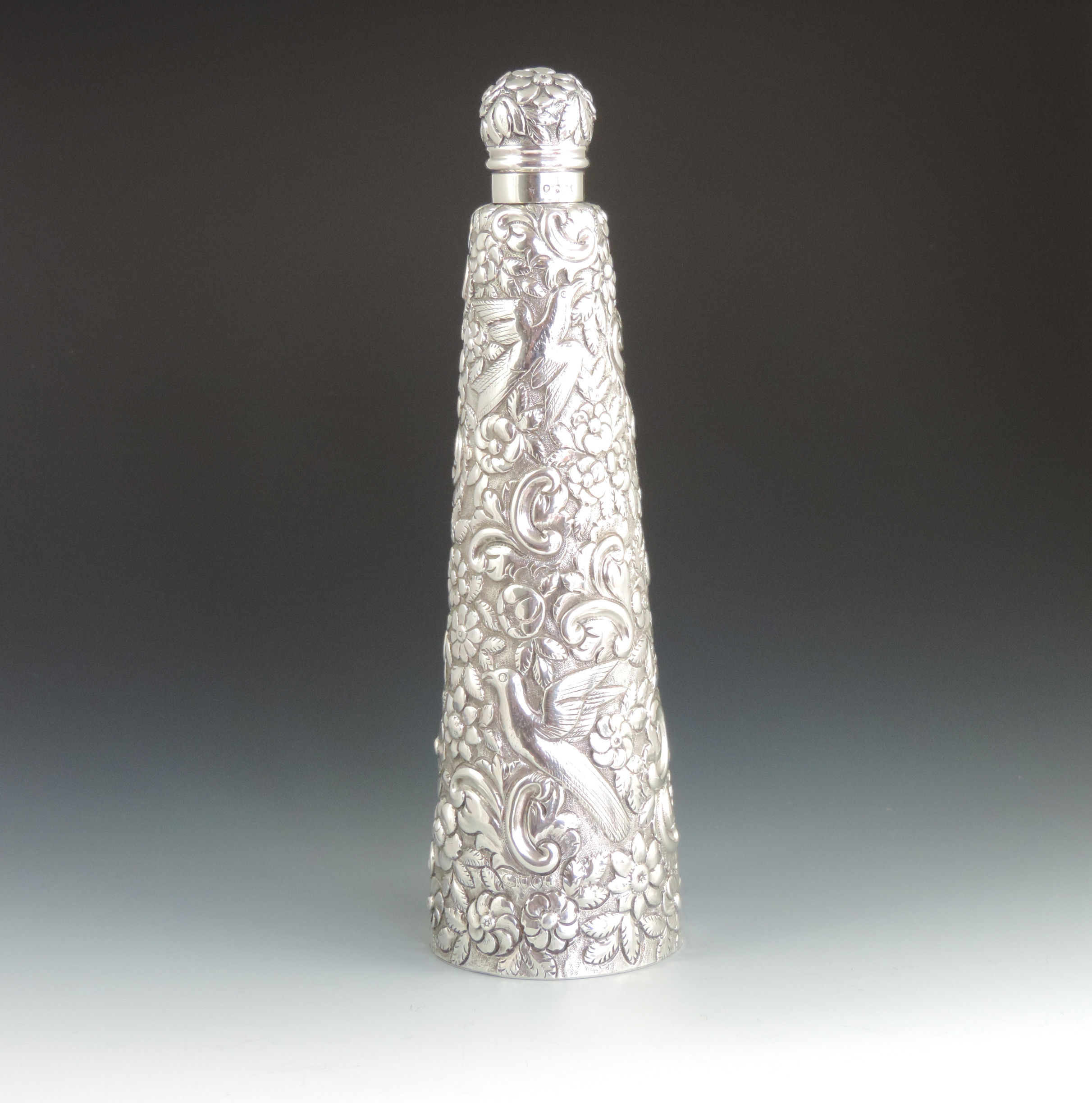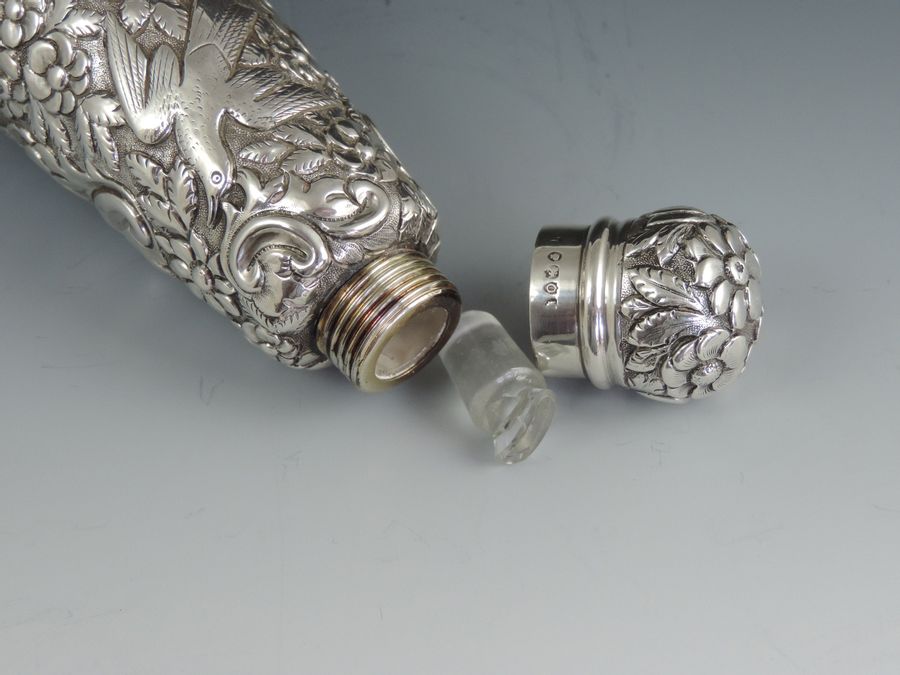 A very large Victorian embossed silver Scent or Toilet Water Bottle of conical form with screw off cap, integral glass liner and glass stopper, the body profusely decorated with exotic birds amongst foliage flower heads and scrolls.