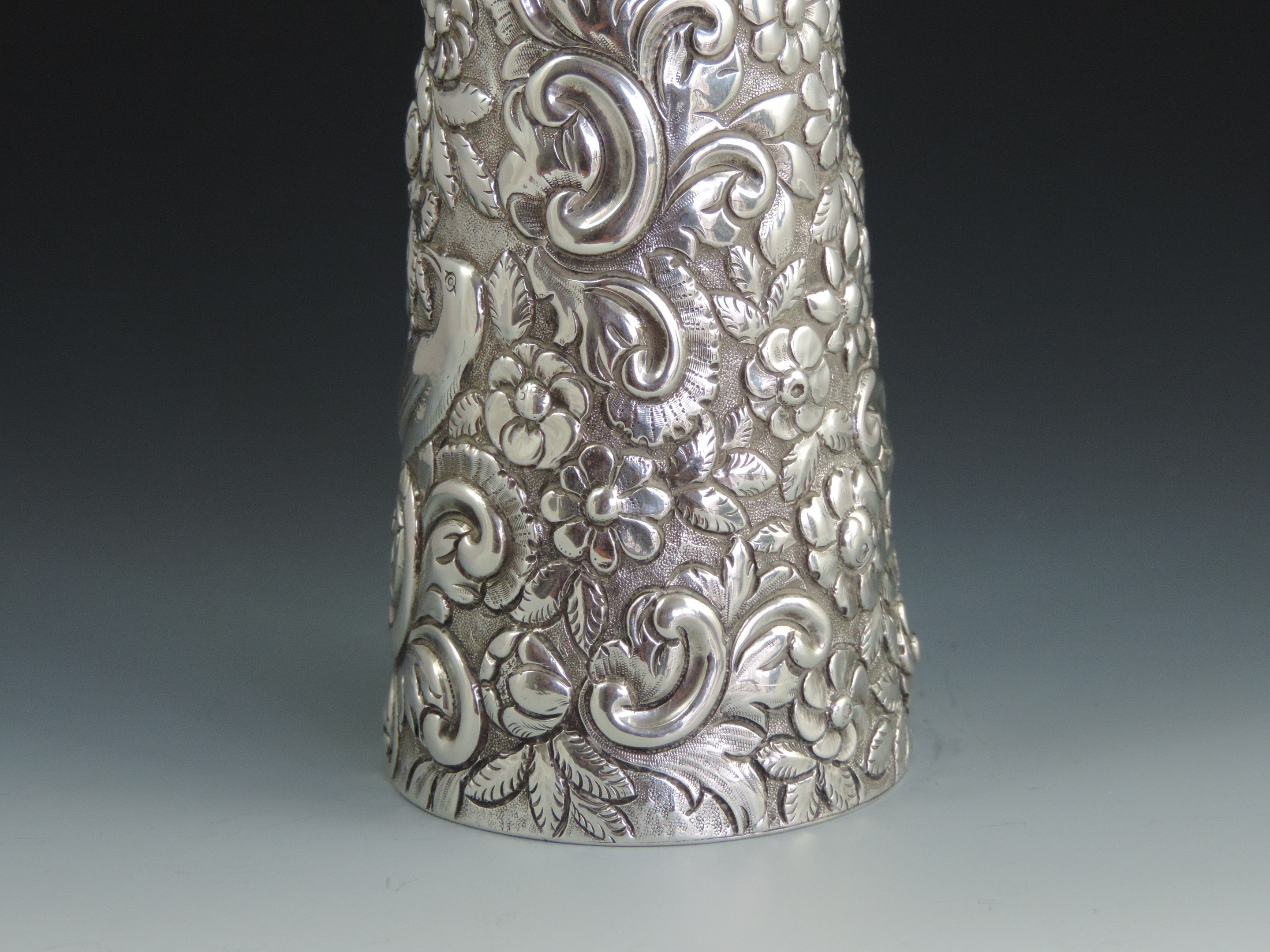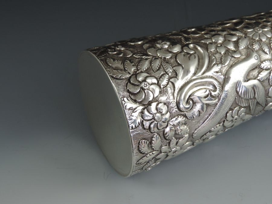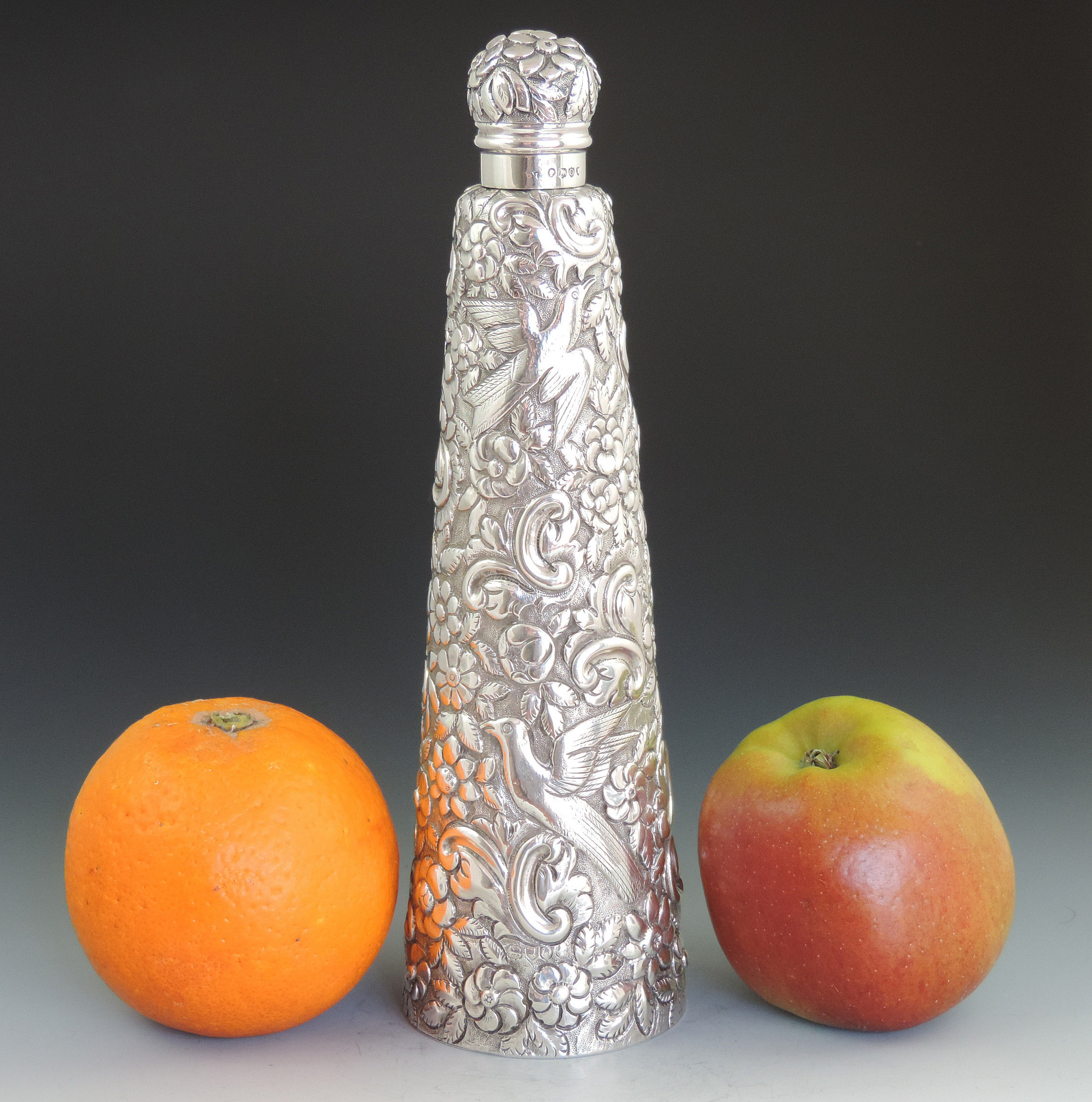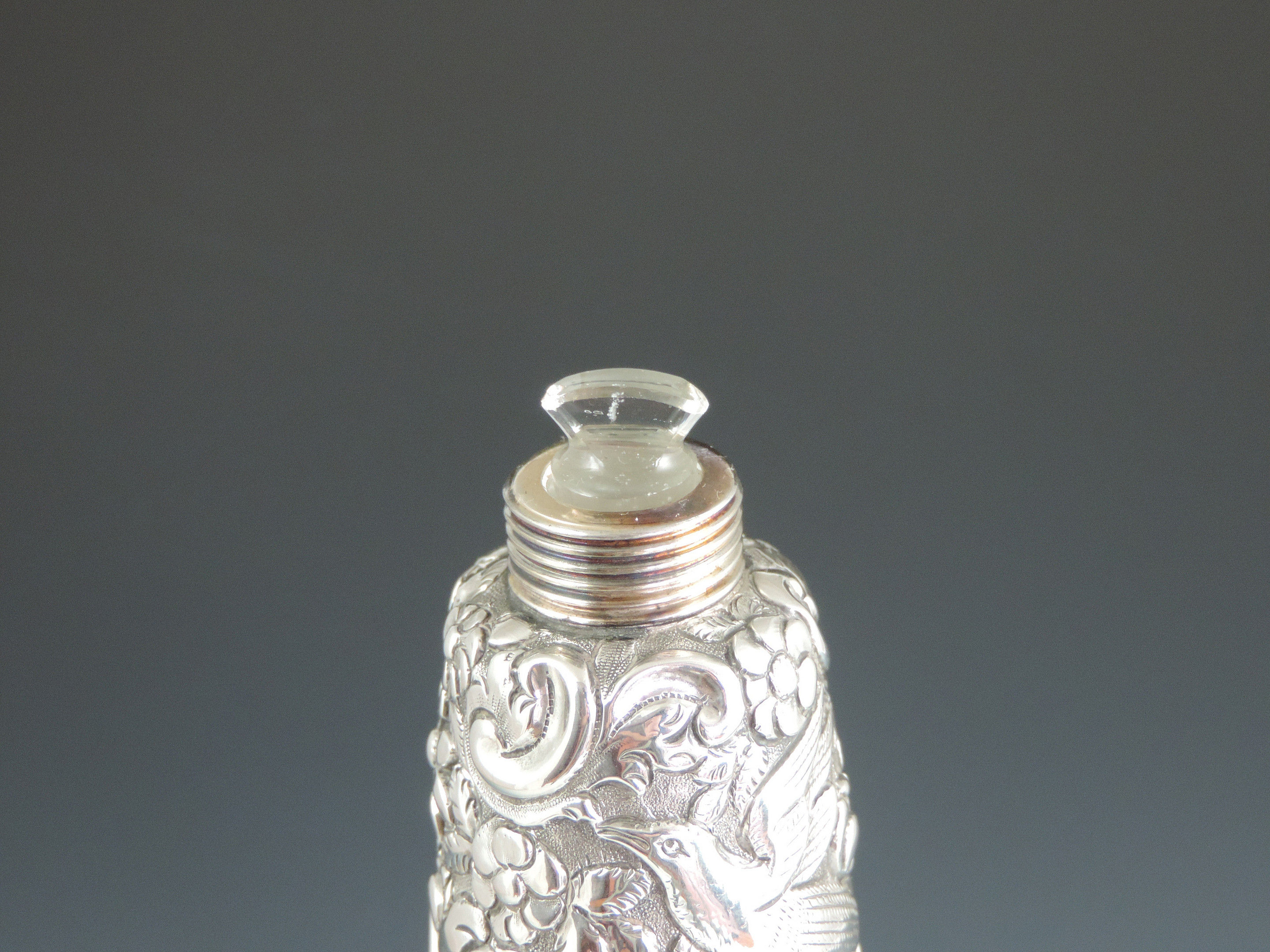 A very large Victorian embossed silver Scent or Toilet Water Bottle of conical form with screw off cap, integral glass liner and glass stopper, the body profusely decorated with exotic birds amongst foliage flower heads and scrolls.