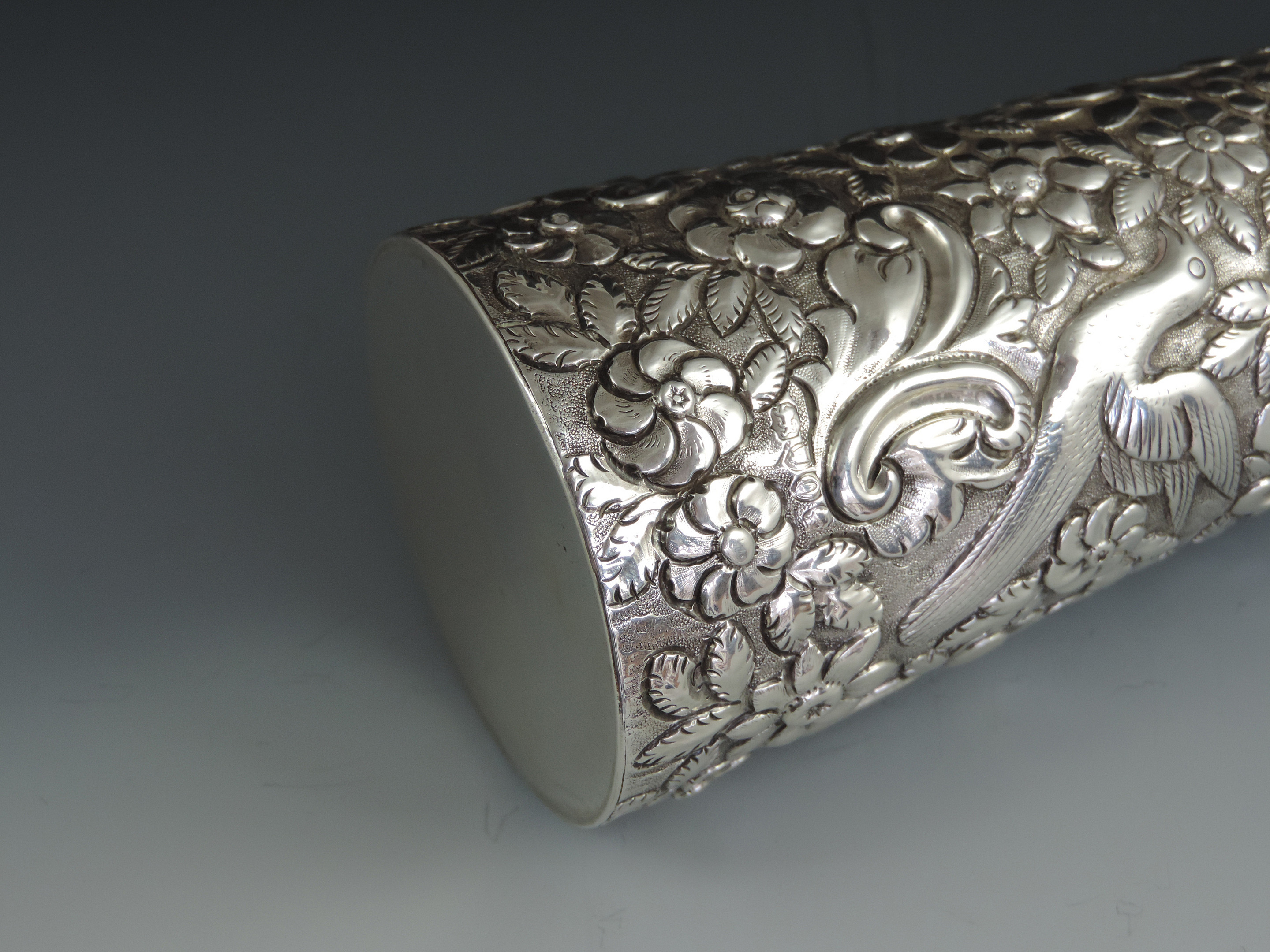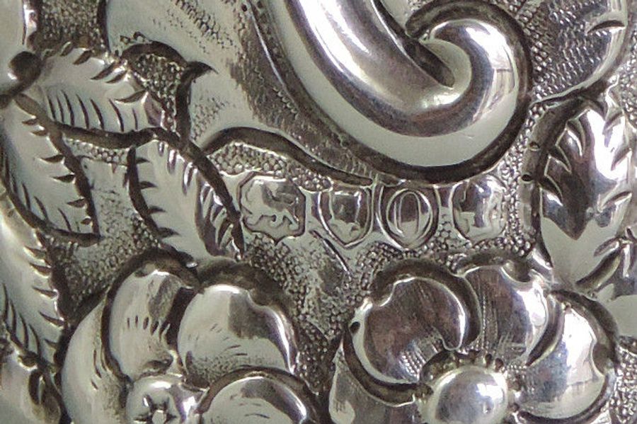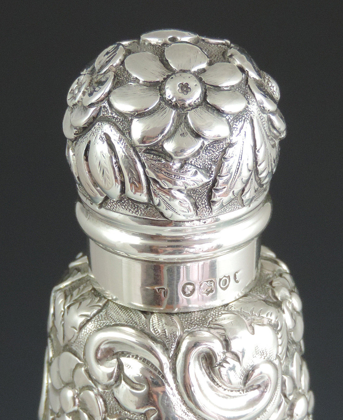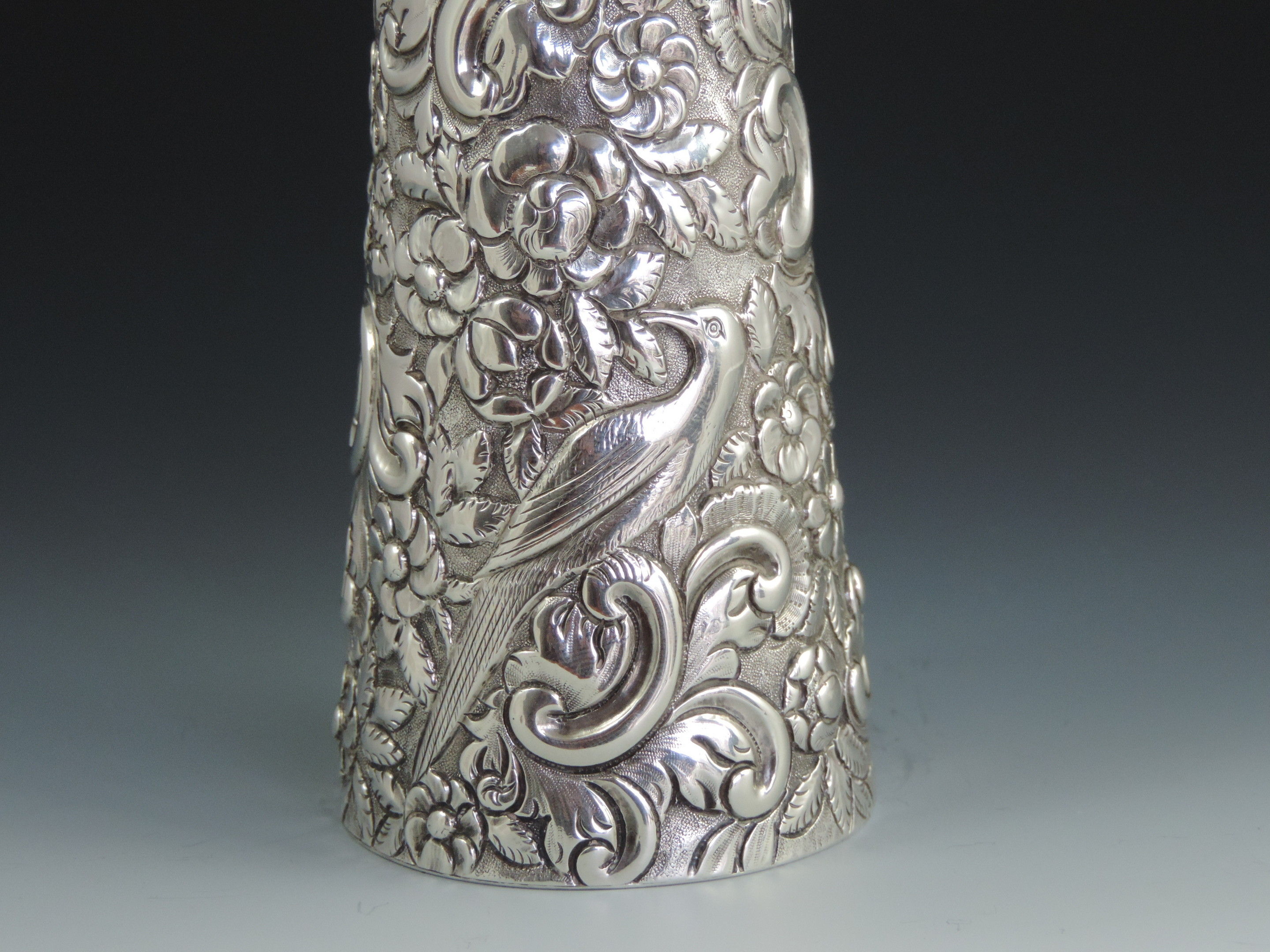 A very large Victorian embossed silver Scent or Toilet Water Bottle of conical form with screw off cap, integral glass liner and glass stopper, the body profusely decorated with exotic birds amongst foliage flower heads and scrolls.