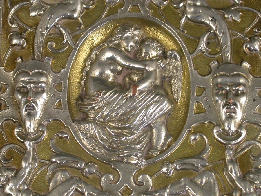 A good quality Victorian parcel-gilt electrotype Card Case, chased in high relief after a design by George Stanton depicting putti playing musical instruments and tugging at mask heads, centered by a young girl embarrassing a putto.