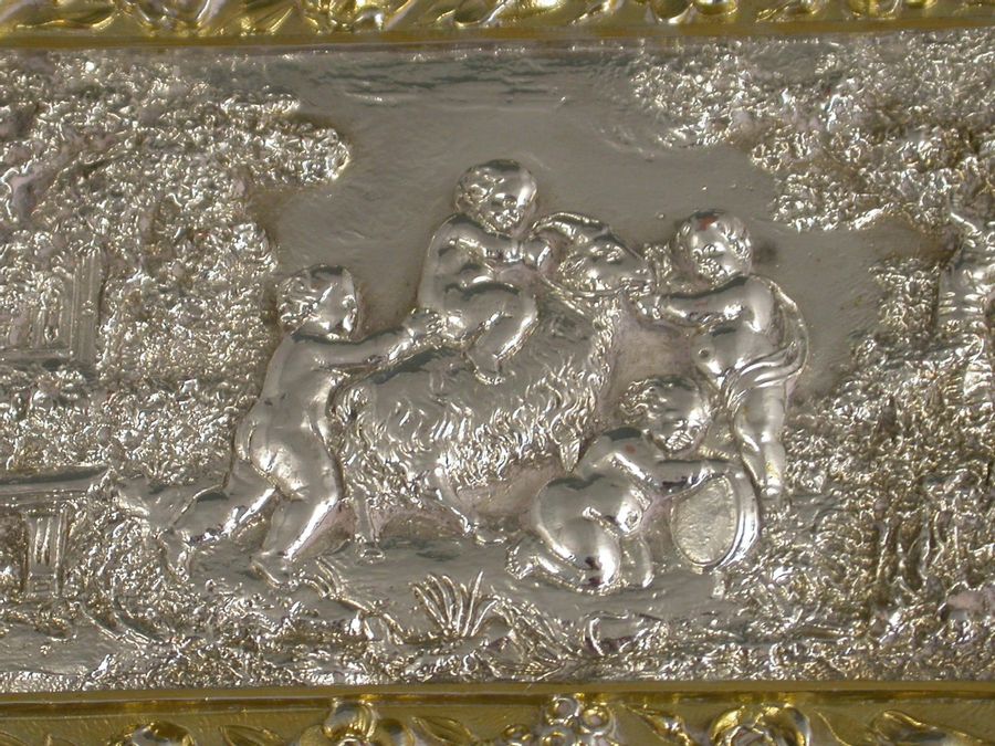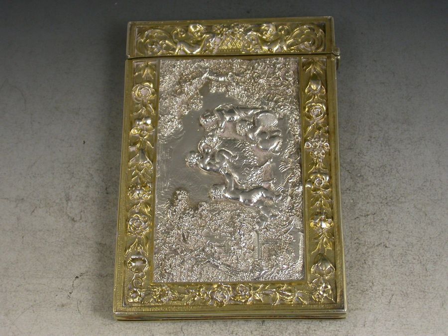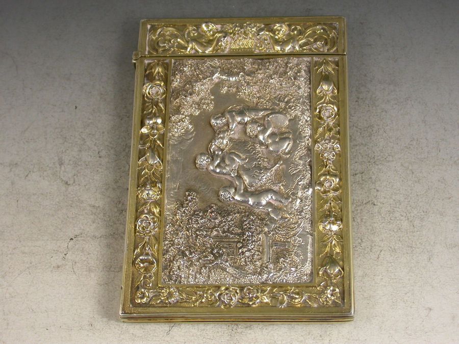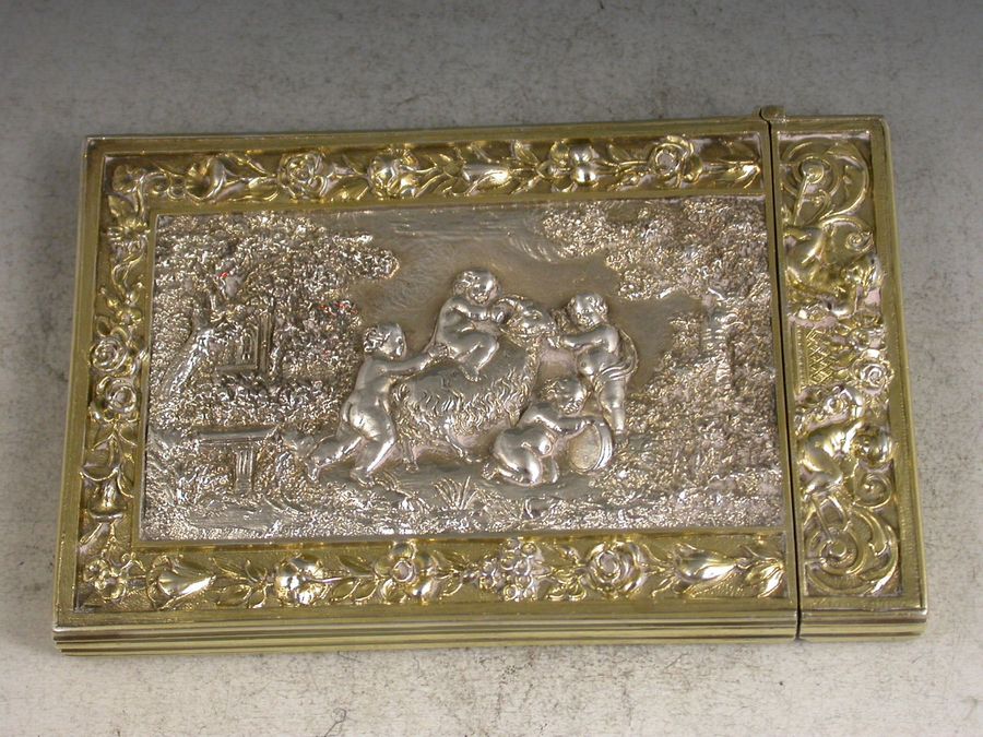 A good quality Victorian parcel-gilt electrotype Card Case, chased in high relief with a group of four putti playing with a goat amidst trees within a border of various flower heads and two more putti.