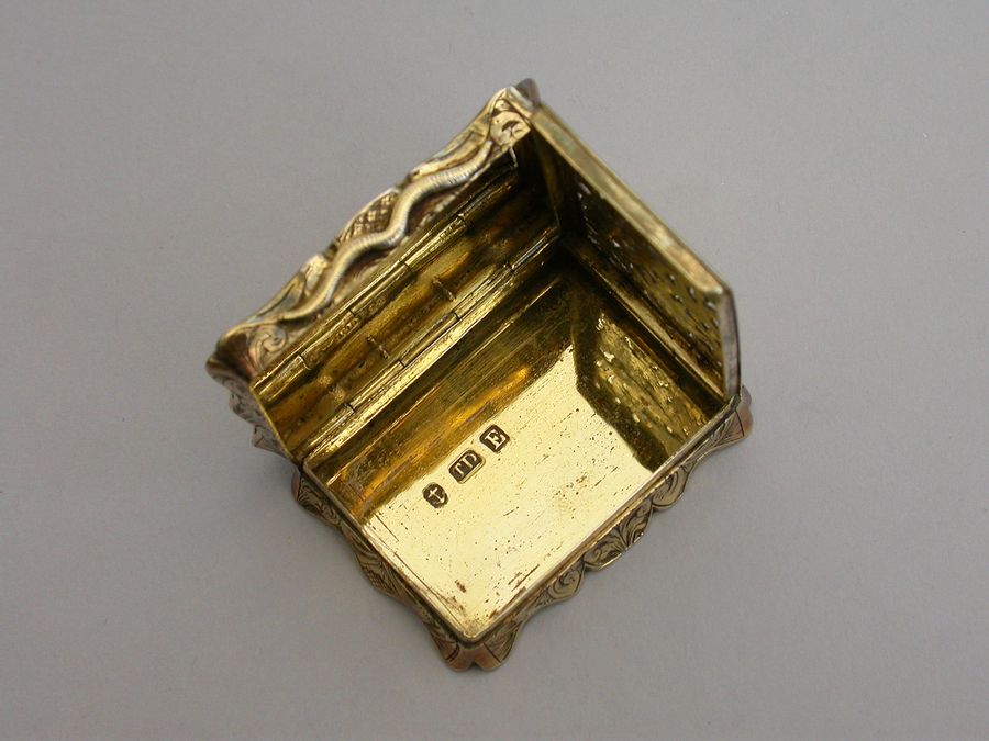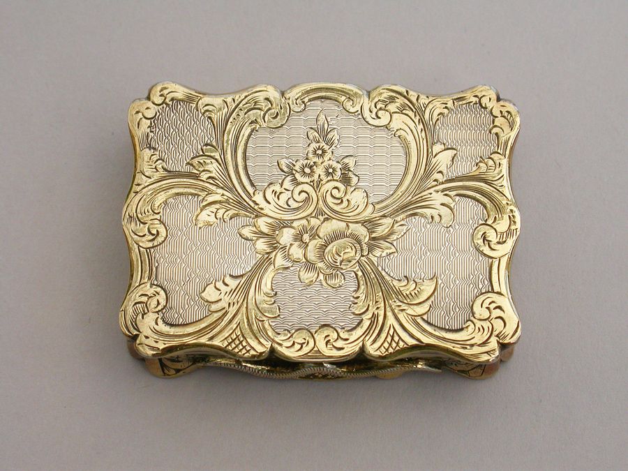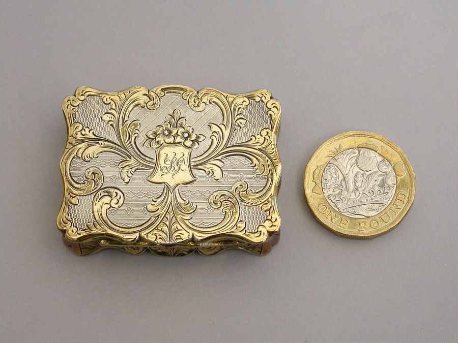 A very fine and large Victorian parcel-gilt silver Vinaigrette of shaped rectangular form with all over decoration of engine turned panes separated by gilt scrolls and flowers, a central shield shaped cartouche engraved with contemporary initials. The pierced silver gilt grille with flower heads and scrolls arising from base left.
