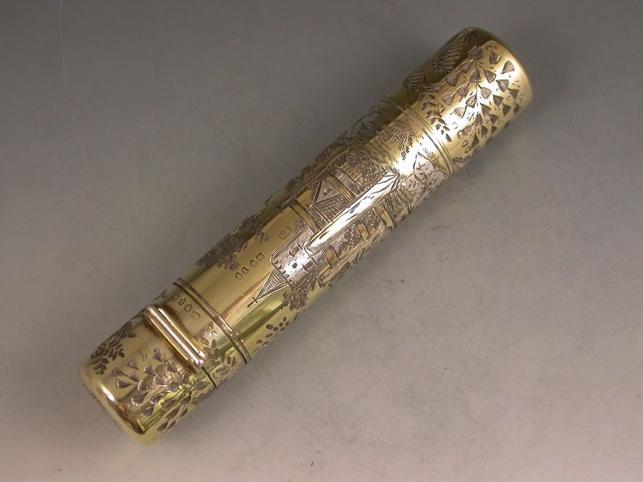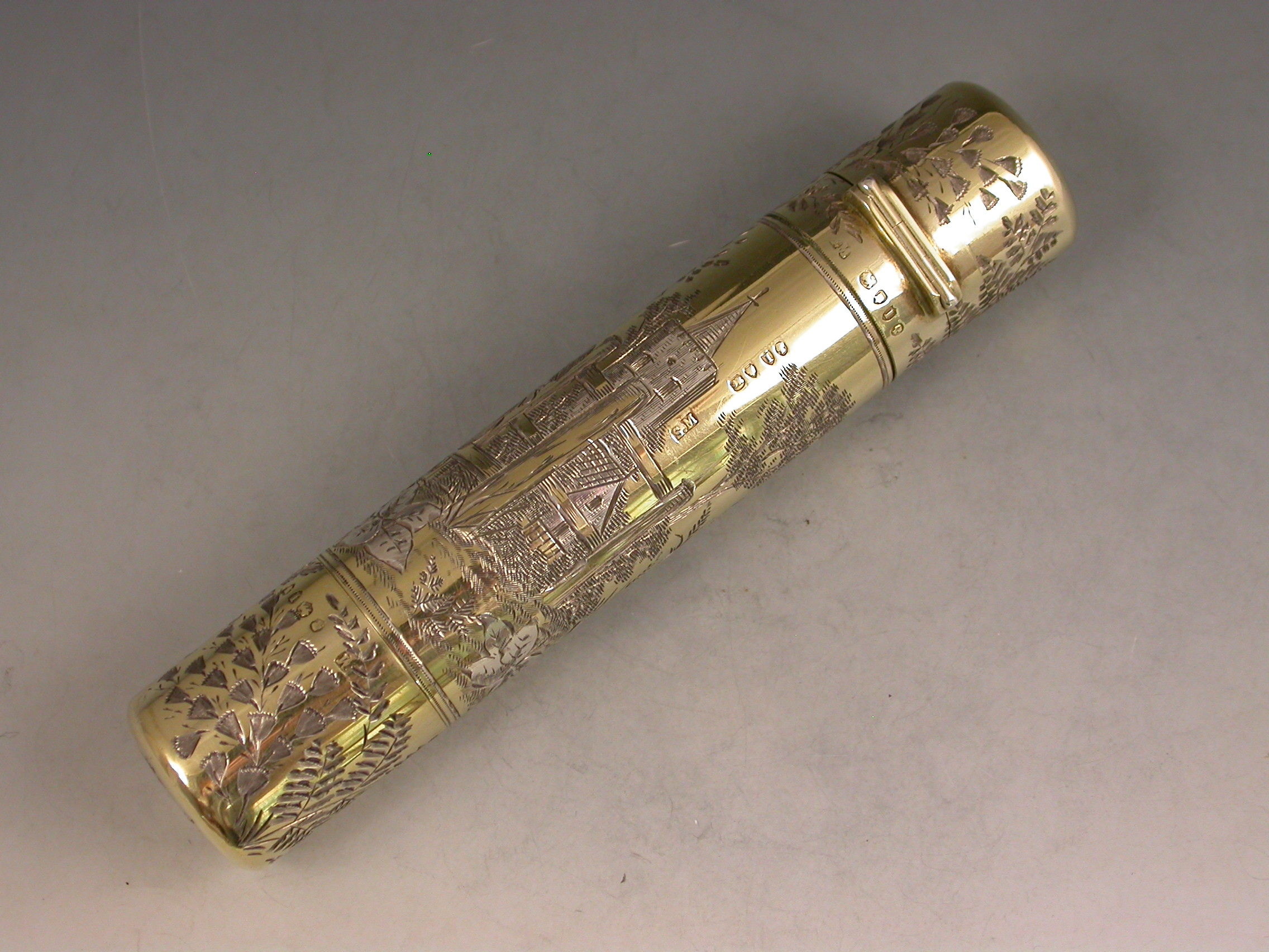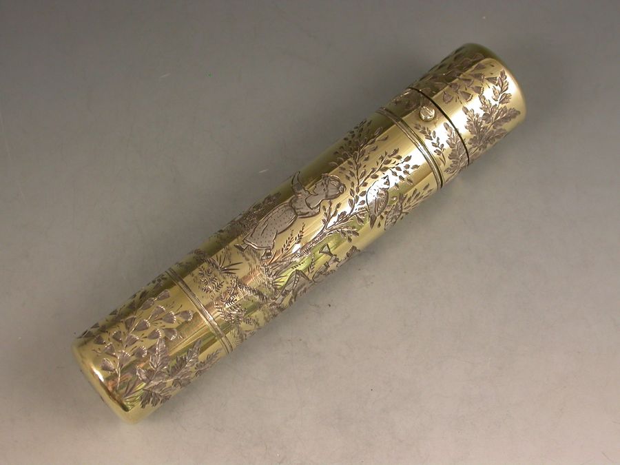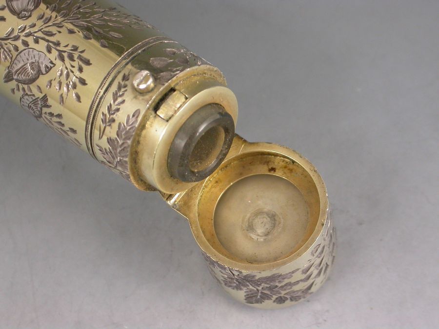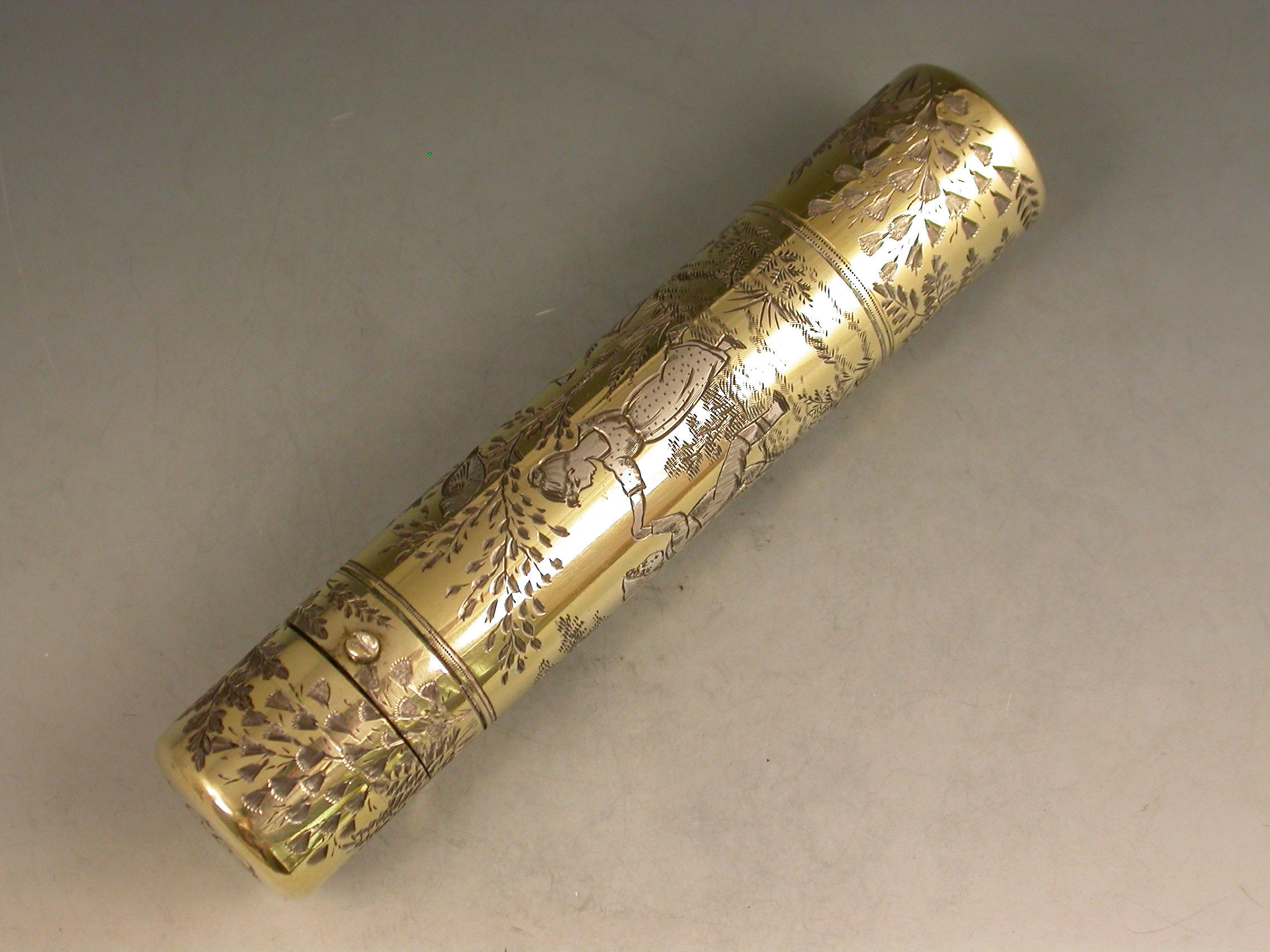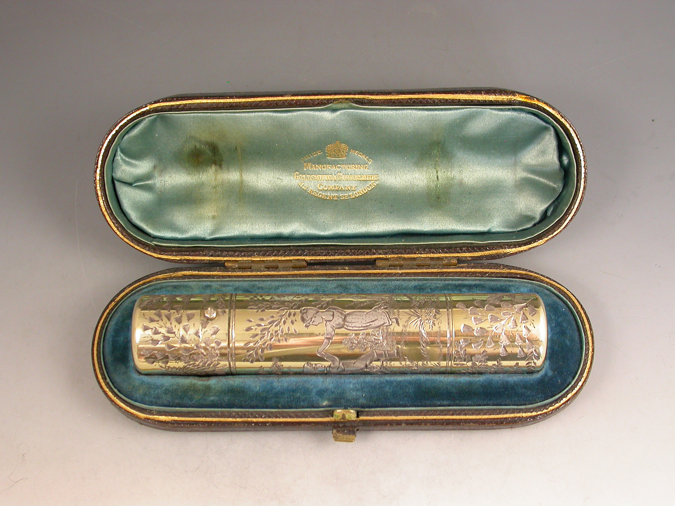 A fine and large Victorian cased parcel gilt silver double ended Scent Bottle with Kate Greenaway style decoration depicting a boy and a girl in period costume playing beneath trees with a church in the background and another boy sitting on a stile playing a horn, finches in the trees. One end with a sprung hinged lid, the other with screw off cap. Complete with original silk and velvet lined Morocco leather case.