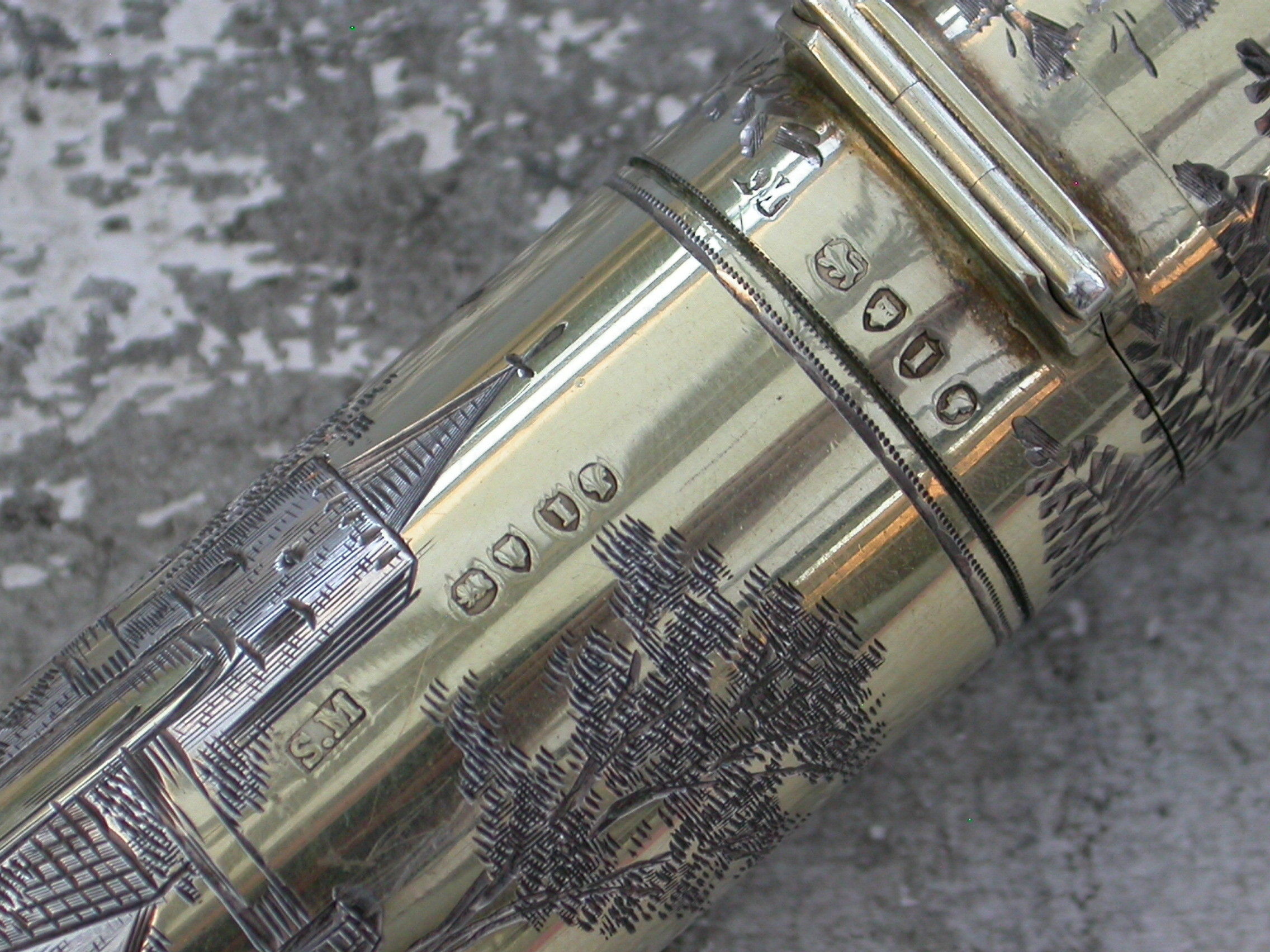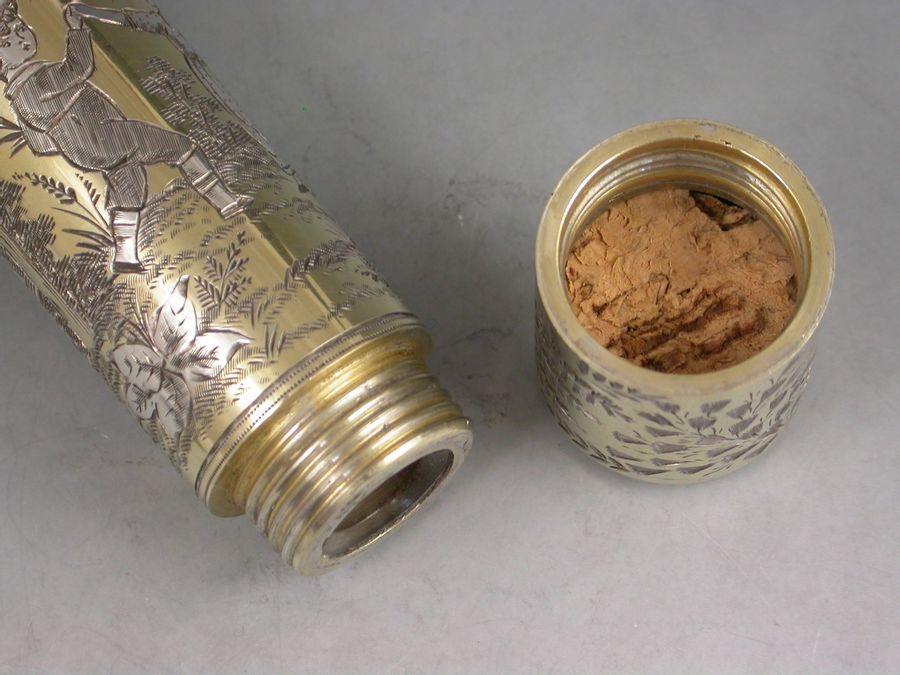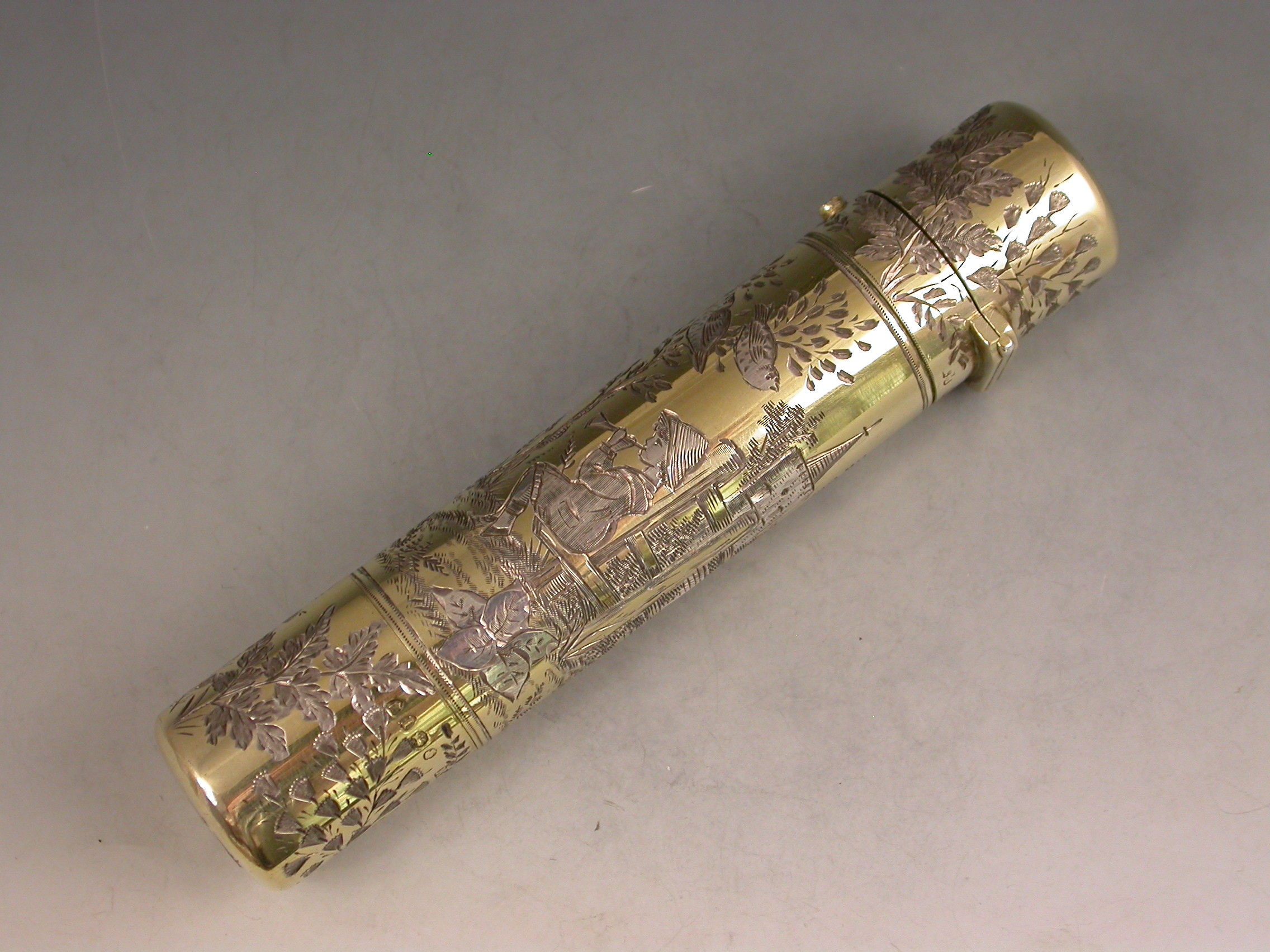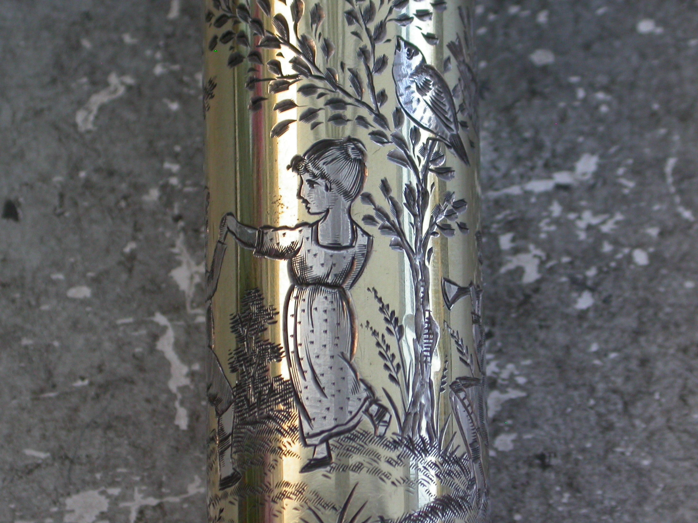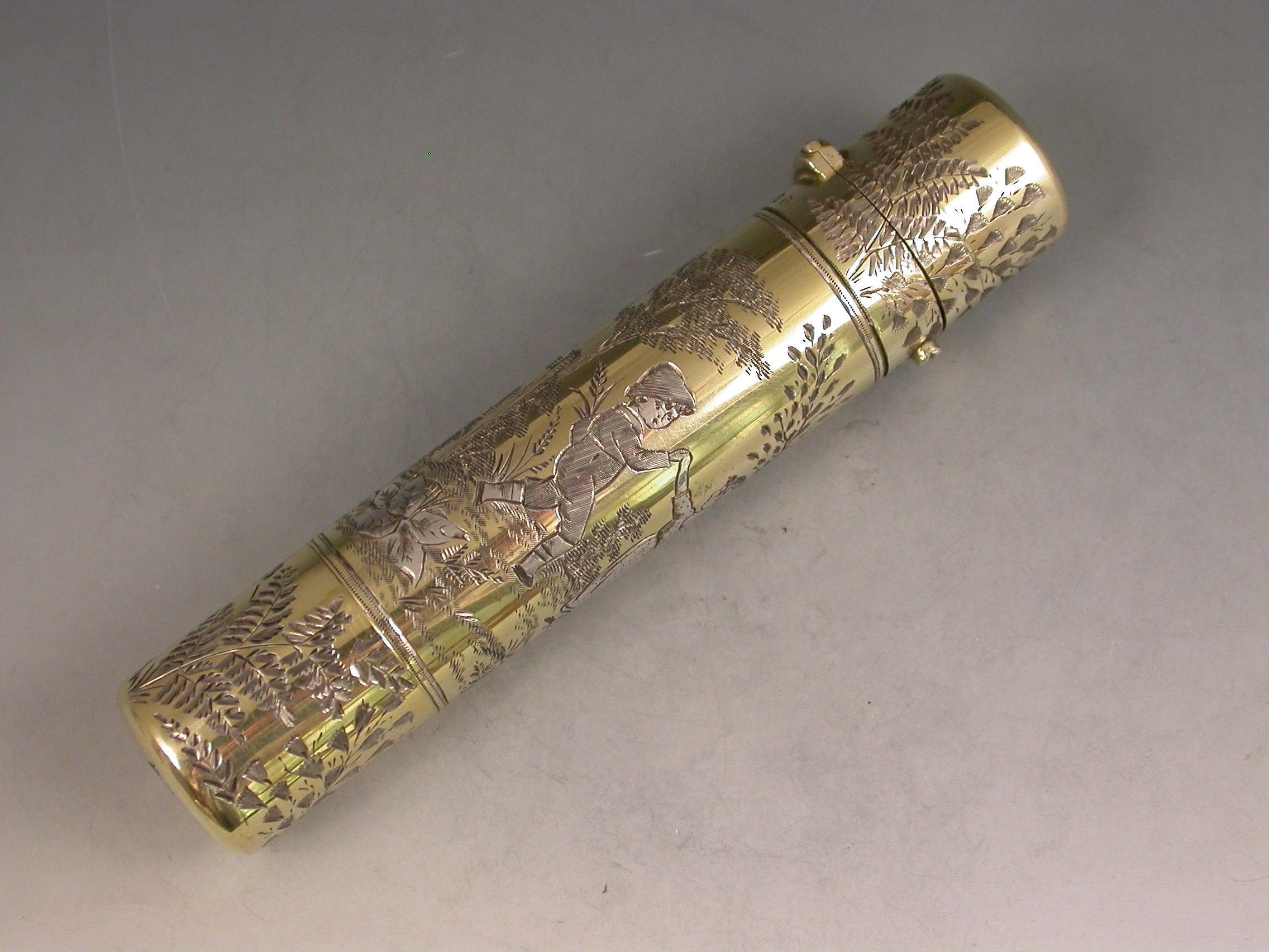 A fine and large Victorian cased parcel gilt silver double ended Scent Bottle with Kate Greenaway style decoration depicting a boy and a girl in period costume playing beneath trees with a church in the background and another boy sitting on a stile playing a horn, finches in the trees. One end with a sprung hinged lid, the other with screw off cap. Complete with original silk and velvet lined Morocco leather case.