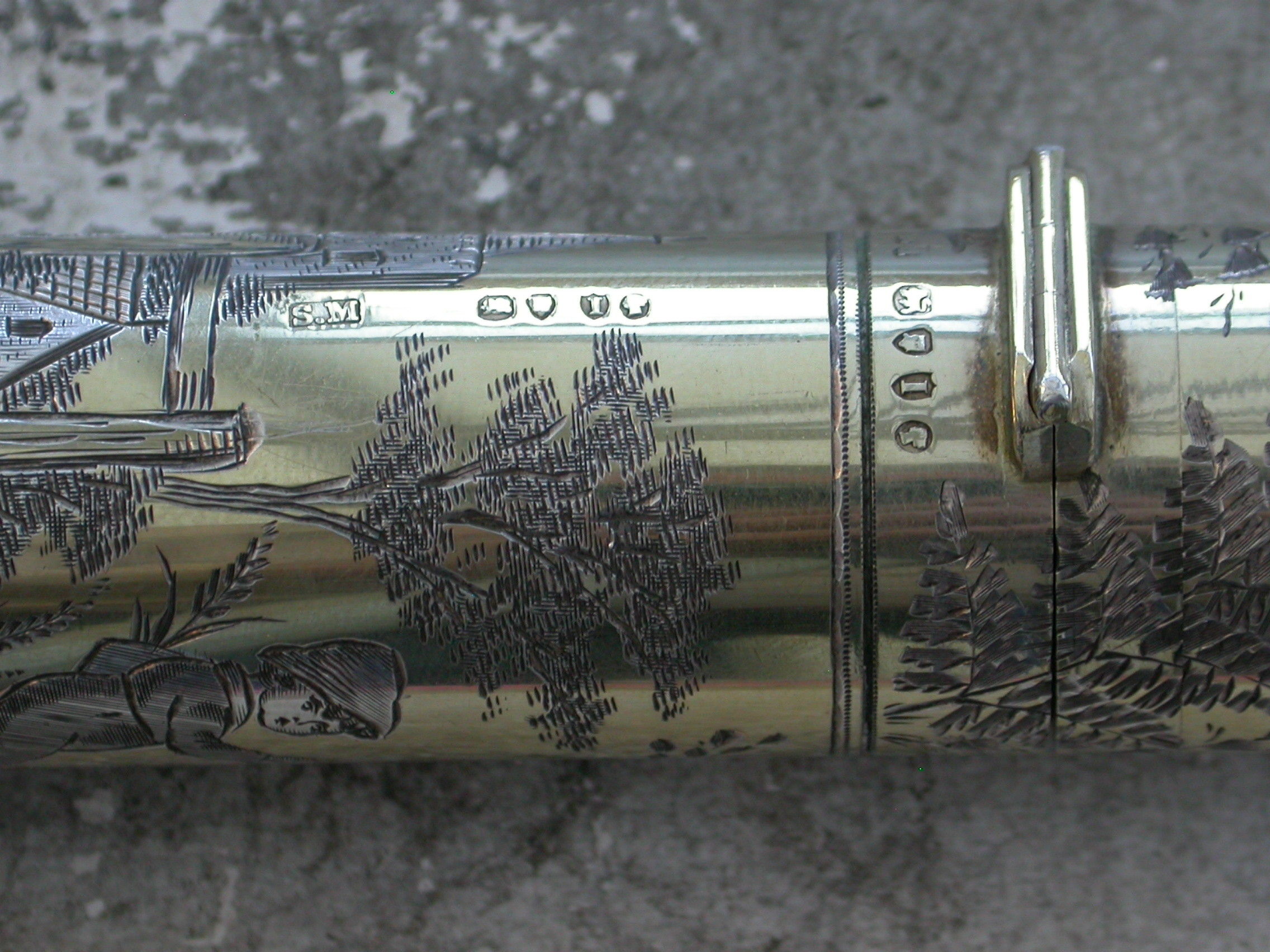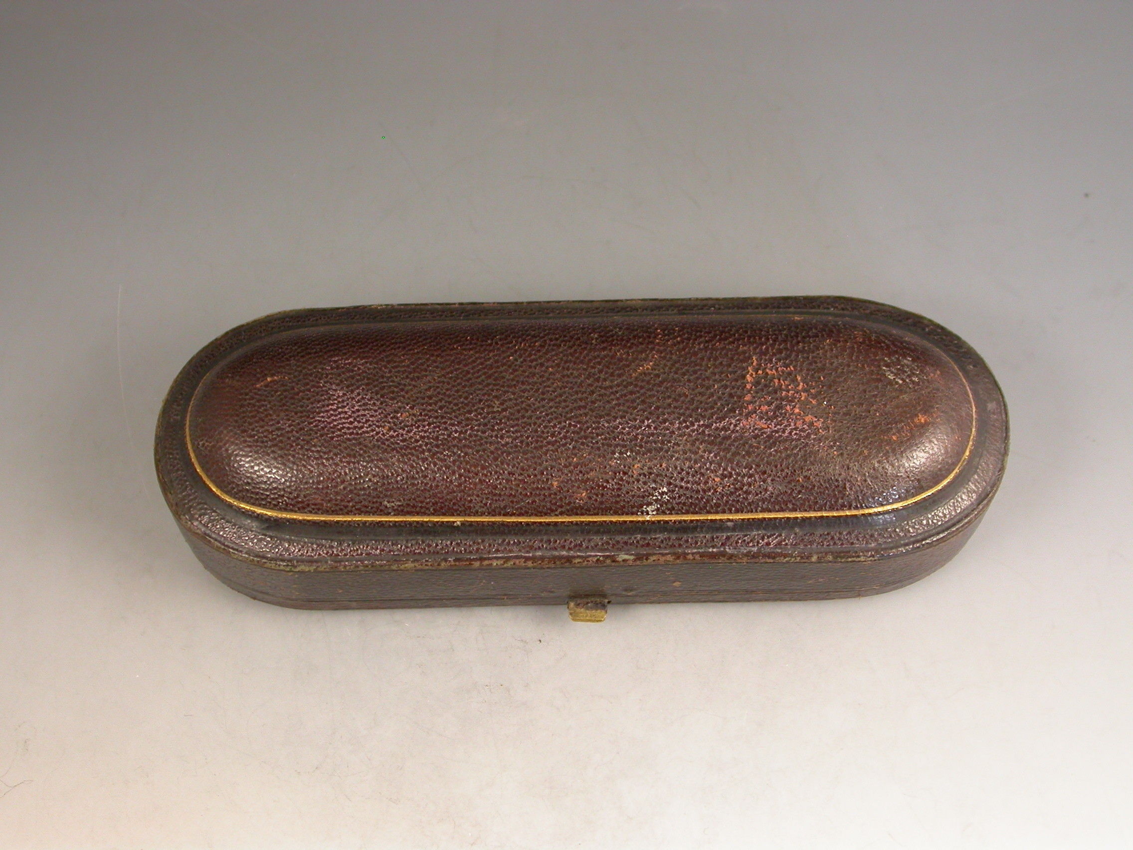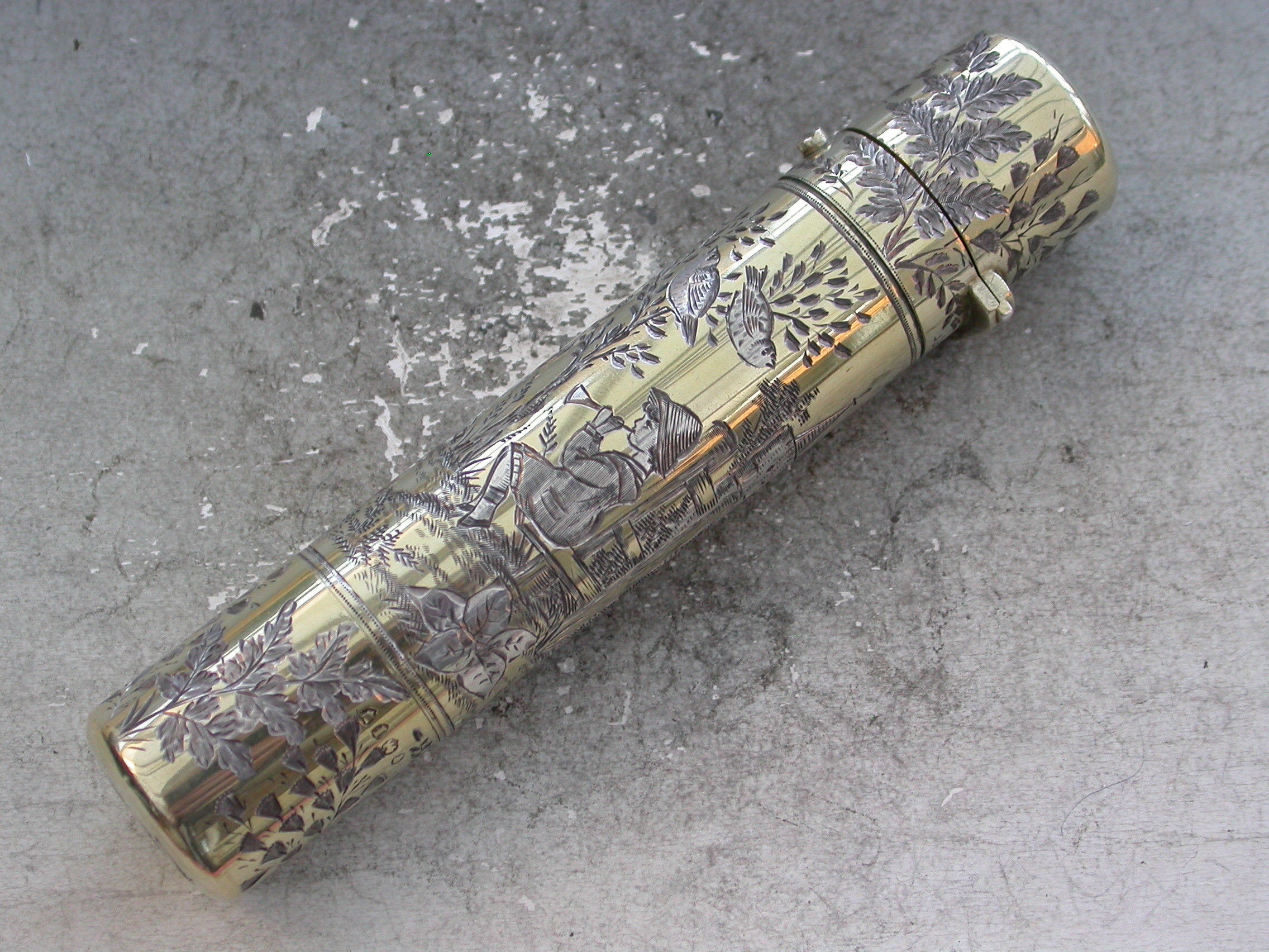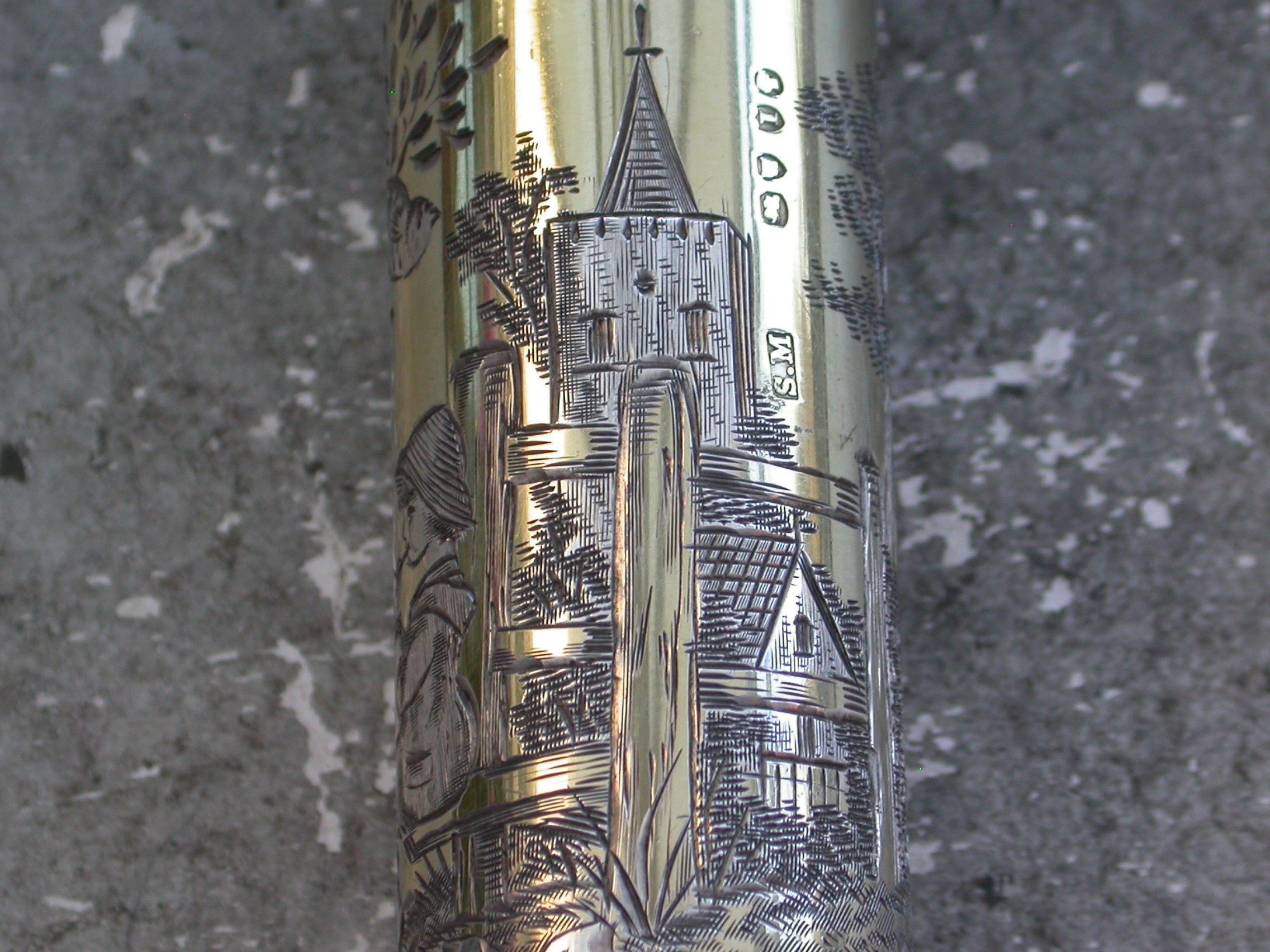 A fine and large Victorian cased parcel gilt silver double ended Scent Bottle with Kate Greenaway style decoration depicting a boy and a girl in period costume playing beneath trees with a church in the background and another boy sitting on a stile playing a horn, finches in the trees. One end with a sprung hinged lid, the other with screw off cap. Complete with original silk and velvet lined Morocco leather case.