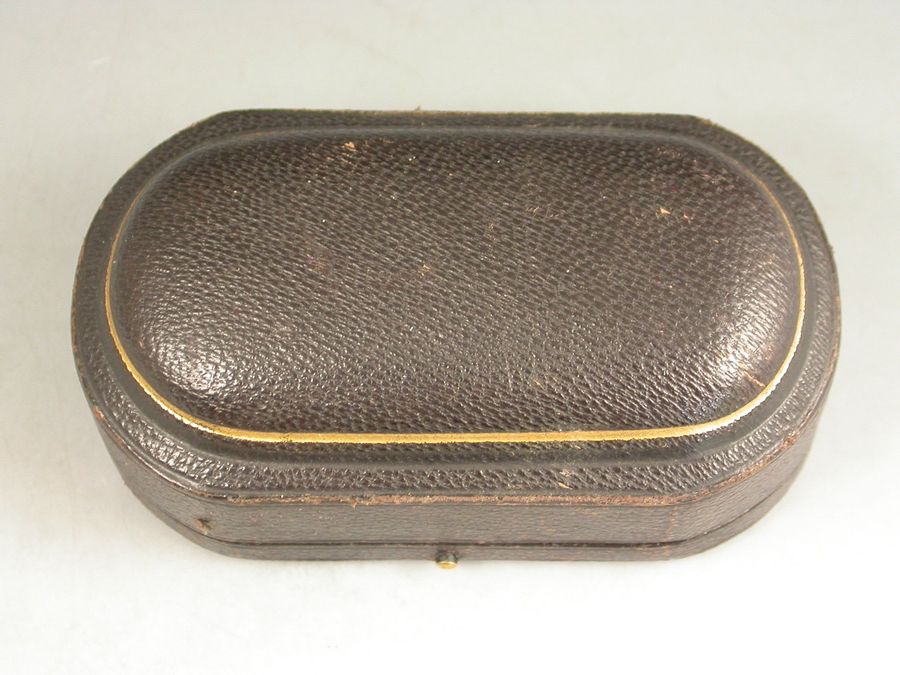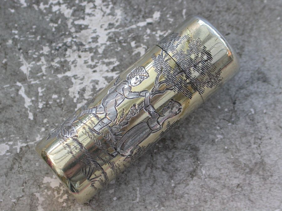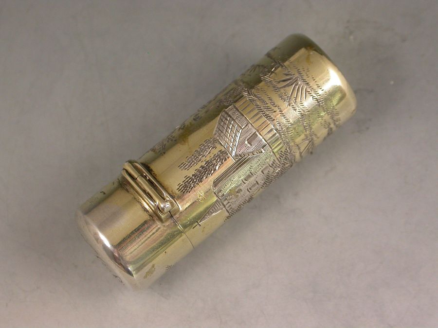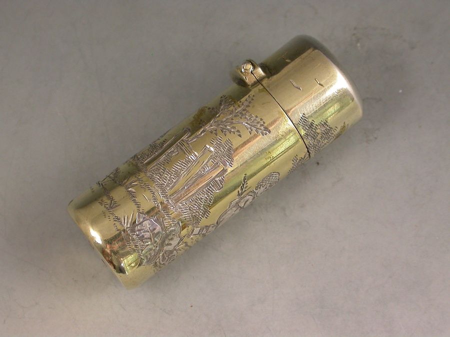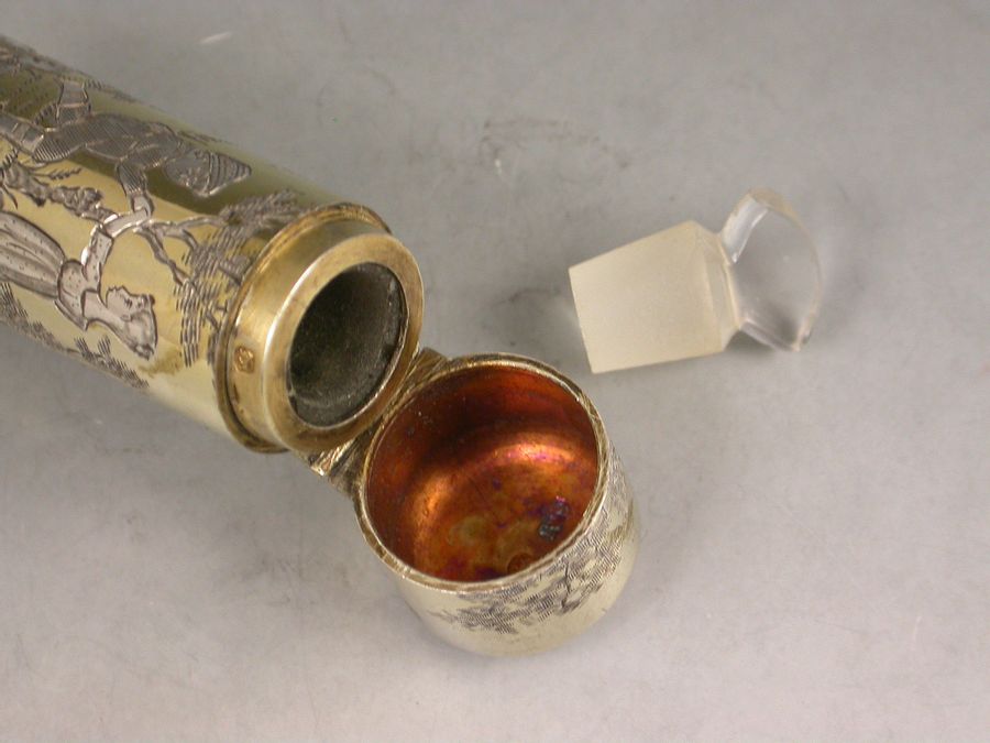 A good Victorian parcel gilt silver Scent Bottle of cylindrical form with hinged lid and glass stopper, the body decorated in Kate Greenaway style with a boy and a girl playing under a tree, a church in the background. Complete with associated silk and velvet lined Morocco leather case.
