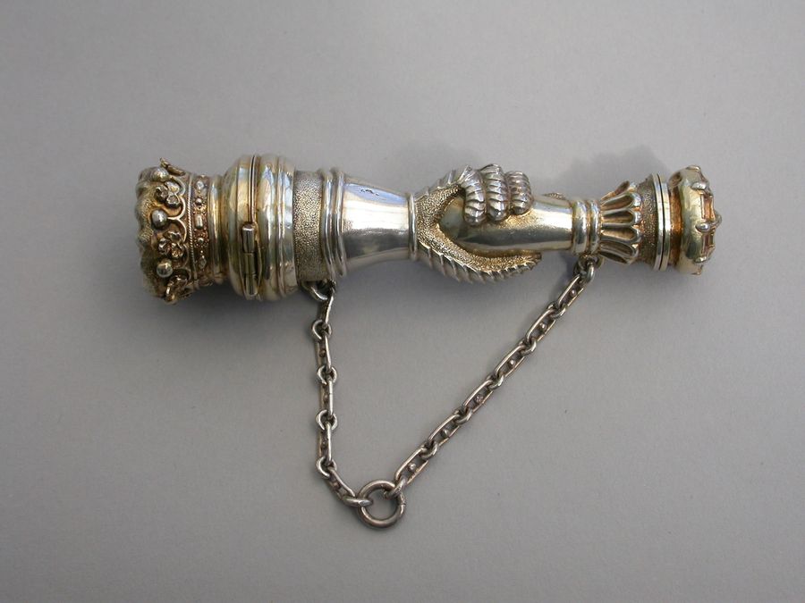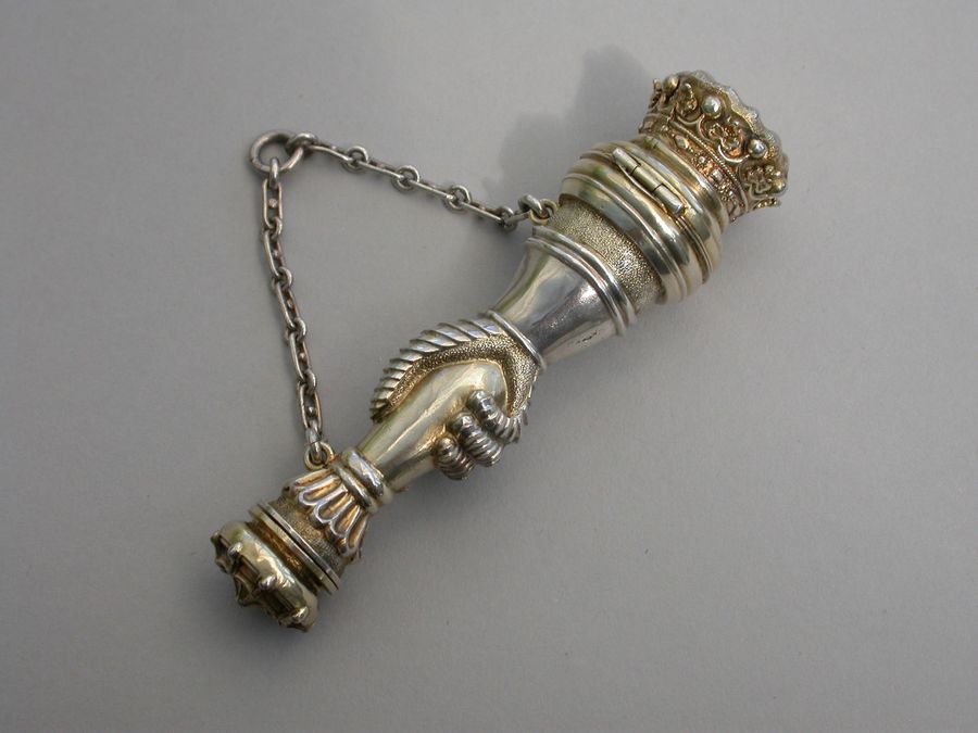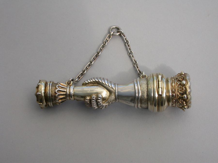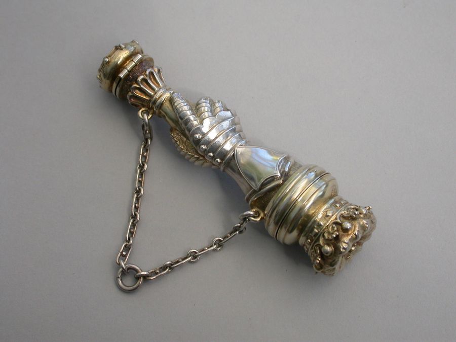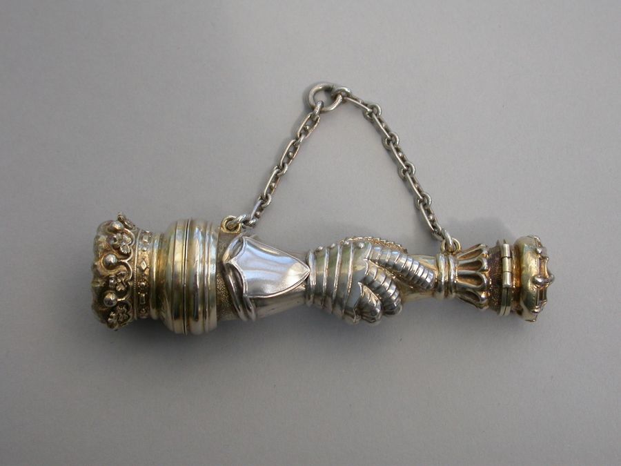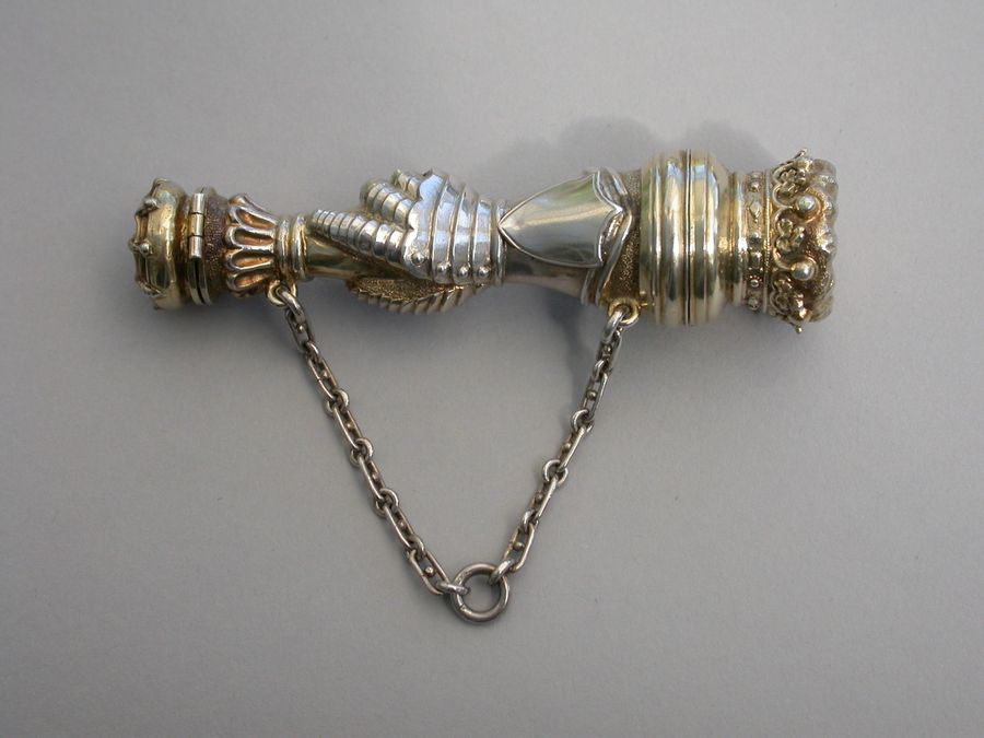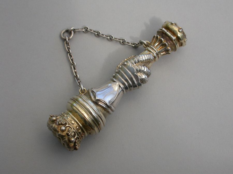 An extremely rare Victorian parcel gilt silver combined Vinaigrette and Scent Bottle formed as a mace held by a hand in an armoured gauntlet with a vacant shield above. One end formed as a Marquis's Coronet opening to reveal a vinaigrette, the grille edged with scrolls and with a central raised cross. The other end with hinged compartment for perfume. Attached suspension ring and chain.