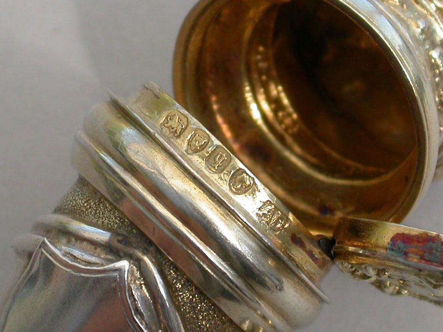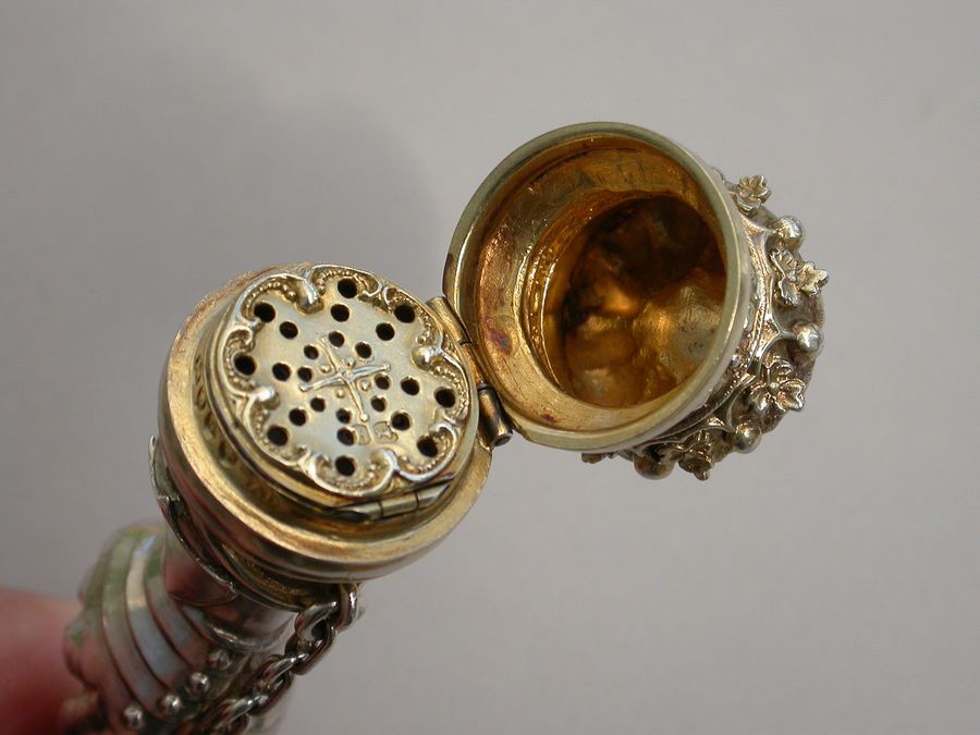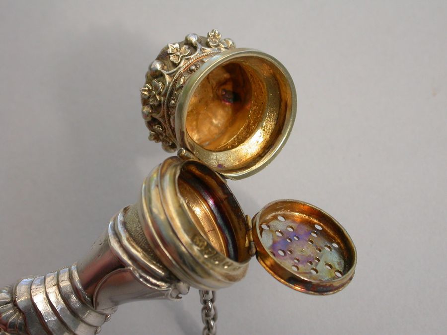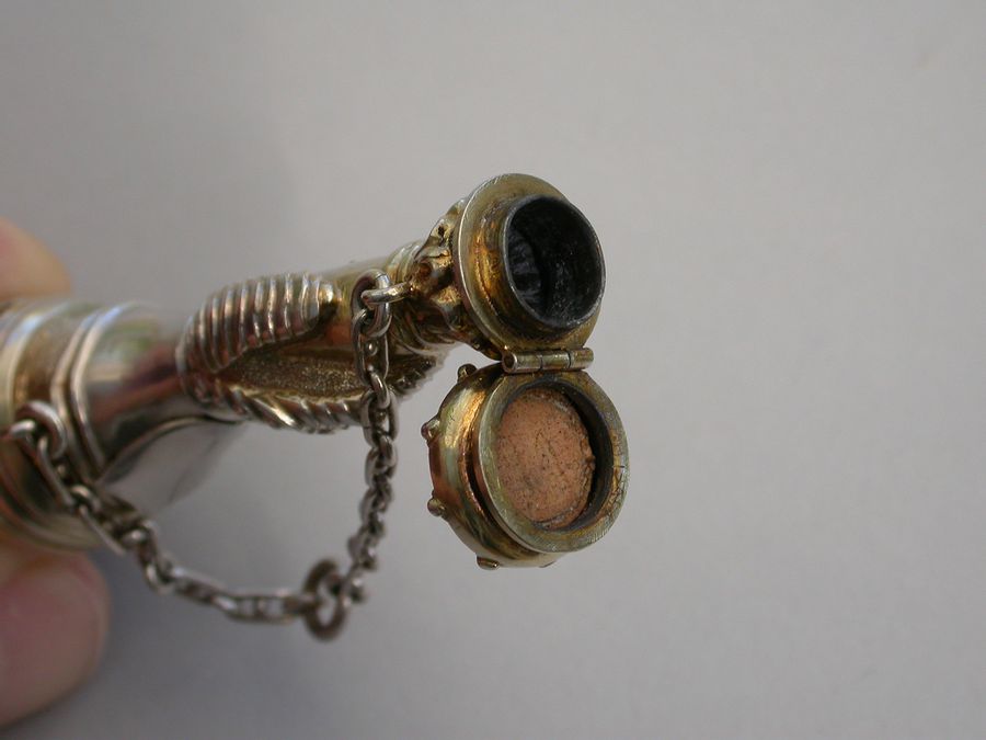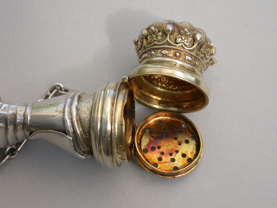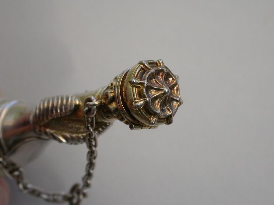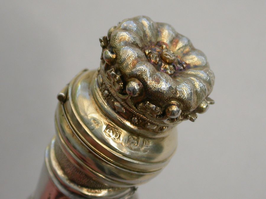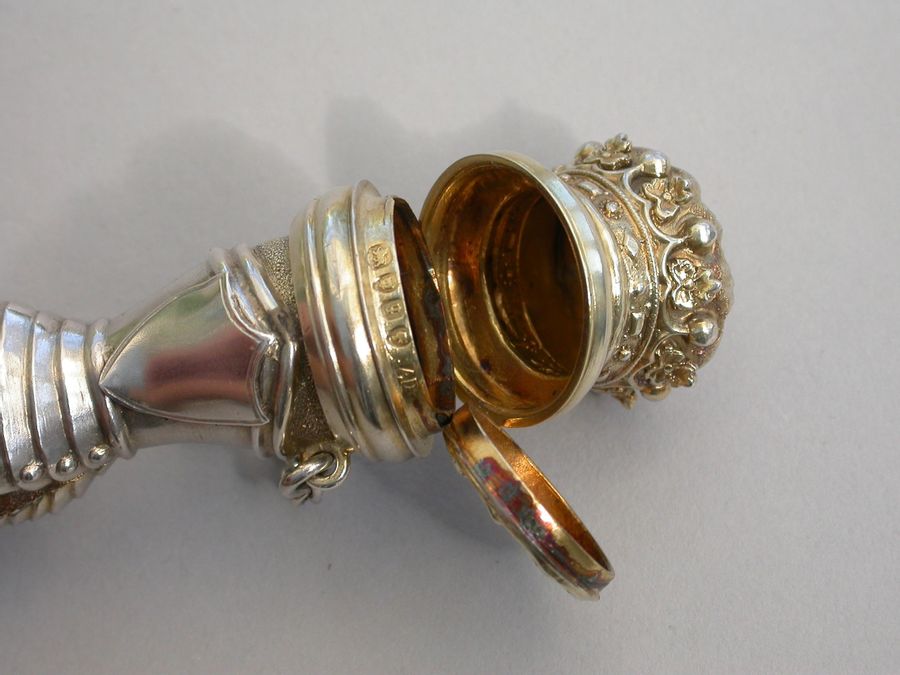 An extremely rare Victorian parcel gilt silver combined Vinaigrette and Scent Bottle formed as a mace held by a hand in an armoured gauntlet with a vacant shield above. One end formed as a Marquis's Coronet opening to reveal a vinaigrette, the grille edged with scrolls and with a central raised cross. The other end with hinged compartment for perfume. Attached suspension ring and chain.