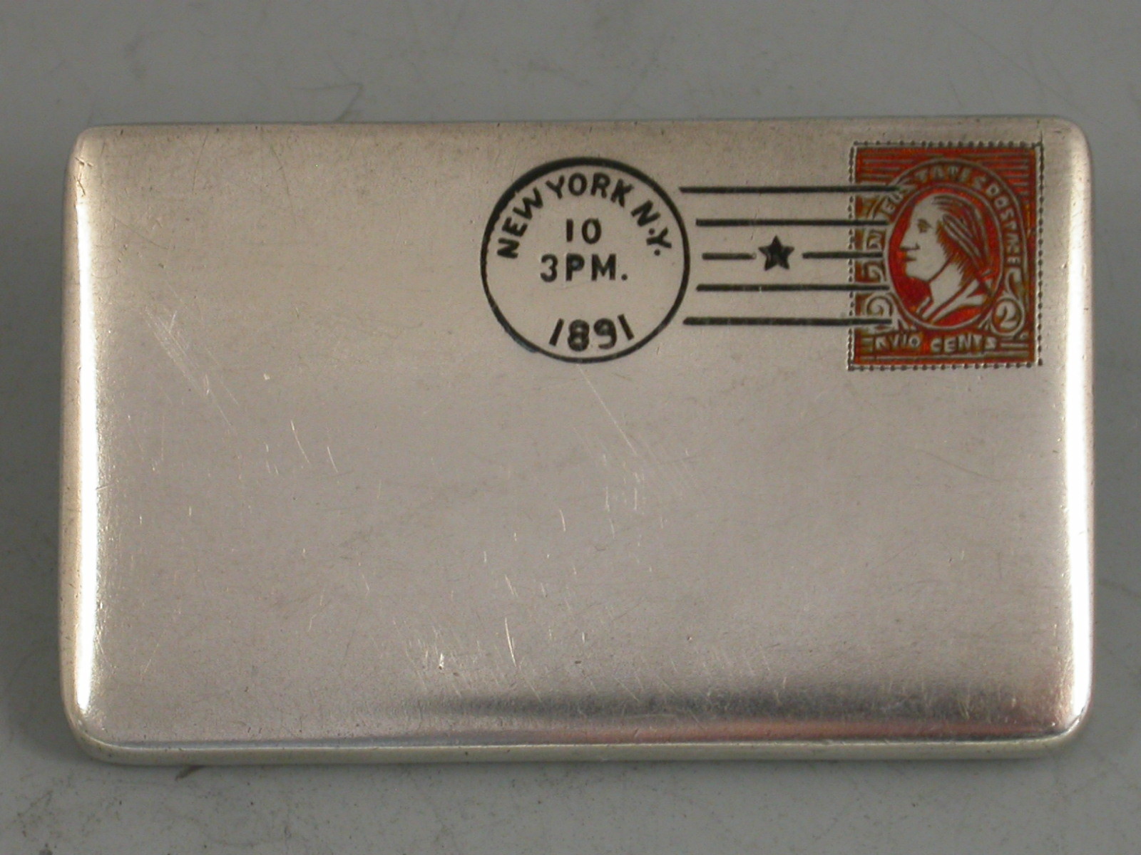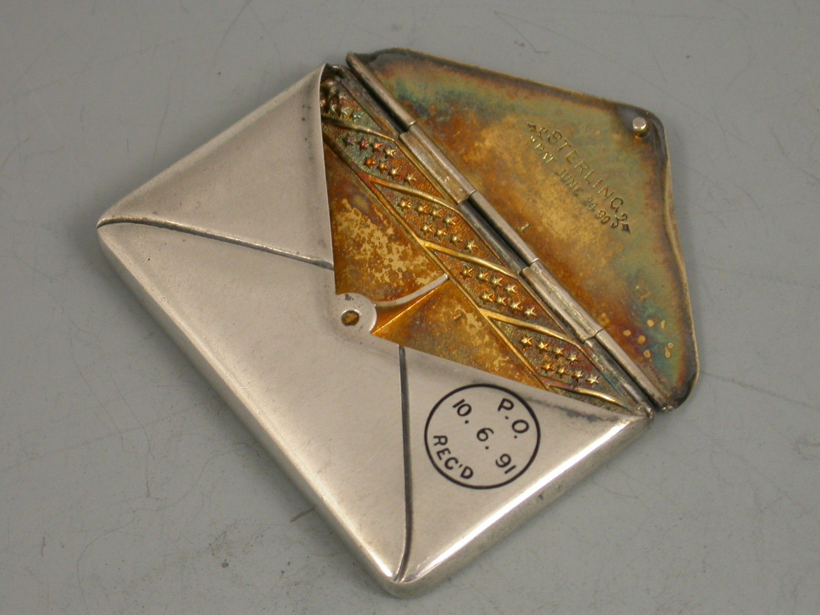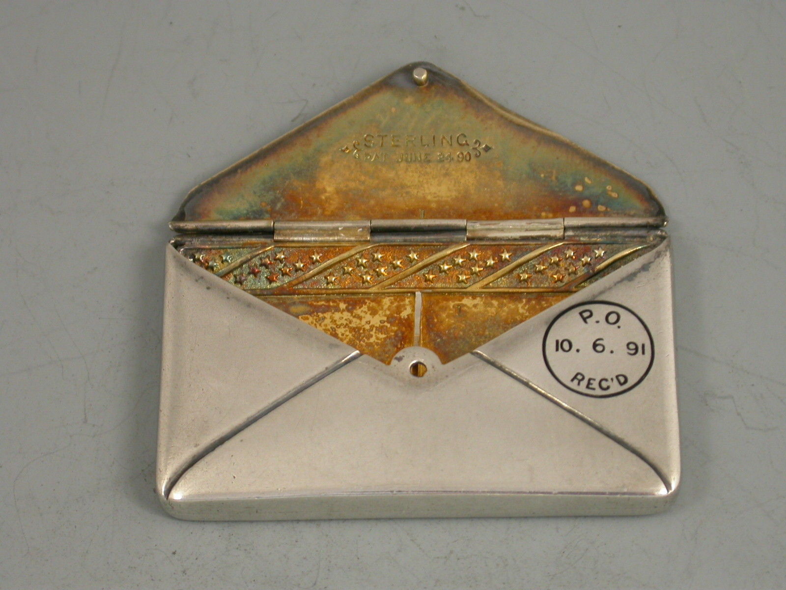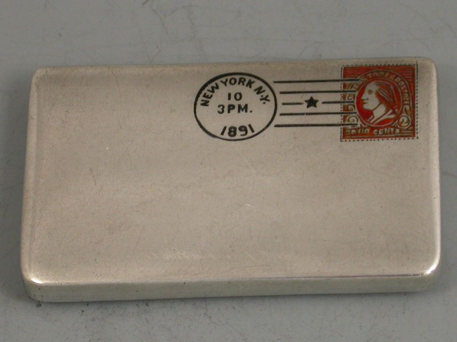 A fine and early 19th century patented American sterling silver and enamel novelty double Stamp Case made in the form of an envelope, the front enamelled with a 2 cent postage stamp and a cancellation mark for New York 1891. The reverse with a received mark for 10/06/91. The gilded interior with two compartments and stamped sterling pat June 24 90.
