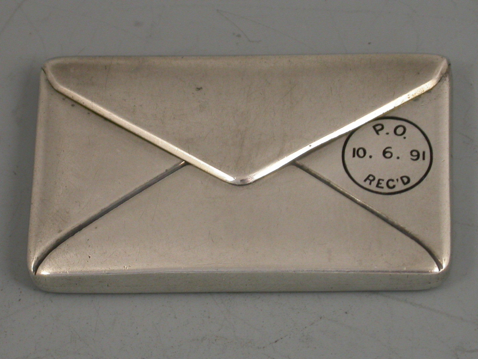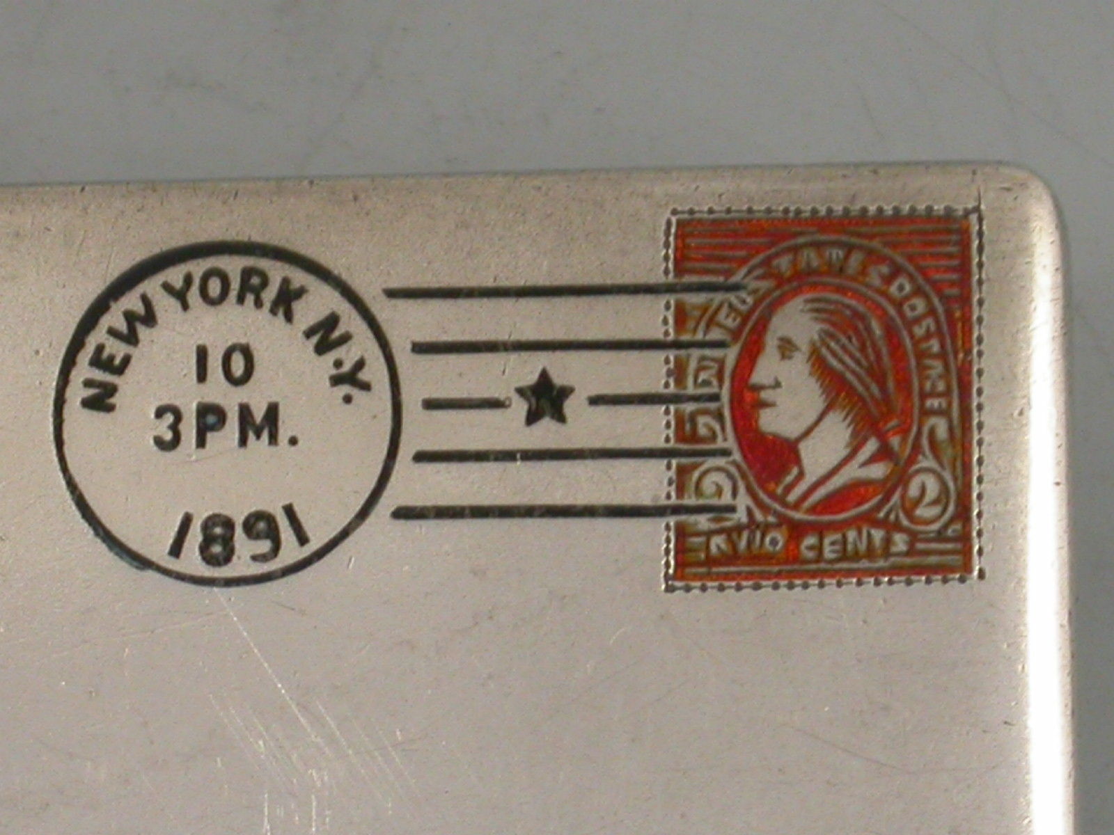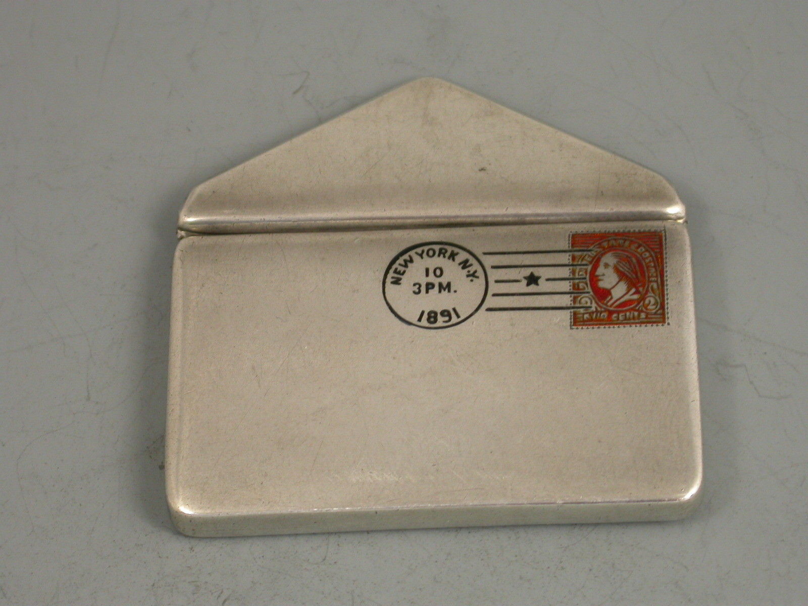 A fine and early 19th century patented American sterling silver and enamel novelty double Stamp Case made in the form of an envelope, the front enamelled with a 2 cent postage stamp and a cancellation mark for New York 1891. The reverse with a received mark for 10/06/91. The gilded interior with two compartments and stamped sterling pat June 24 90.