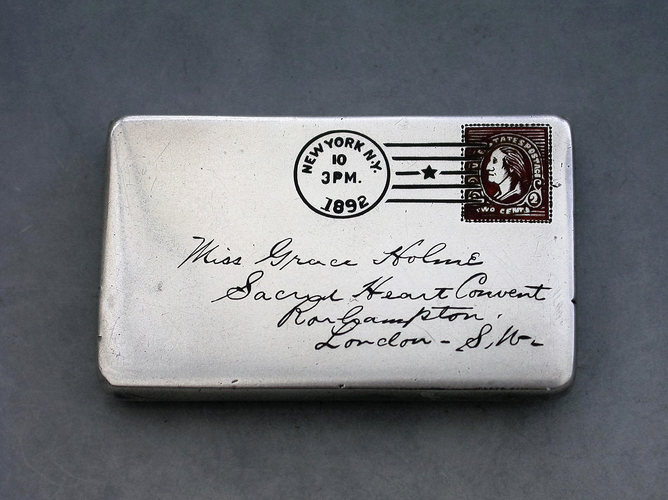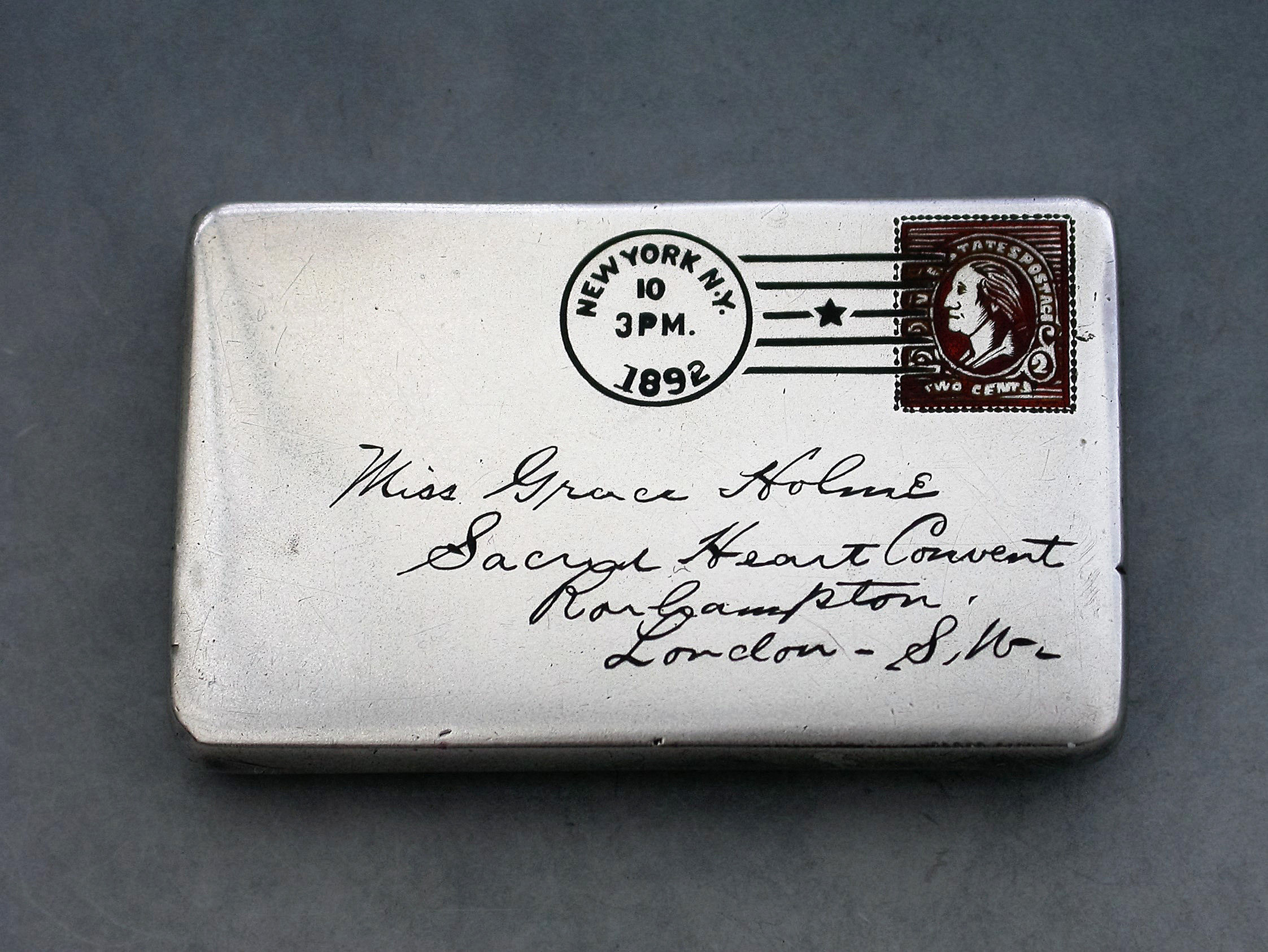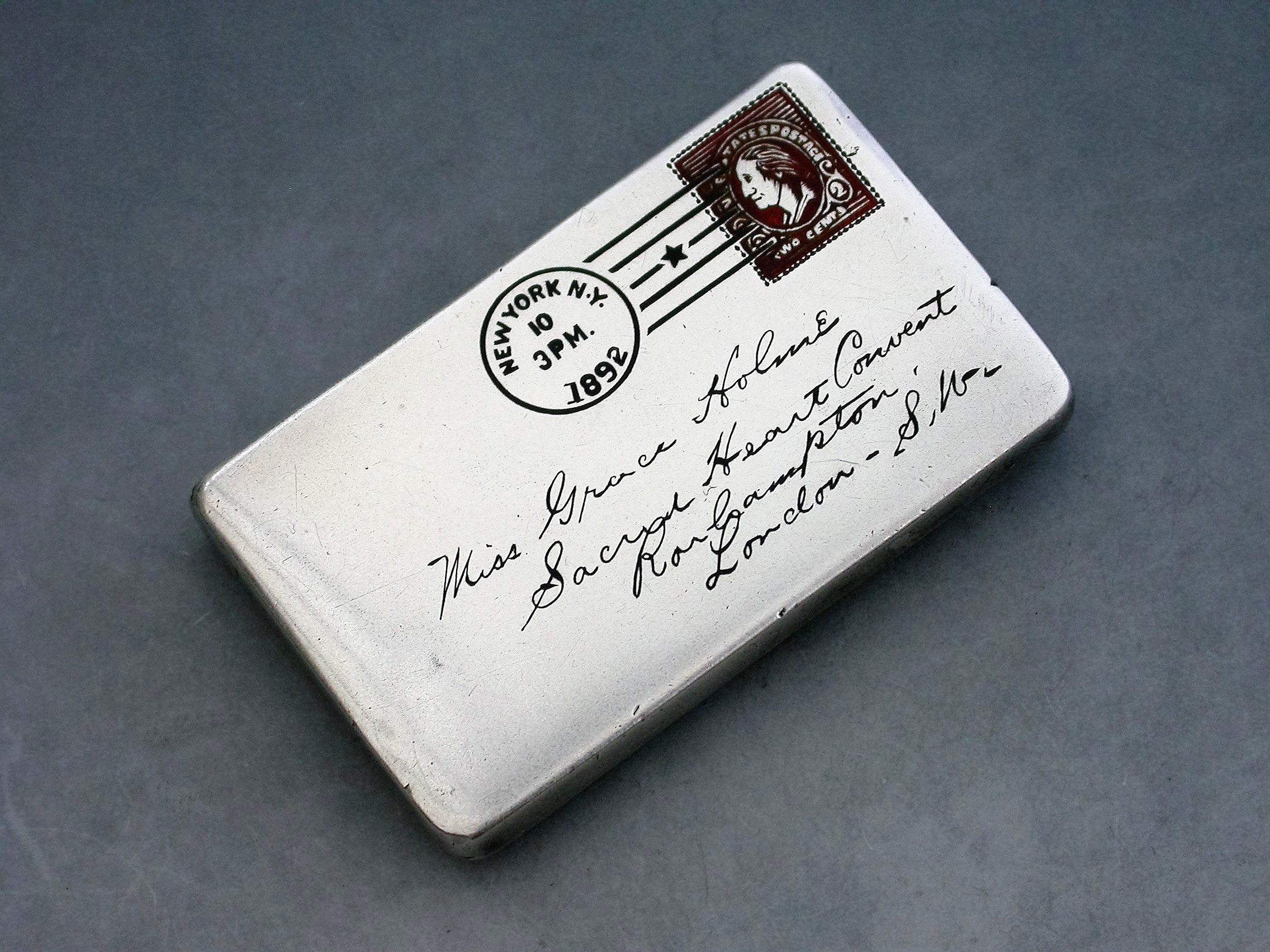A fine quality late 19th century American patented sterling silver double Stamp Case of envelope form, the front enamelled with a red 2 cents stamp, franked ""New York 1892"" and addressed in black enamel to: ""Miss Grace Holme, Sacred Heart Convent, Roehampton, London, S.W"". The reverse with a received mark for 10.12.92. The silver gilt interior stamped: STERLING PAT JUNE 24 90.
