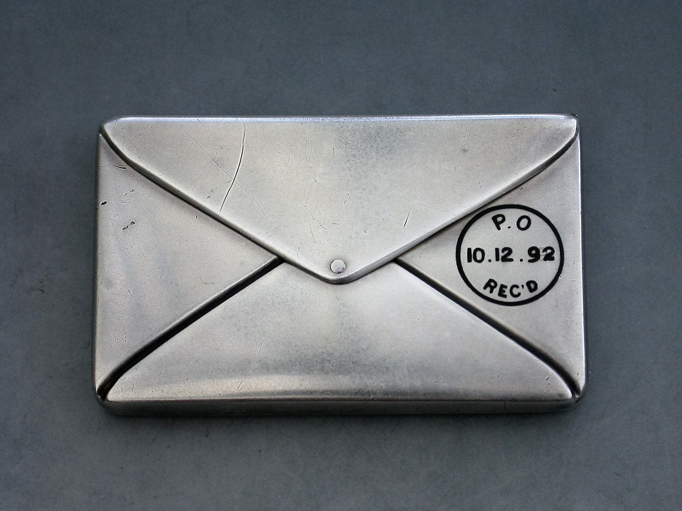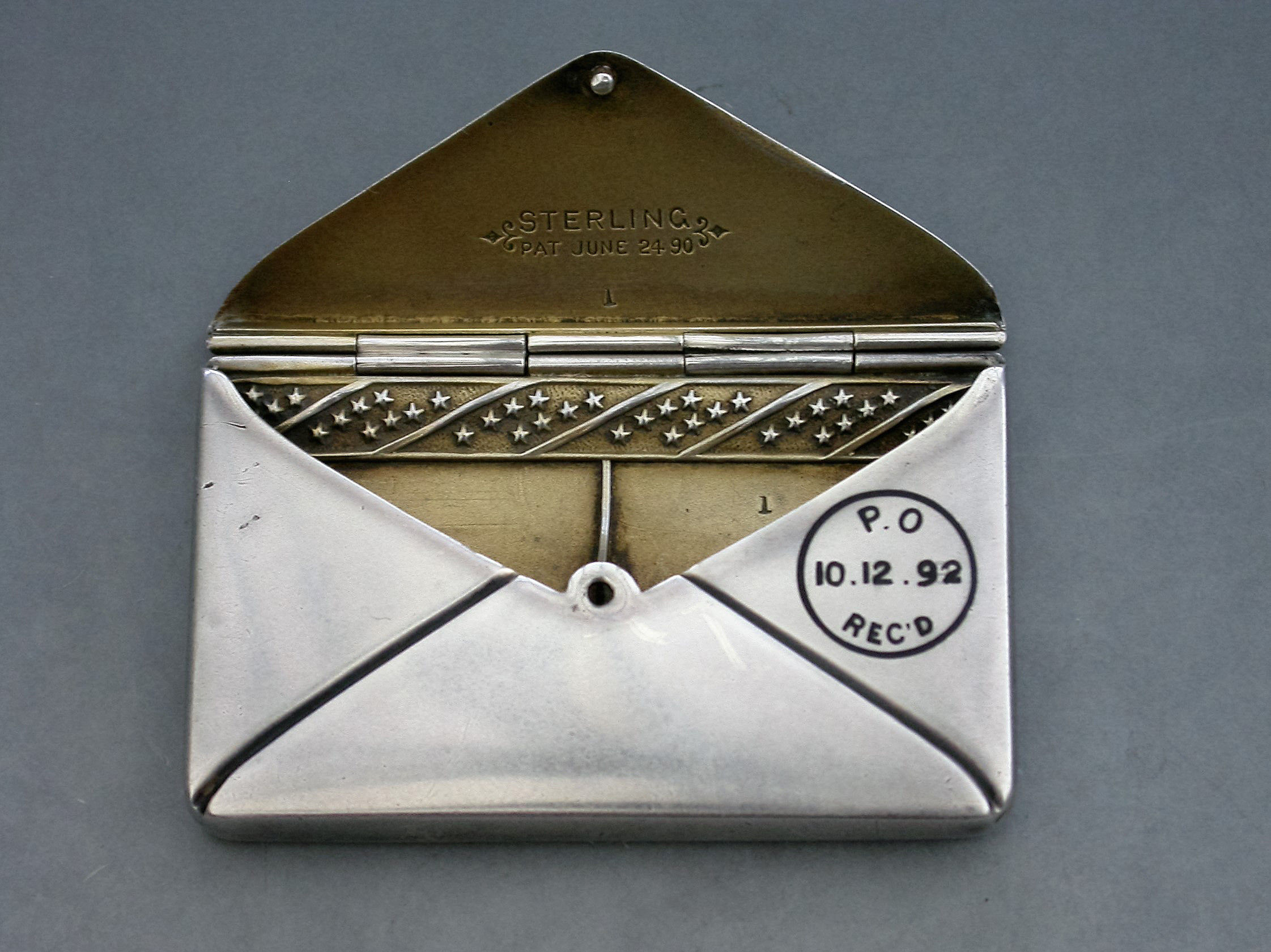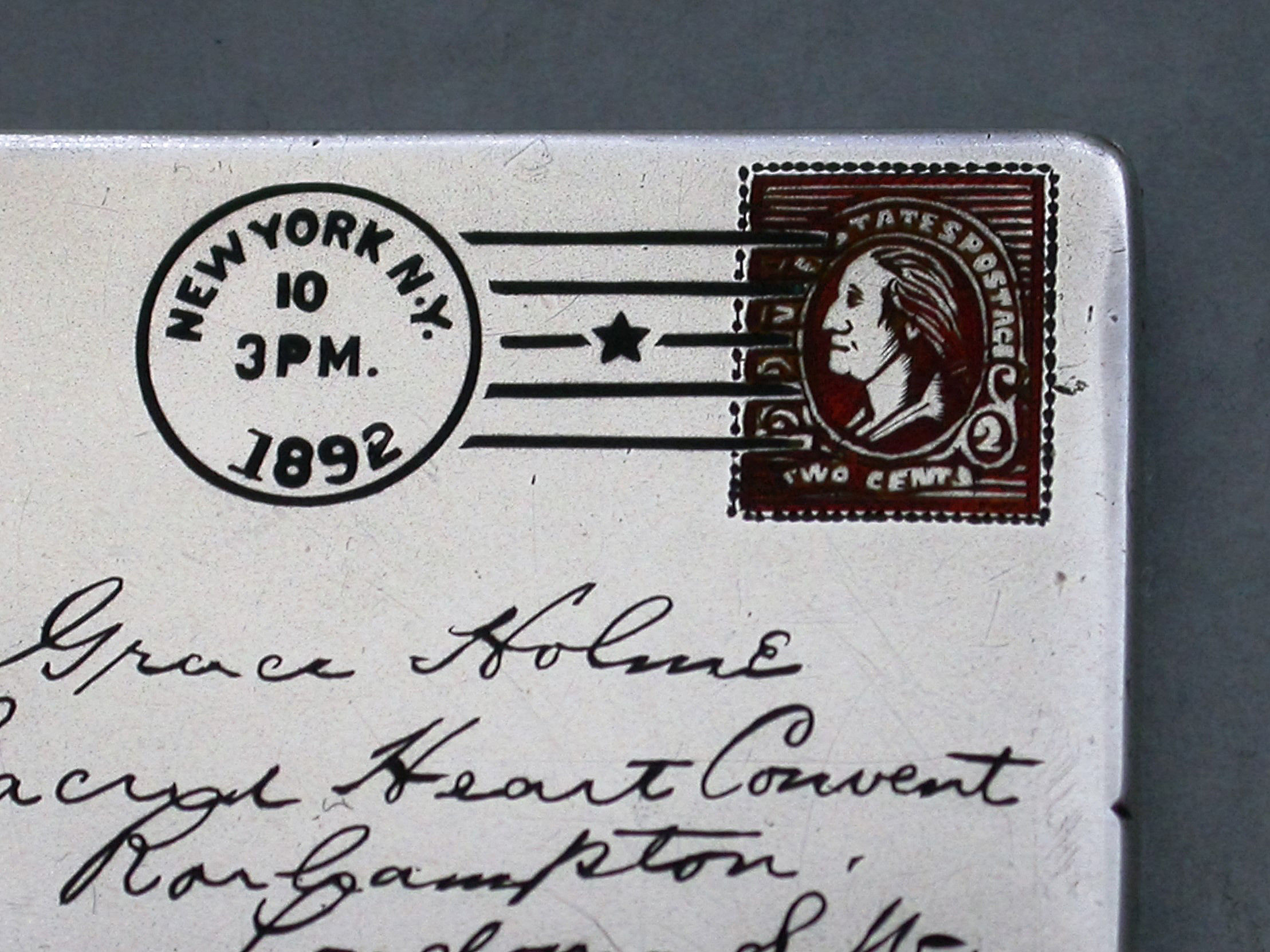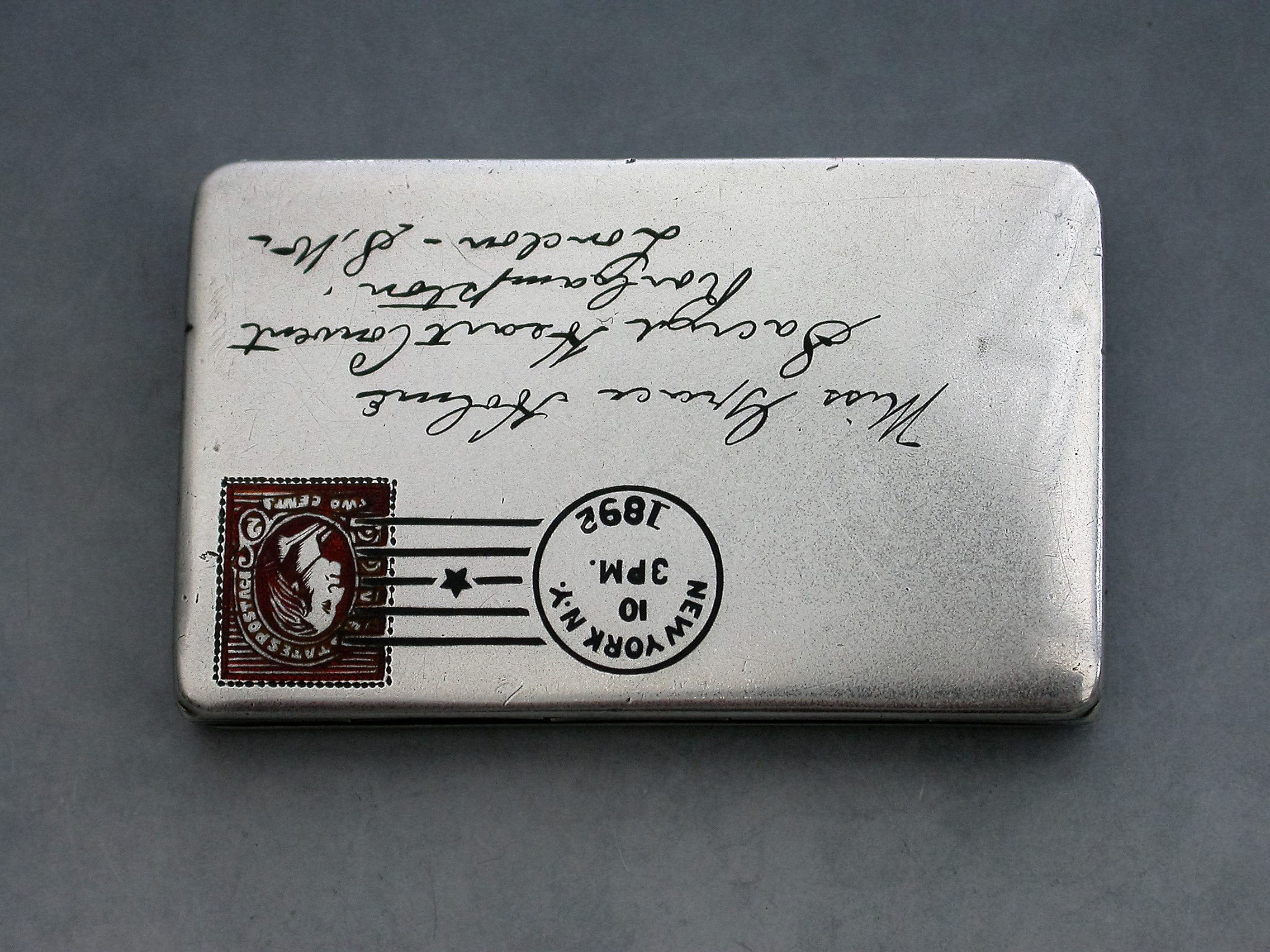A fine quality late 19th century American patented sterling silver double Stamp Case of envelope form, the front enamelled with a red 2 cents stamp, franked ""New York 1892"" and addressed in black enamel to: ""Miss Grace Holme, Sacred Heart Convent, Roehampton, London, S.W"". The reverse with a received mark for 10.12.92. The silver gilt interior stamped: STERLING PAT JUNE 24 90.