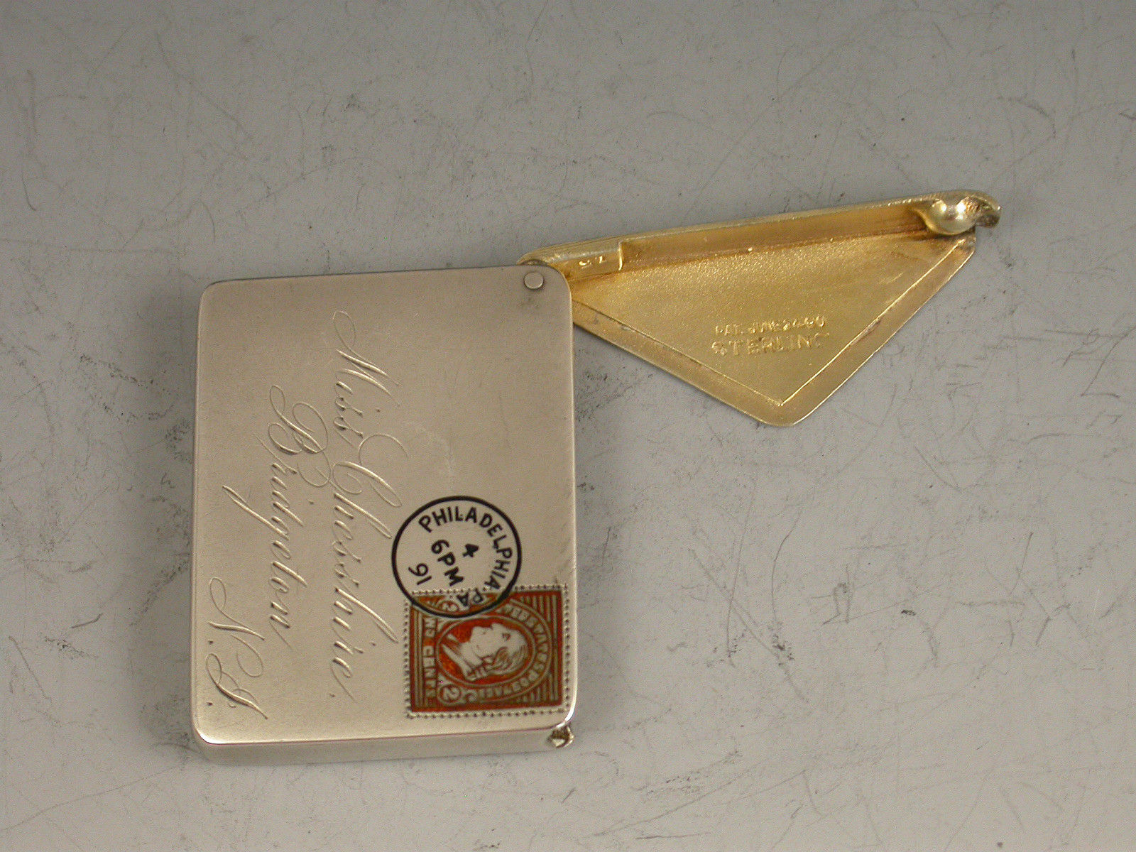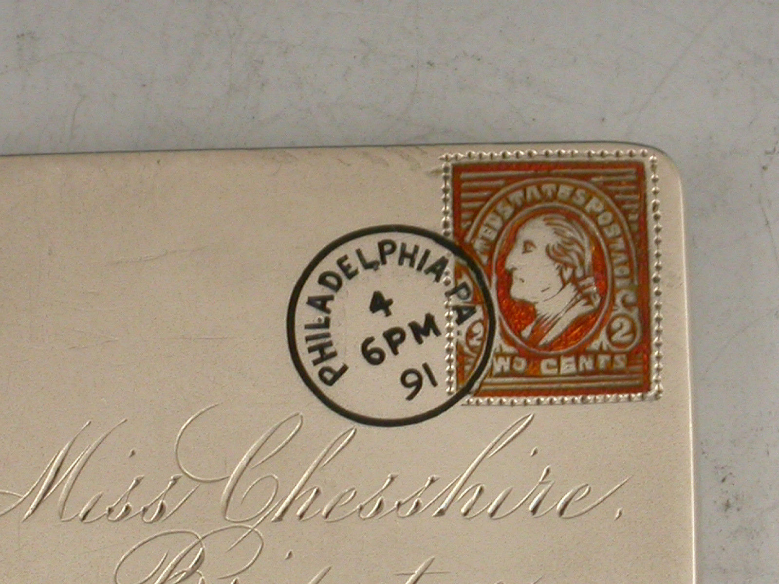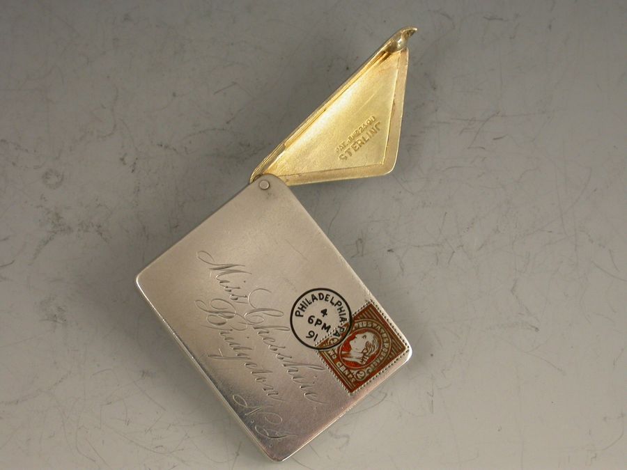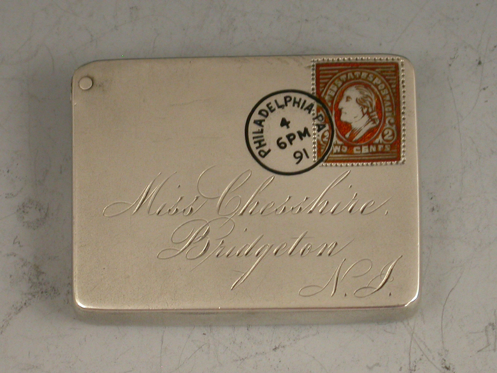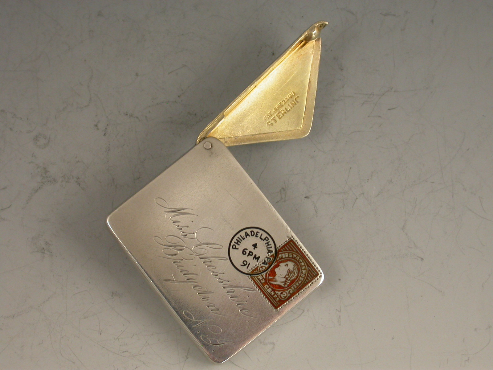 A very fine late 19th century patented American sterling silver and enamel novelty Stamp Case made in the form of an envelope. The front enamelled with a 2 cent stamp and a Philadelphia post mark for 1891, the reverse with a received mark for 4.1.91. The cover engraved with a name and address for Miss Chesshire, Bridgeton, N.J. The silver gilt interior stamped: Sterling and with patent mark for June 24 90.