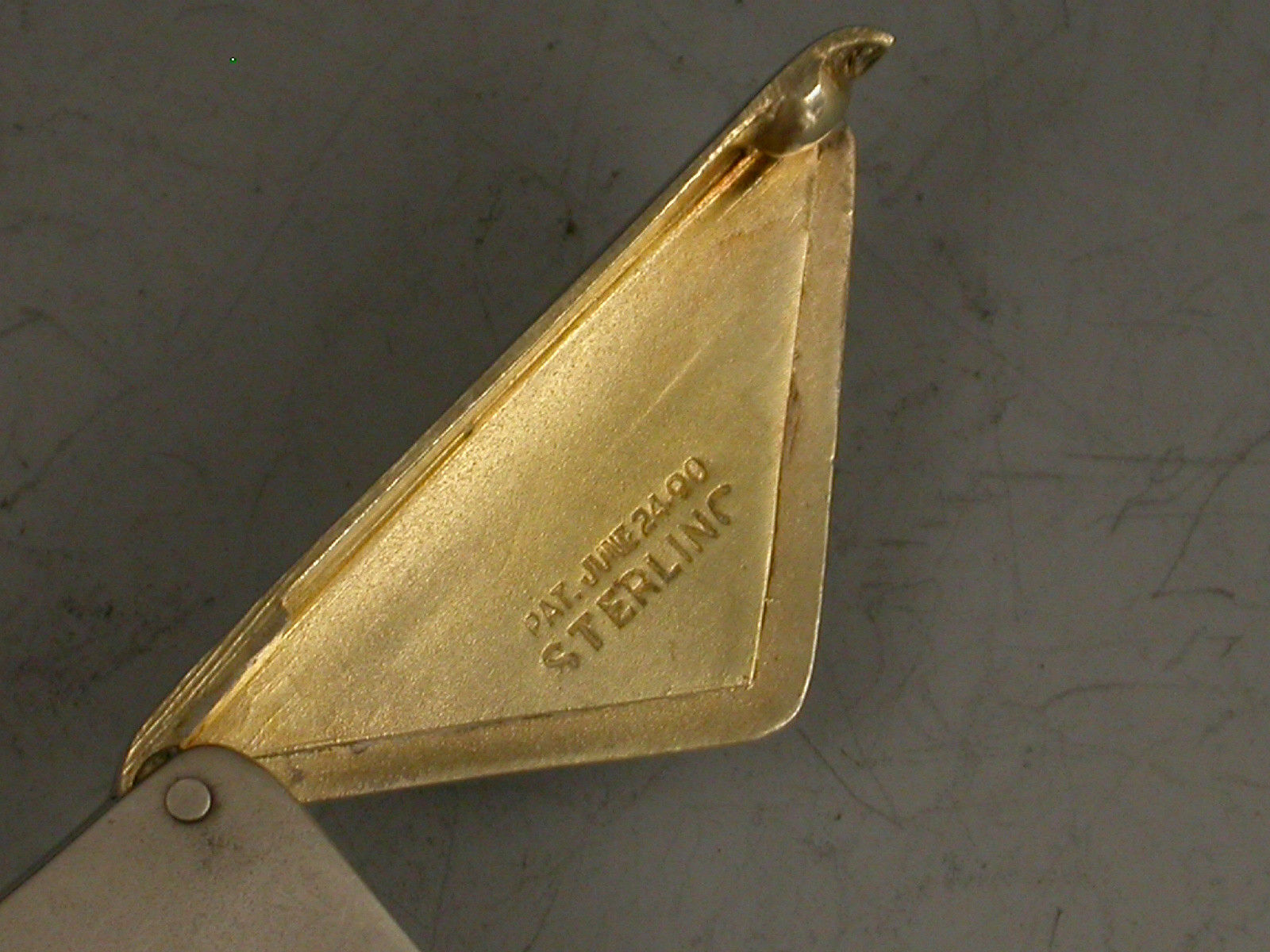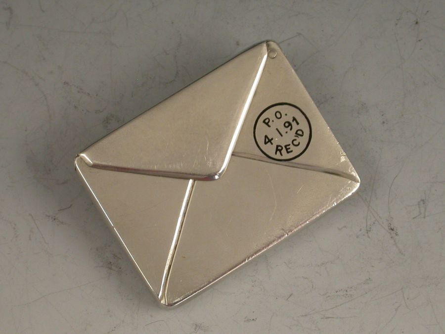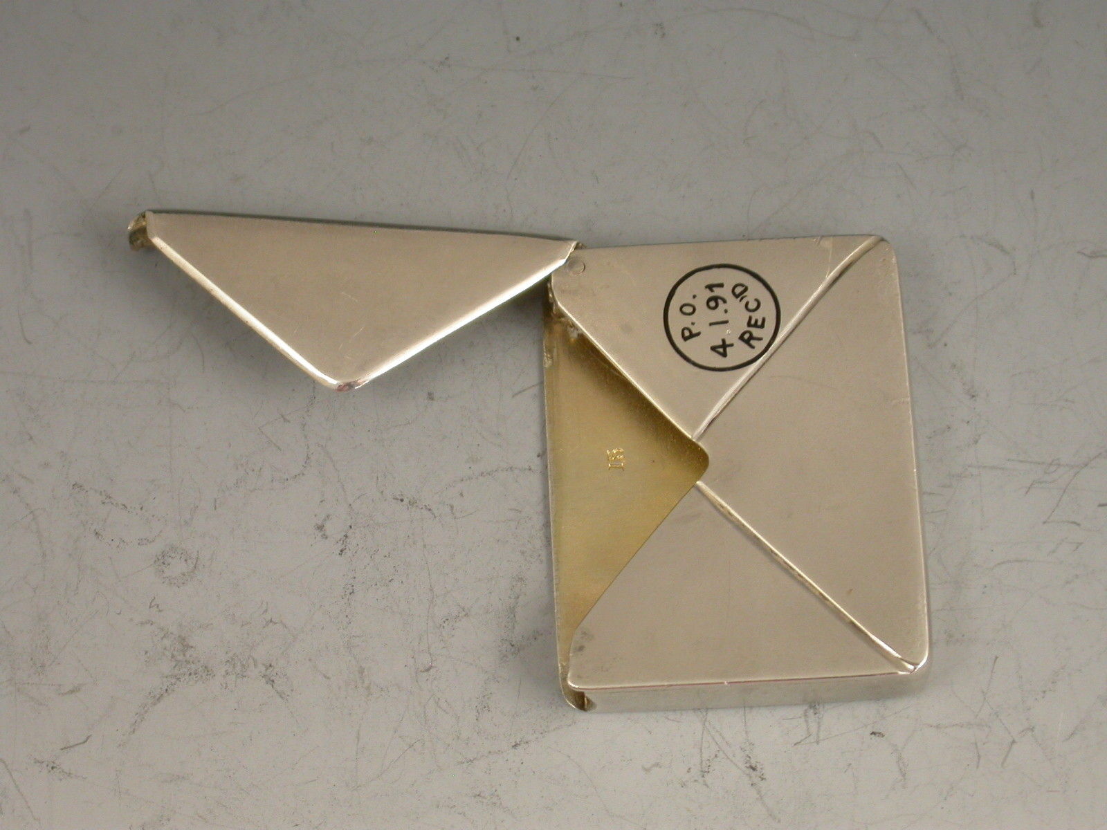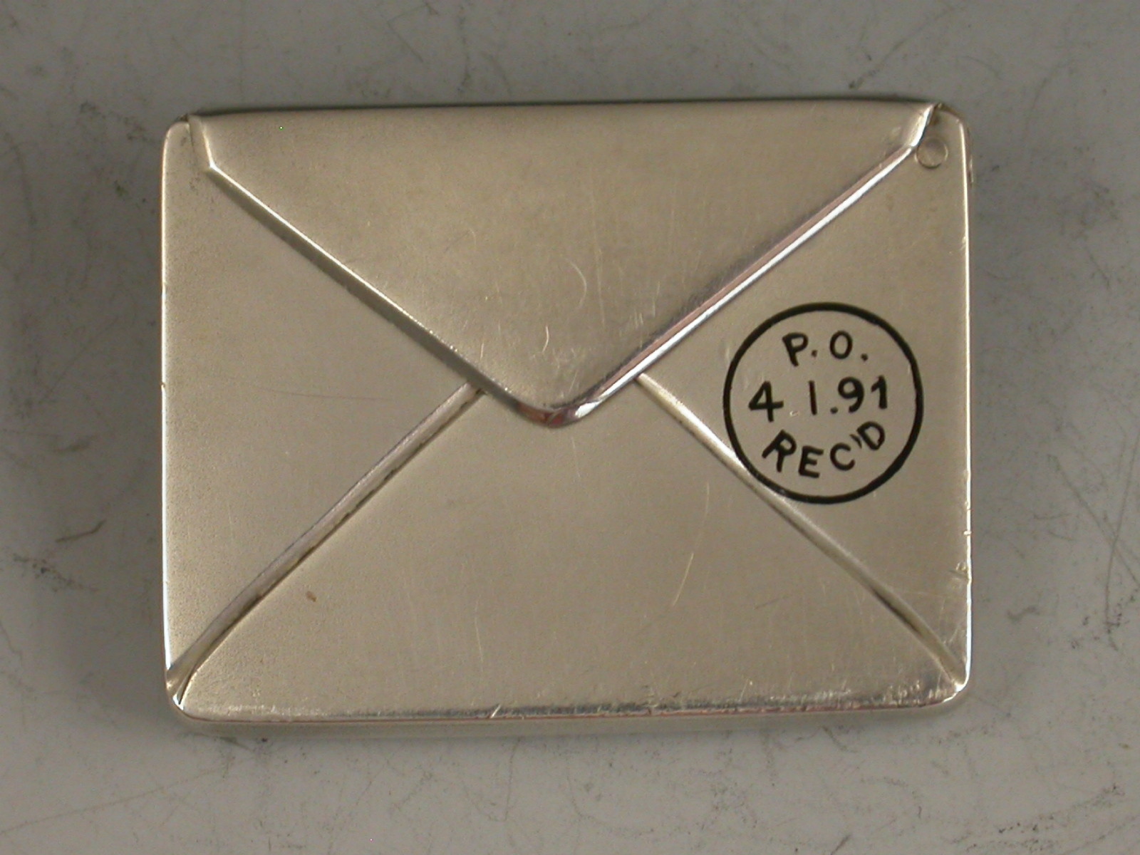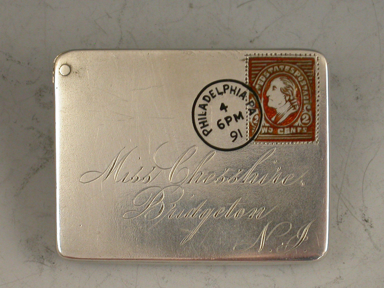 A very fine late 19th century patented American sterling silver and enamel novelty Stamp Case made in the form of an envelope. The front enamelled with a 2 cent stamp and a Philadelphia post mark for 1891, the reverse with a received mark for 4.1.91. The cover engraved with a name and address for Miss Chesshire, Bridgeton, N.J. The silver gilt interior stamped: Sterling and with patent mark for June 24 90.