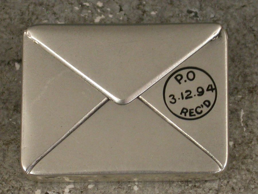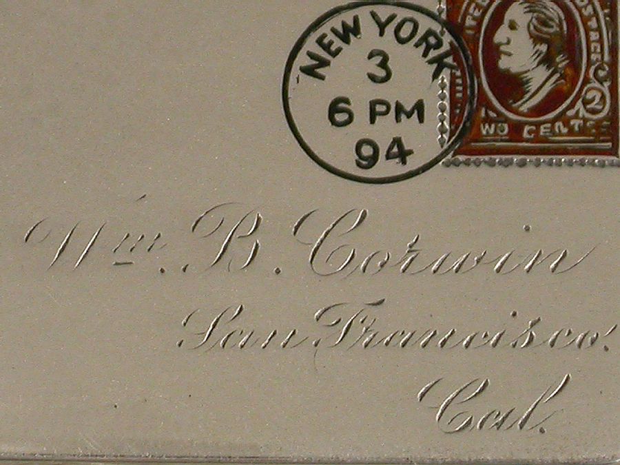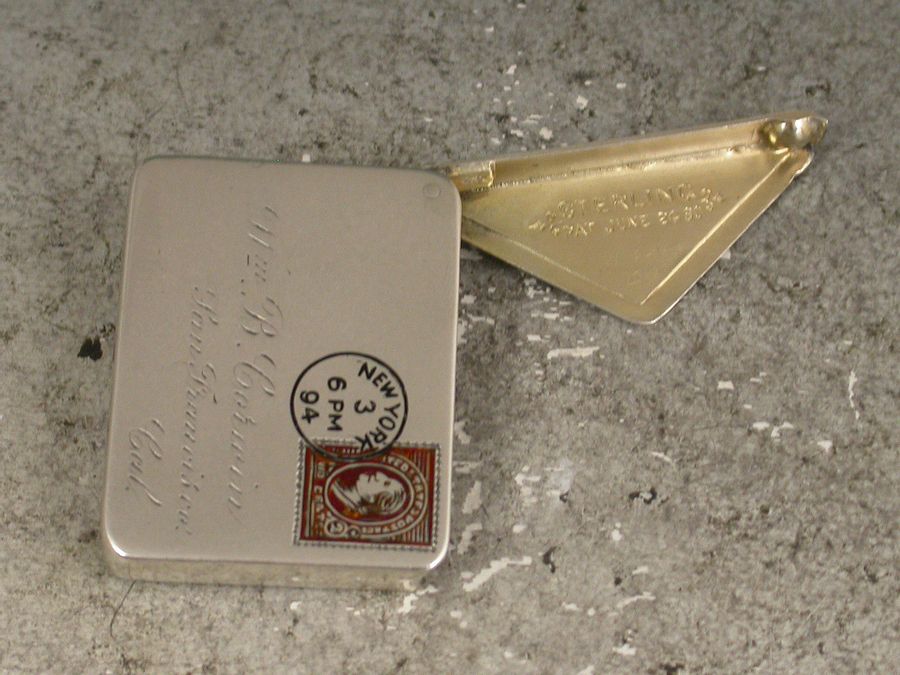 A very fine late 19th century patented American sterling silver and enamel novelty Stamp Case made in the form of an Envelope. The front enamelled with a 2 cent stamp and a New York cancellation mark for 1894, the reverse enamelled with a received mark for 3.12.94, the cover engraved with a name and address for Miss B. Corwin, San Francisco, Cal. The silver gilt interior stamped: Sterling and the Patent mark for June 24 90.