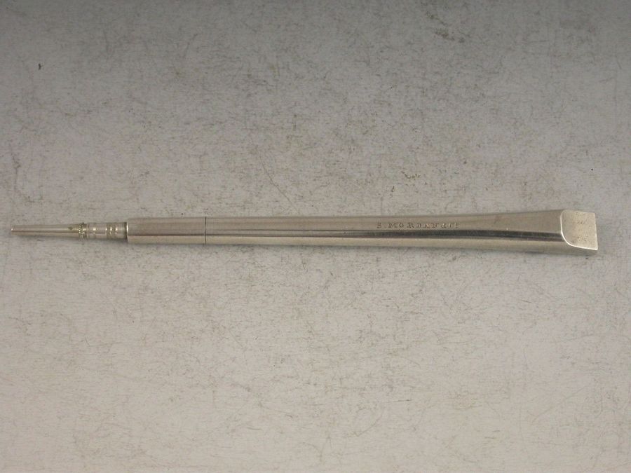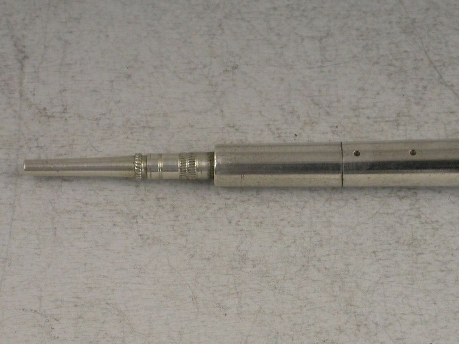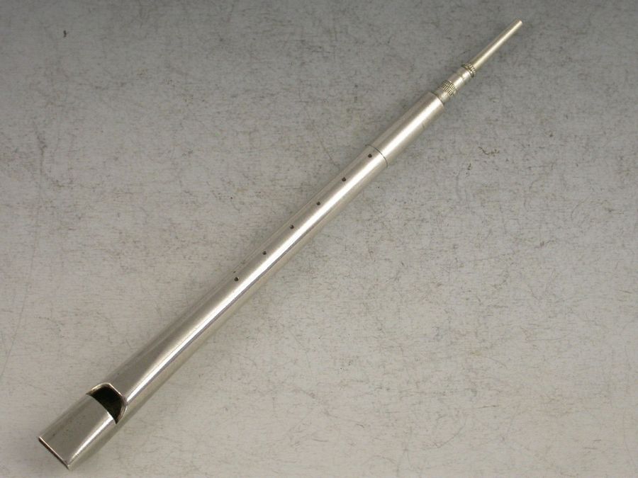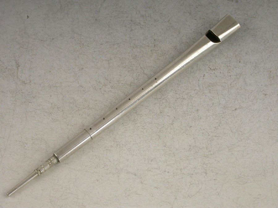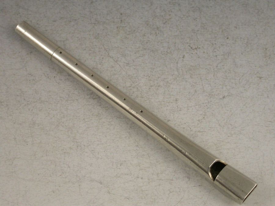 A rare Victorian novelty silver Propelling Pencil in the form of a Penny or Tin Whistle. Engraved with six dots to simulate the holes. Twist action to propel the pencil.