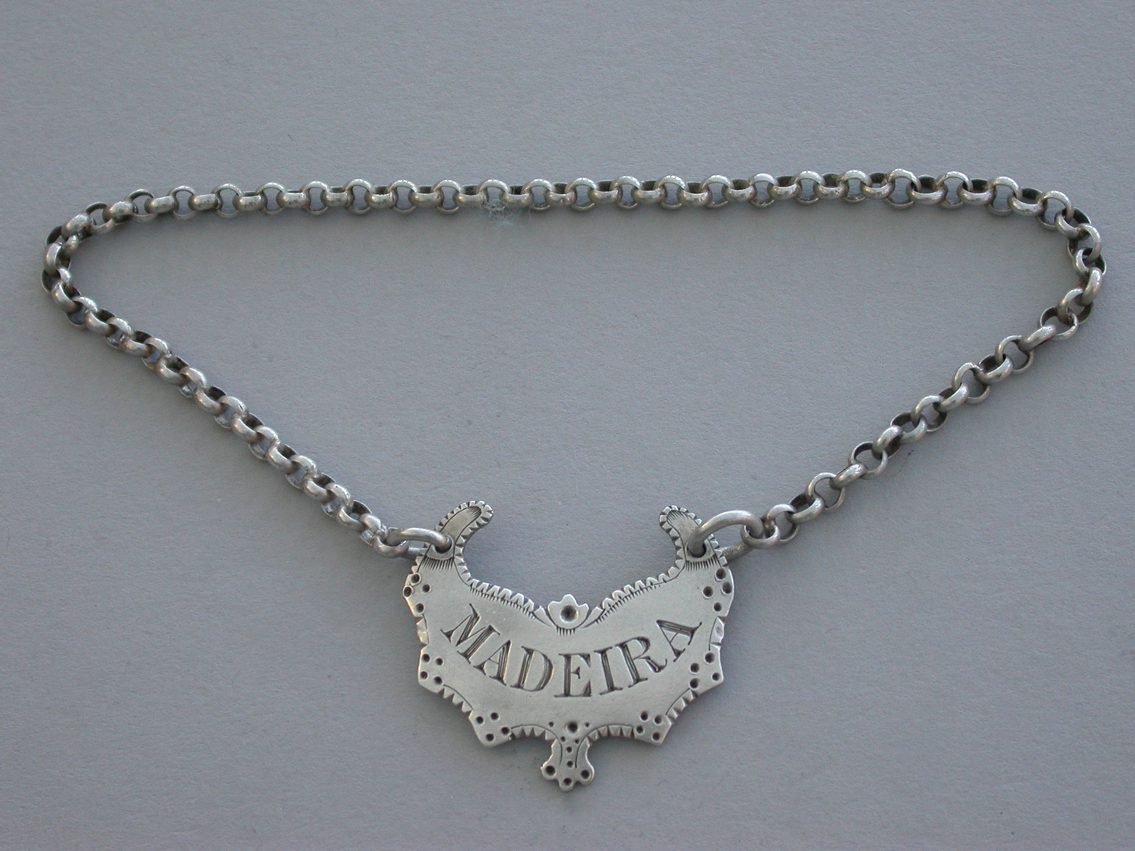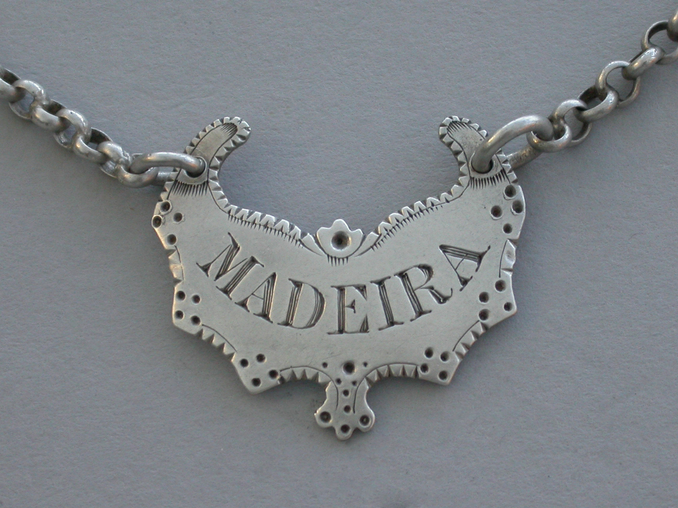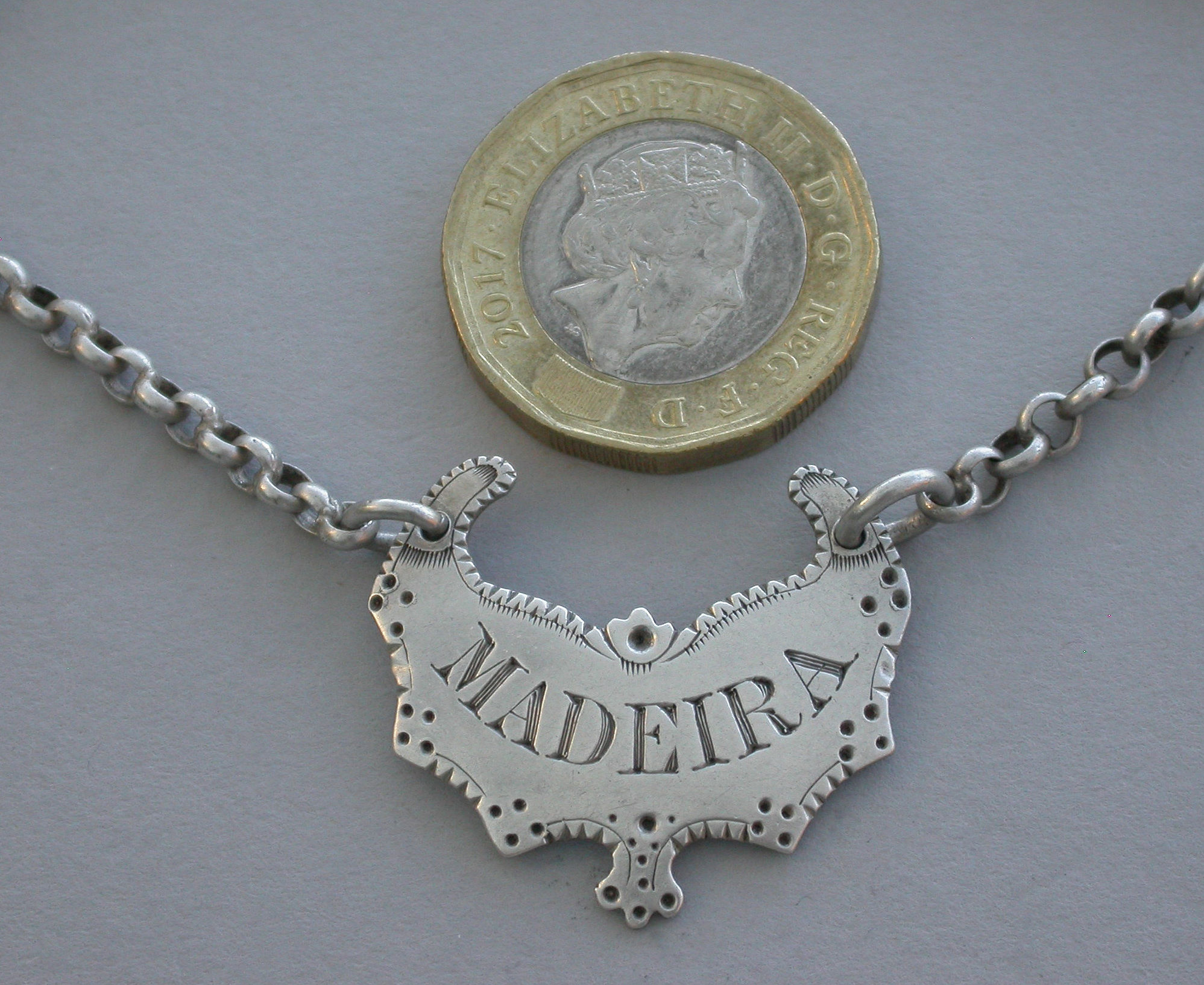 A rare Victorian Provincial silver Wine Label of small 'Boudoir' size and shaped crescent or goblet form with bright-cut and prick-dot engraved border, incised for Madeira.