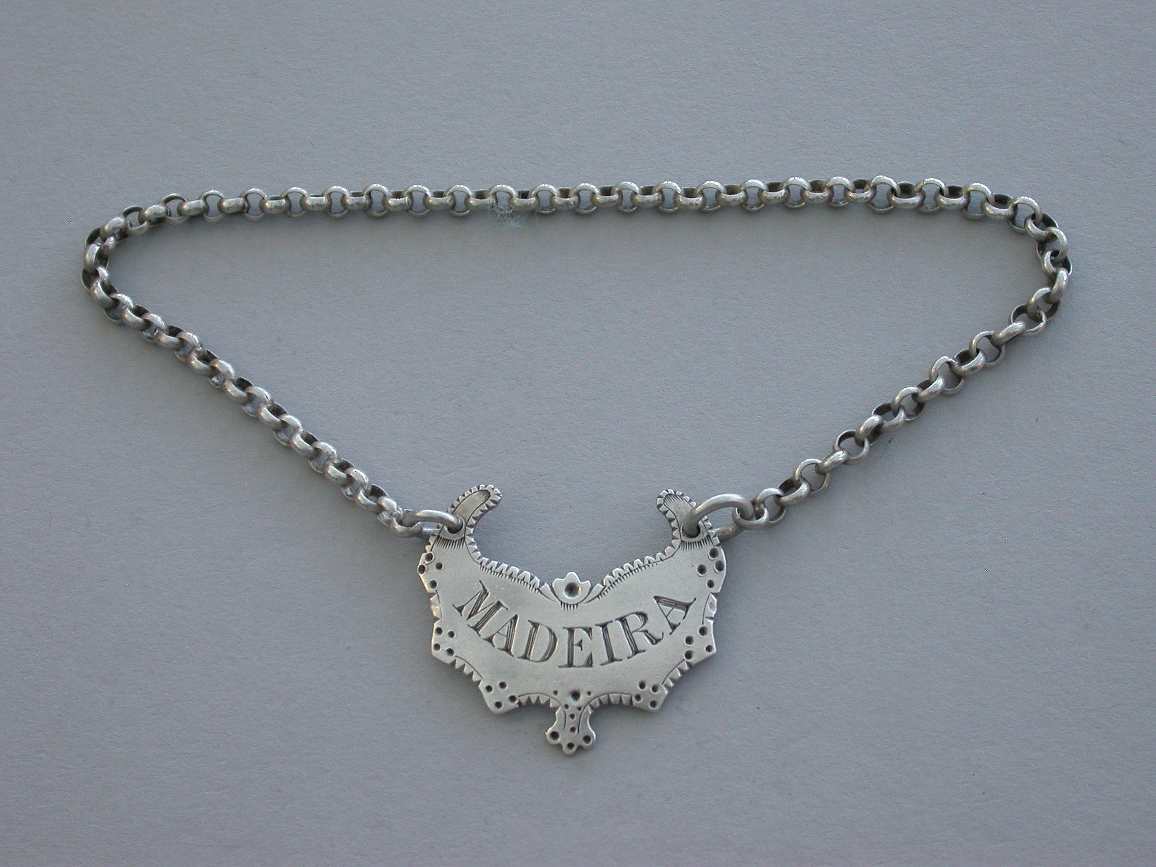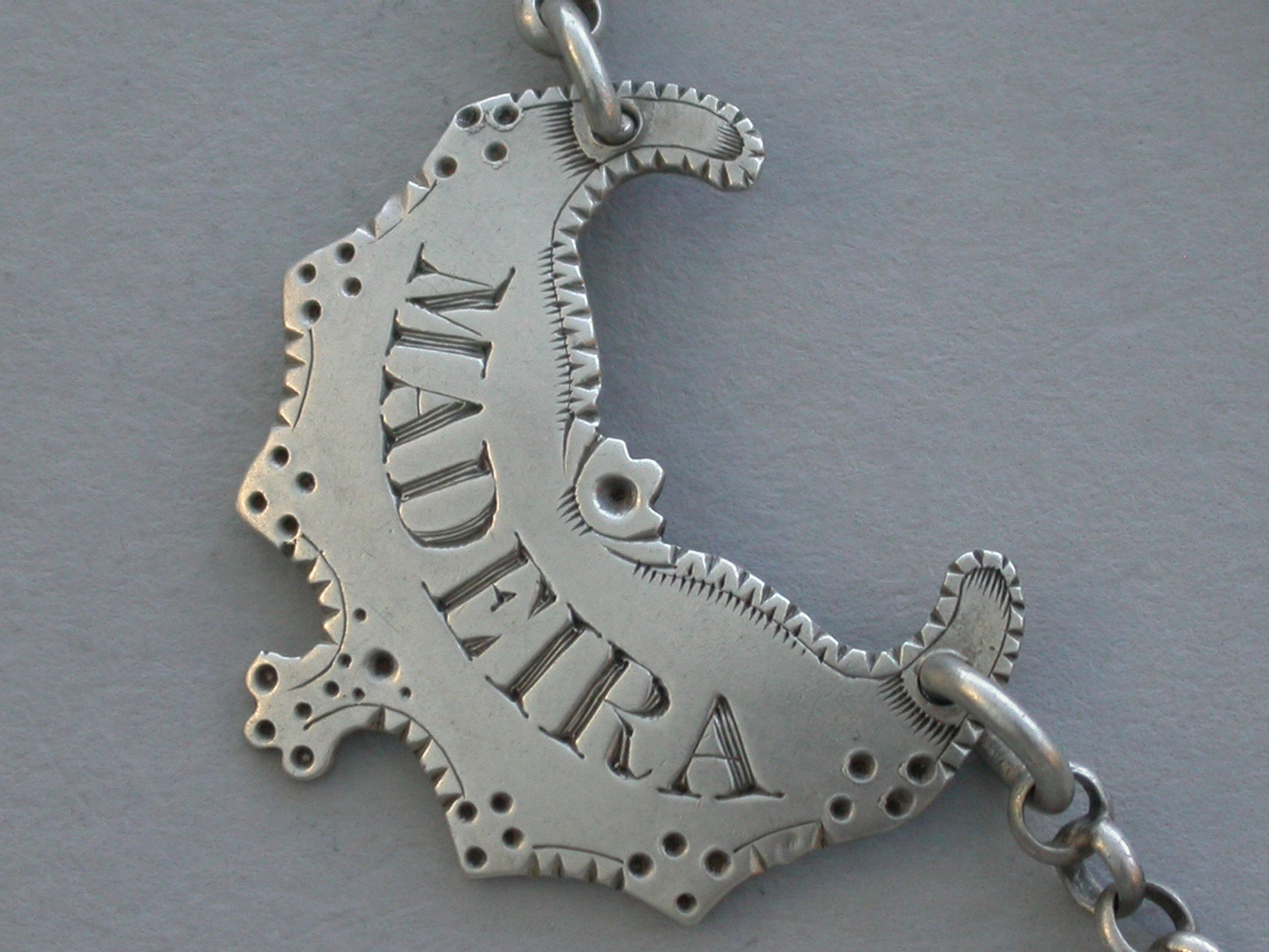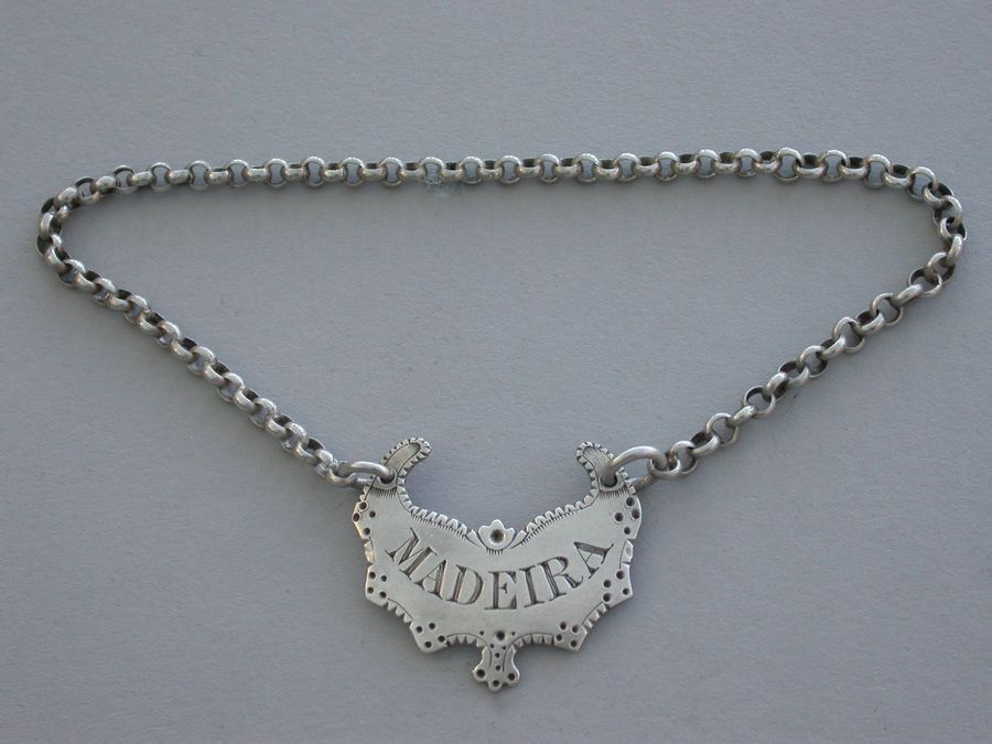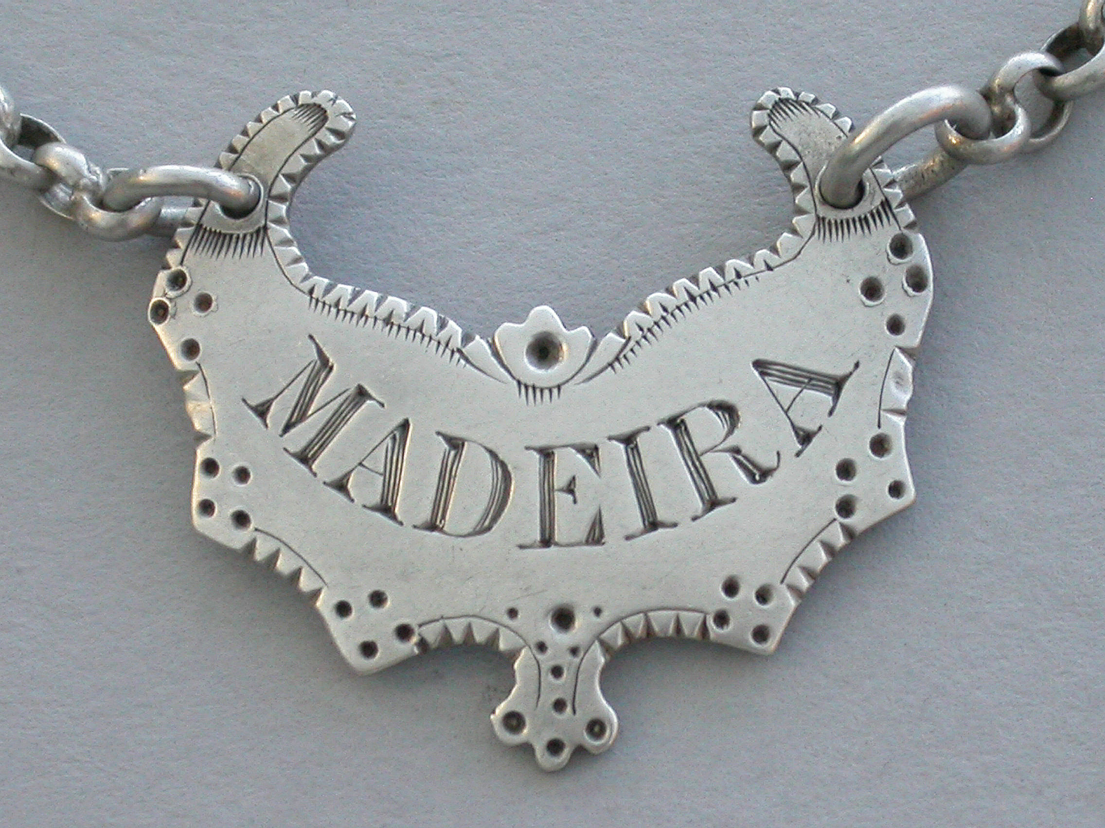 A rare Victorian Provincial silver Wine Label of small 'Boudoir' size and shaped crescent or goblet form with bright-cut and prick-dot engraved border, incised for Madeira.