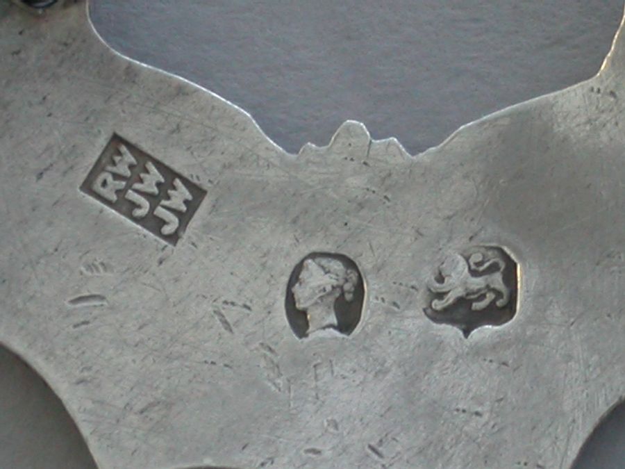 By Robert Williams & Sons, (Robert, James and Josiah Williams) of Bristol (Exeter), c1850. The partnership mark not previously recorded on a Wine Label.