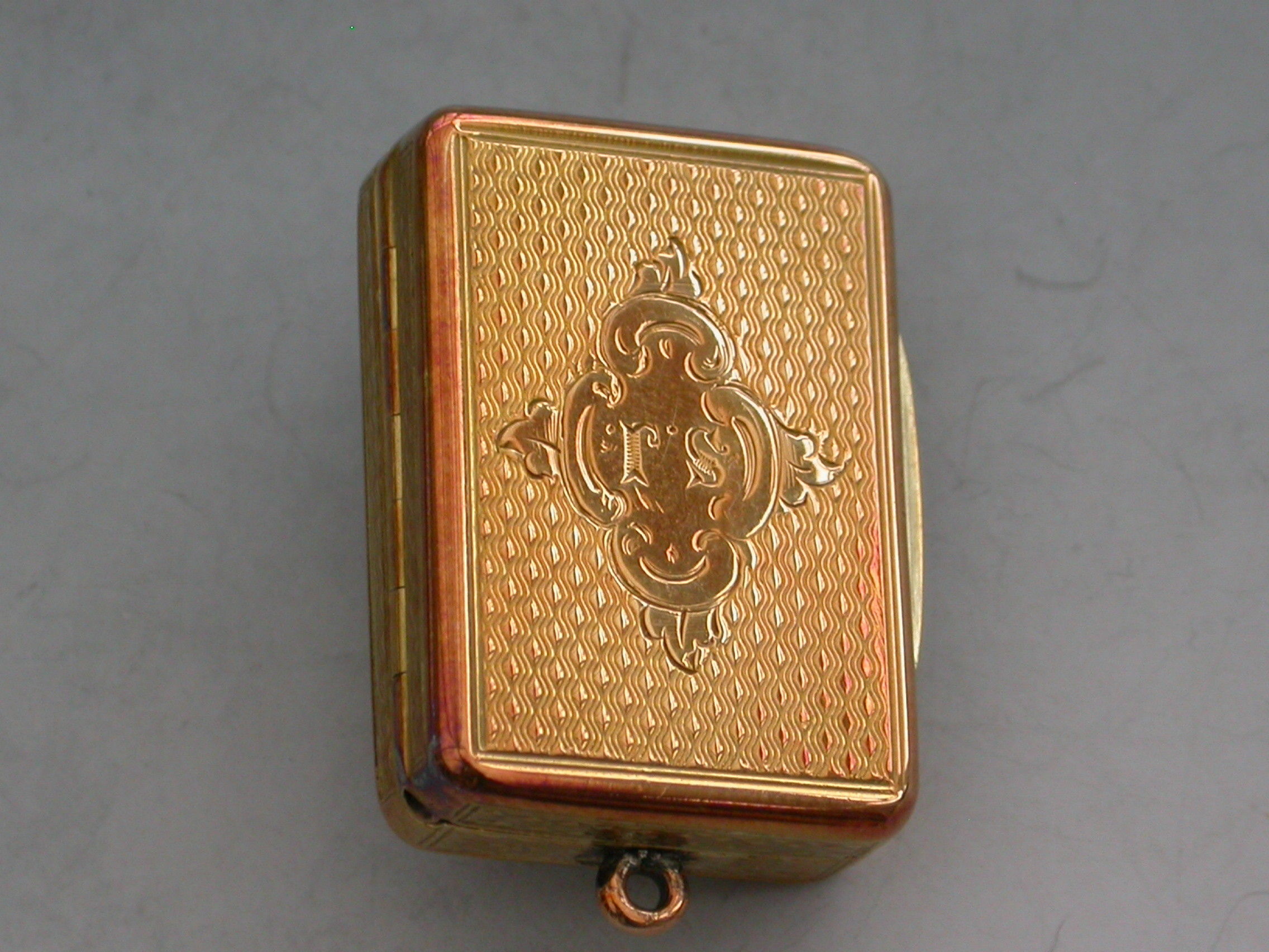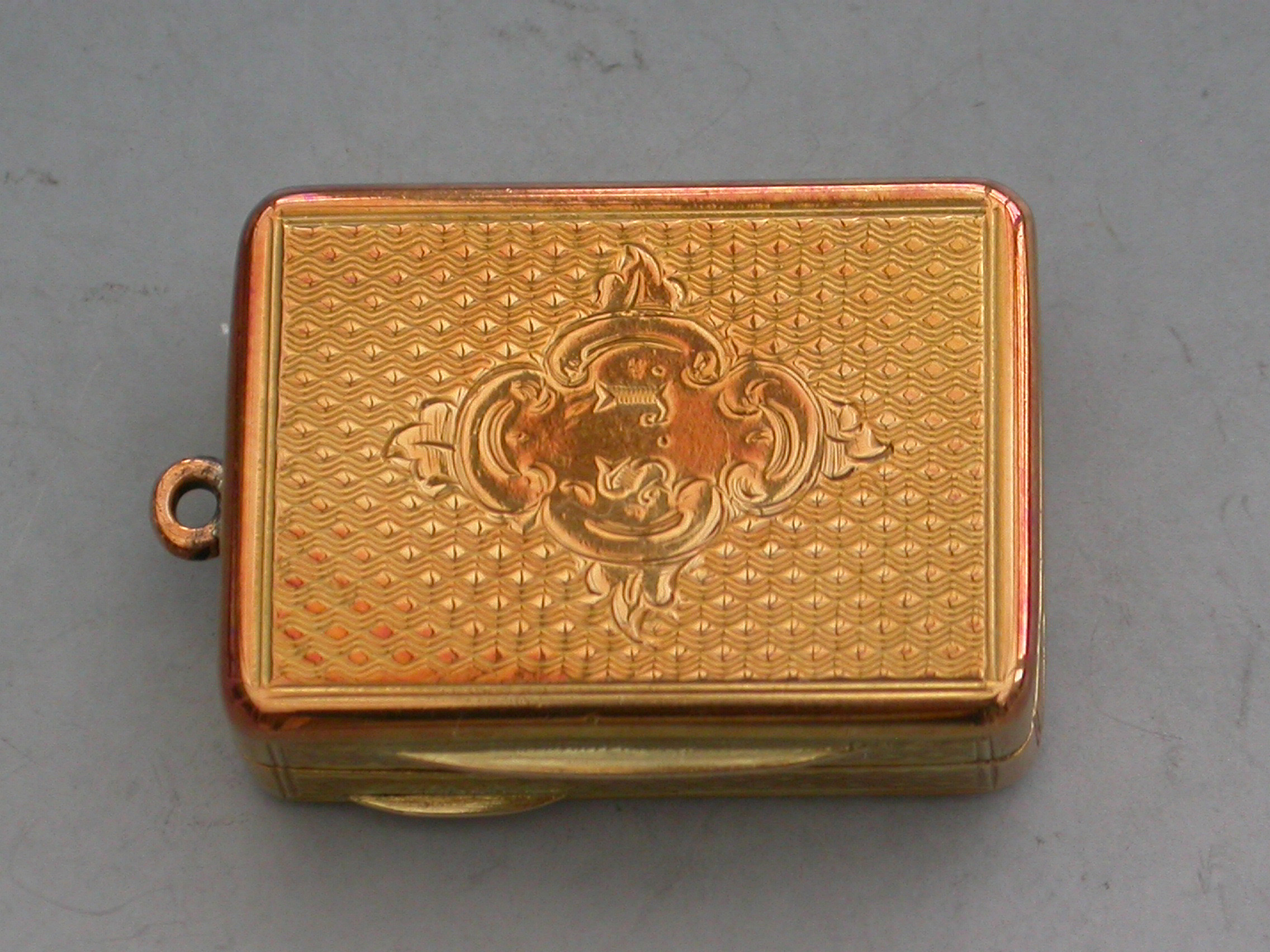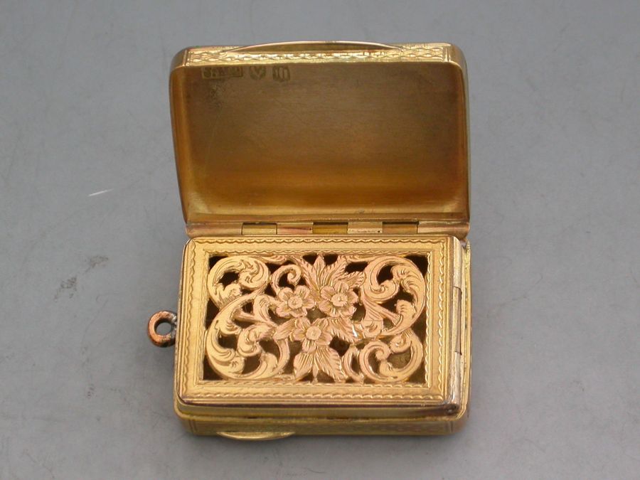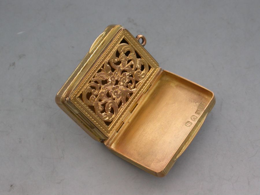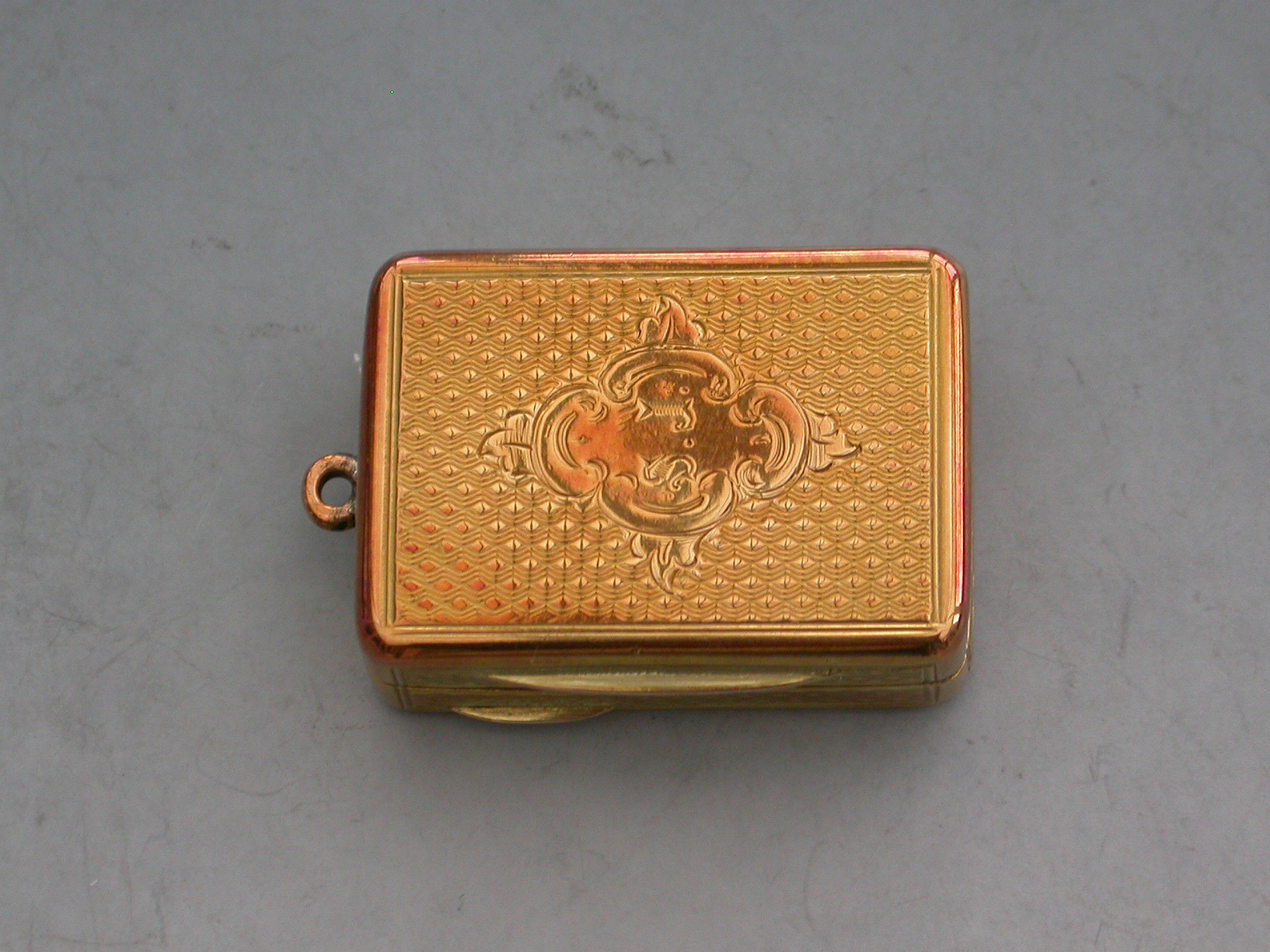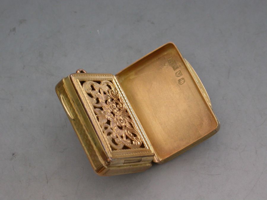 A rare Victorian Scottish 15 carat gold Vinaigrette of rectangular form with attached suspension ring, the base lid and sides with engine turned decoration, the lid with central cartouche engraved with contemporary initials 'S J'. The interior with foliate pierced grille.
