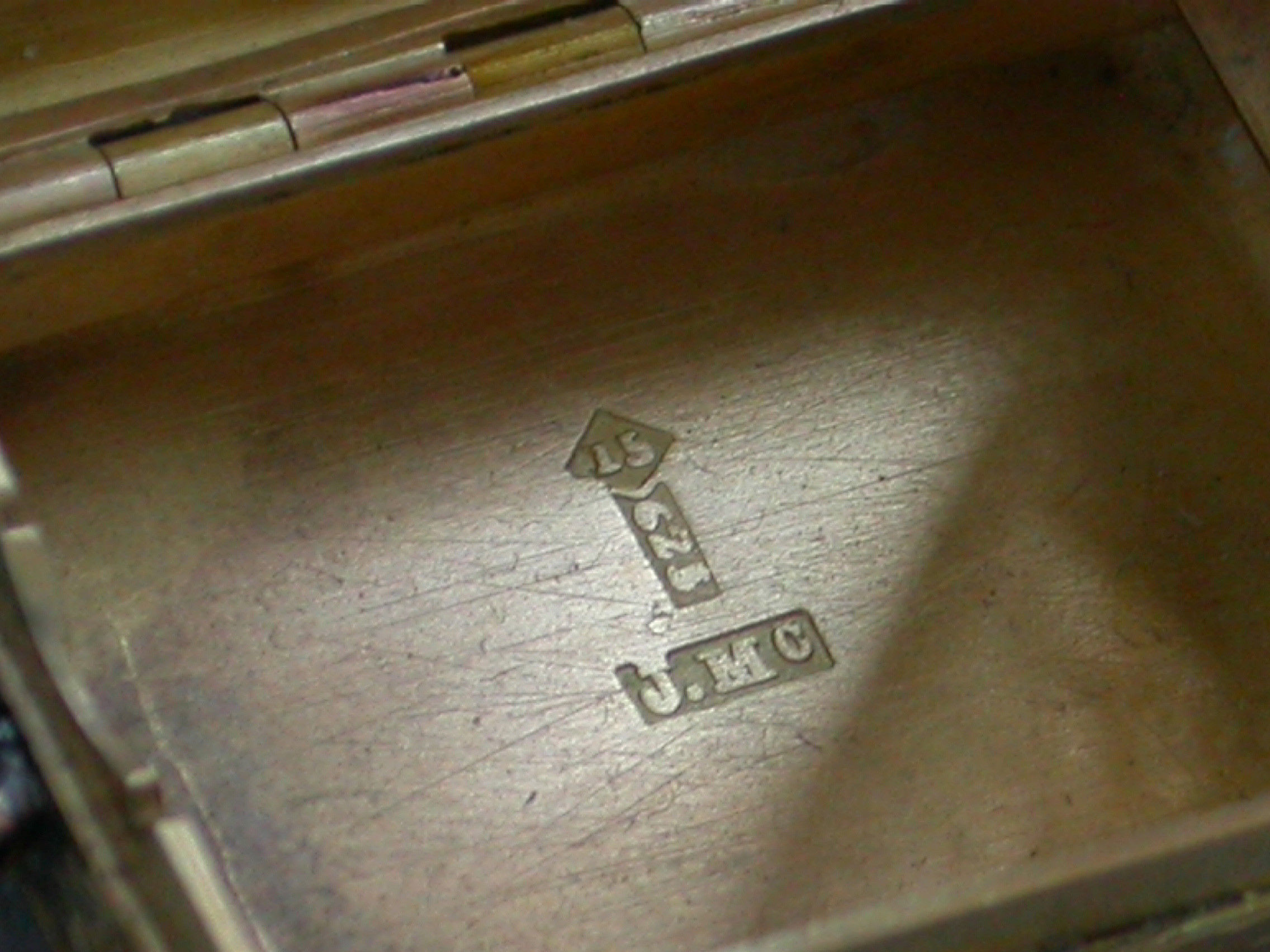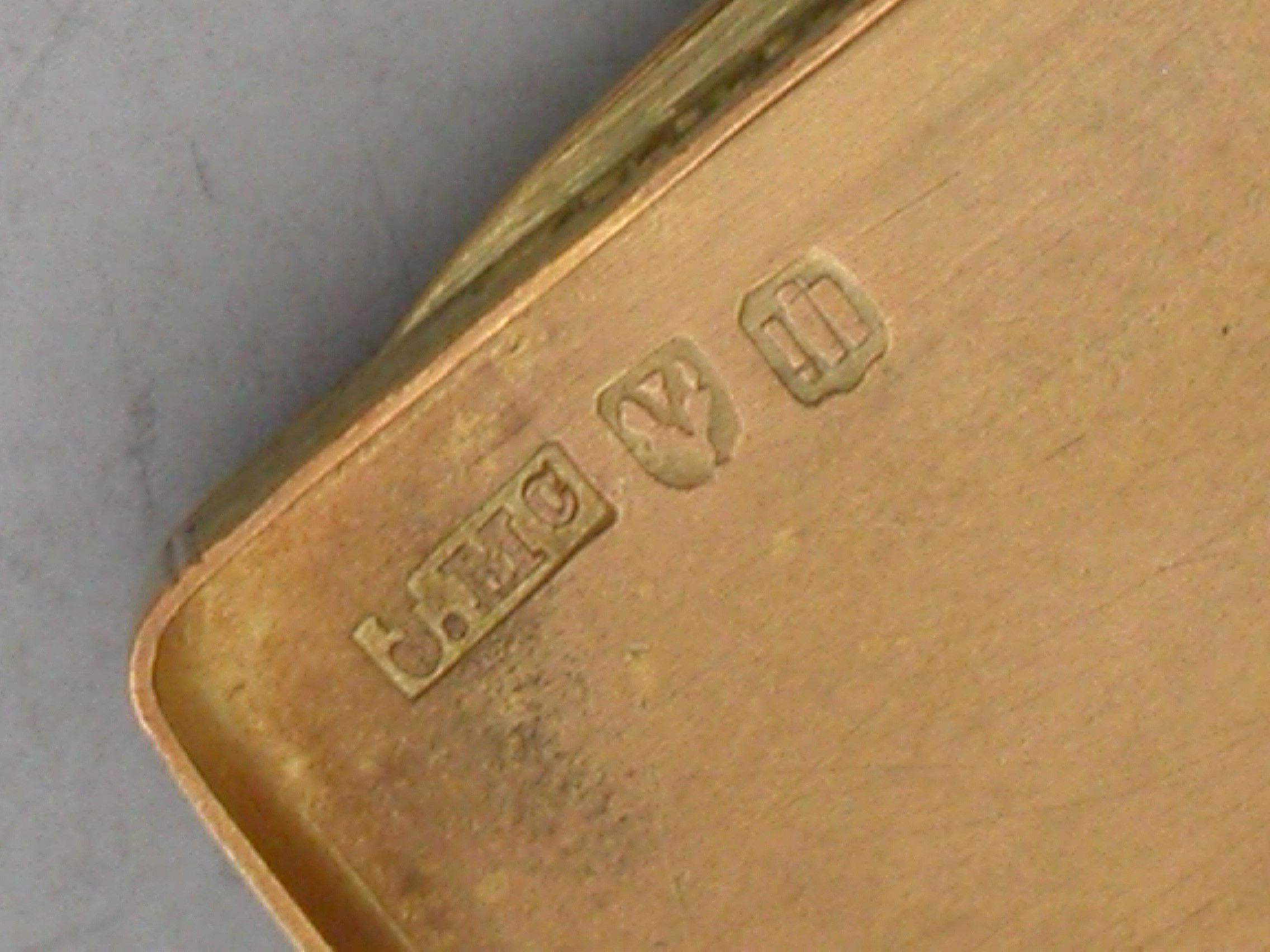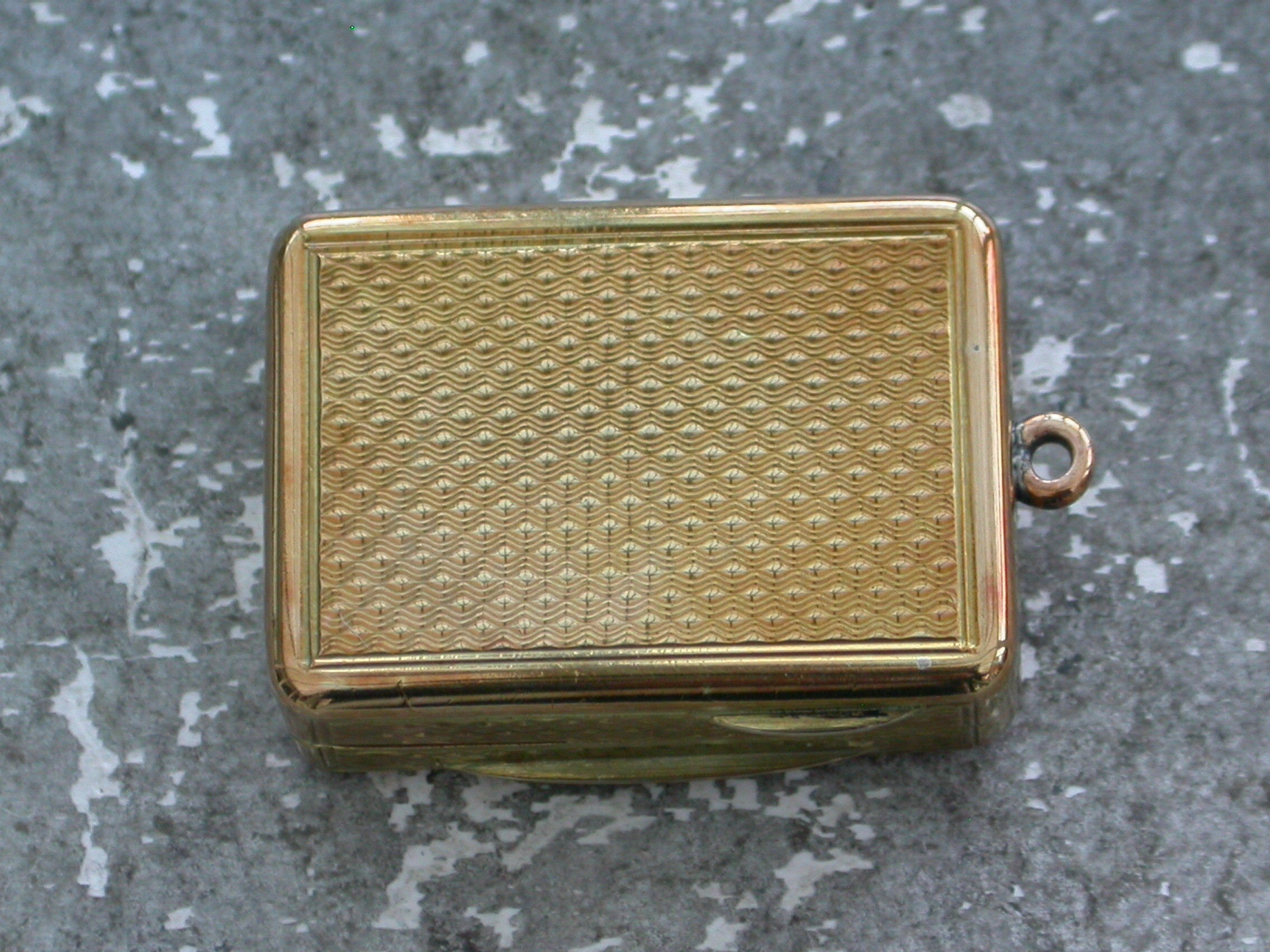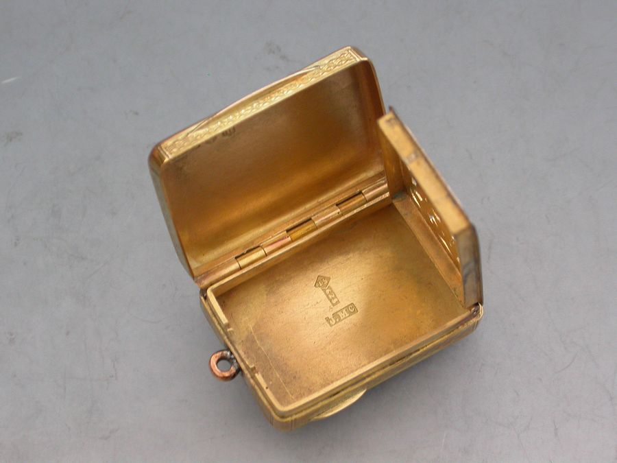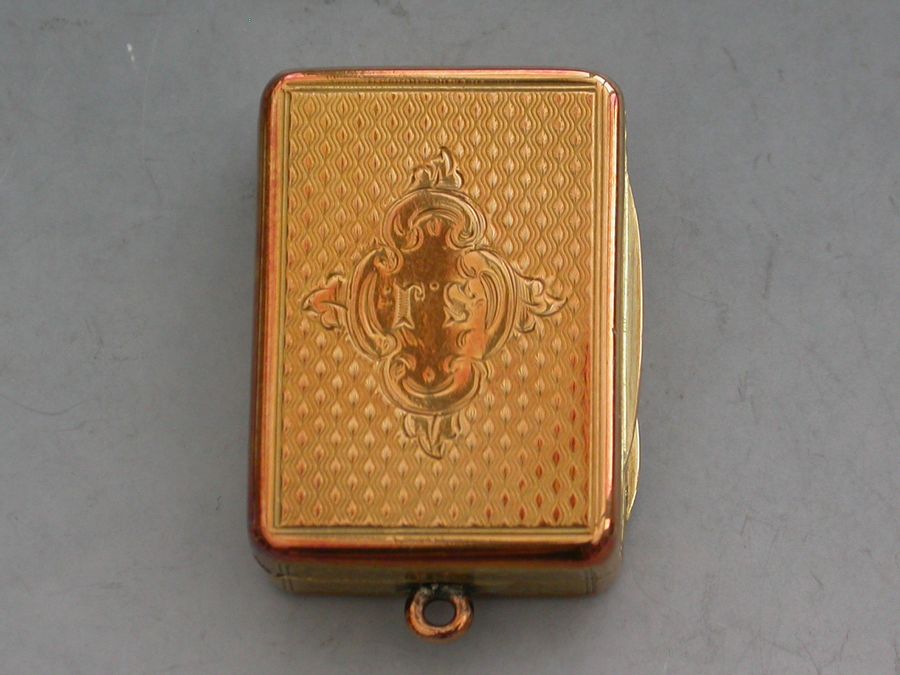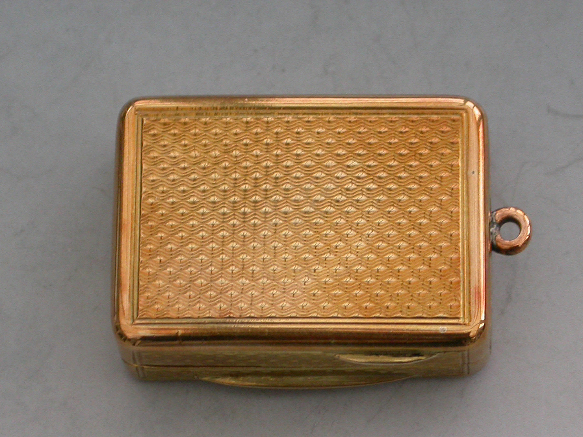 A rare Victorian Scottish 15 carat gold Vinaigrette of rectangular form with attached suspension ring, the base lid and sides with engine turned decoration, the lid with central cartouche engraved with contemporary initials 'S J'. The interior with foliate pierced grille.
