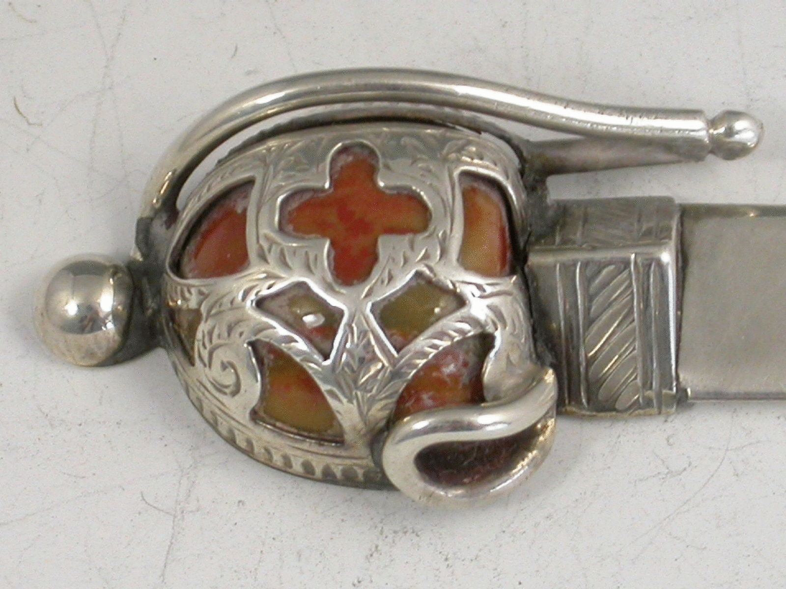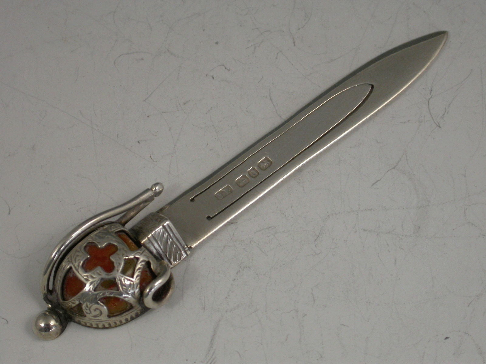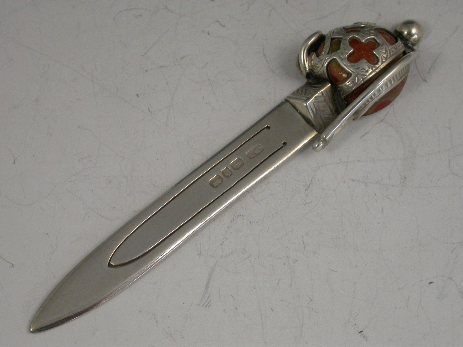 A good Victorian silver Bookmark formed as a Scottish Claymore Broadsword, the basket hilted handle set with coloured agate stones.