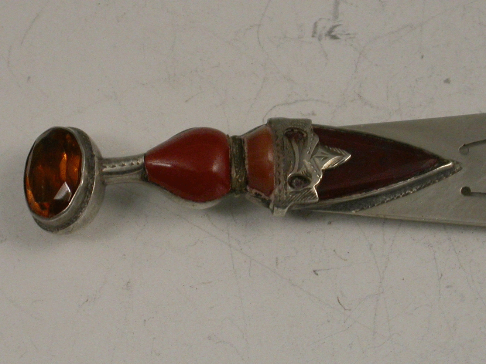 A Victorian silver Bookmark formed as a Scottish Dagger or Dirk and set with three different coloured agate stones and a facetted citrine.