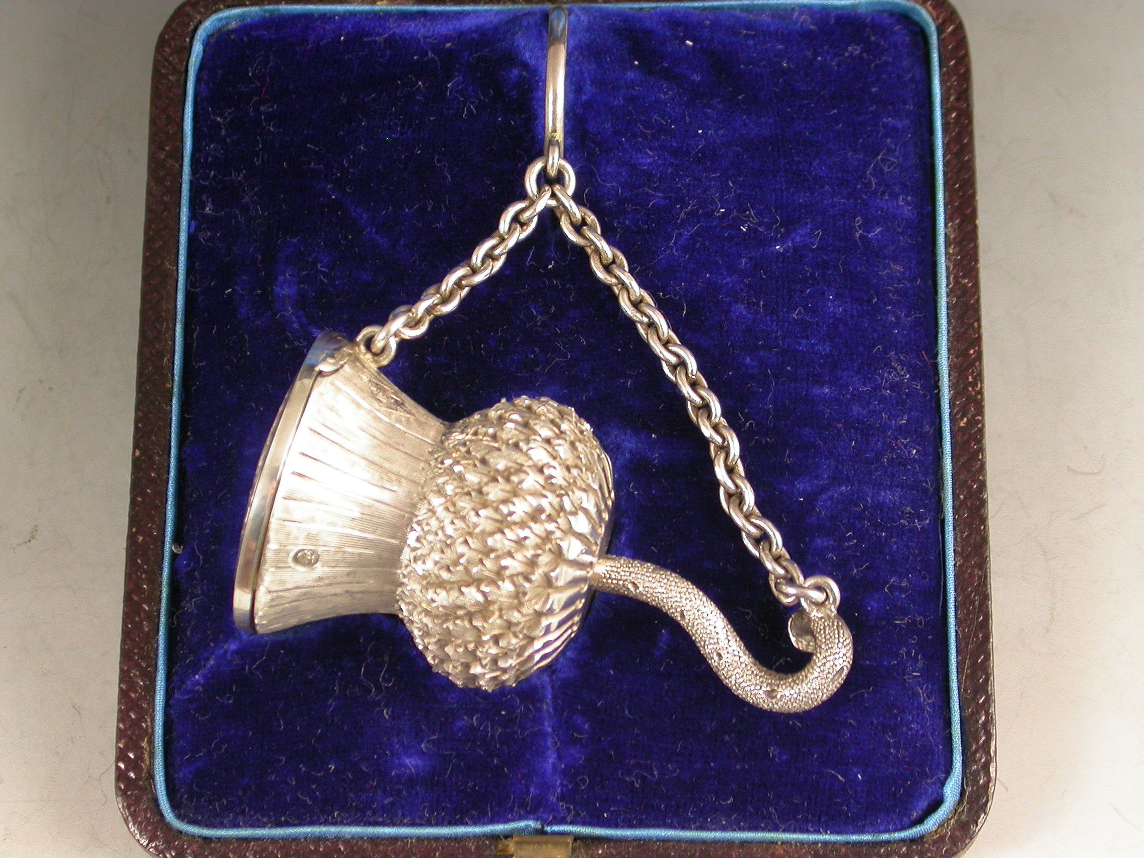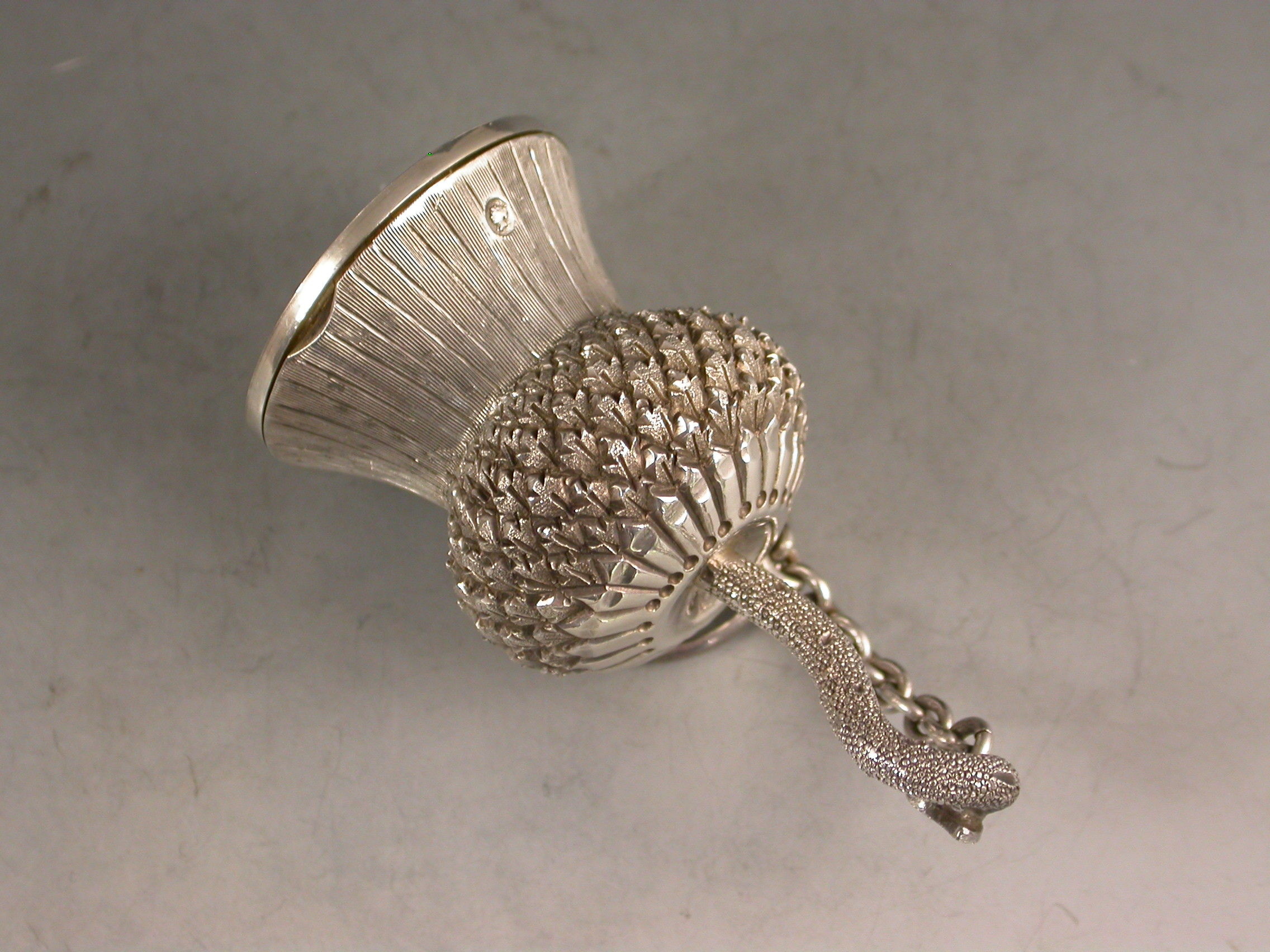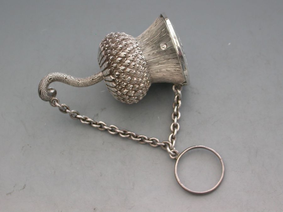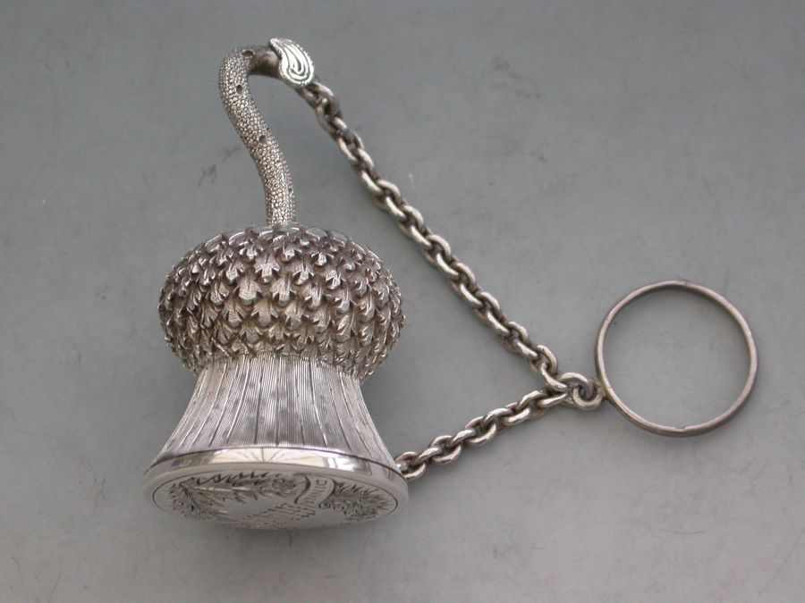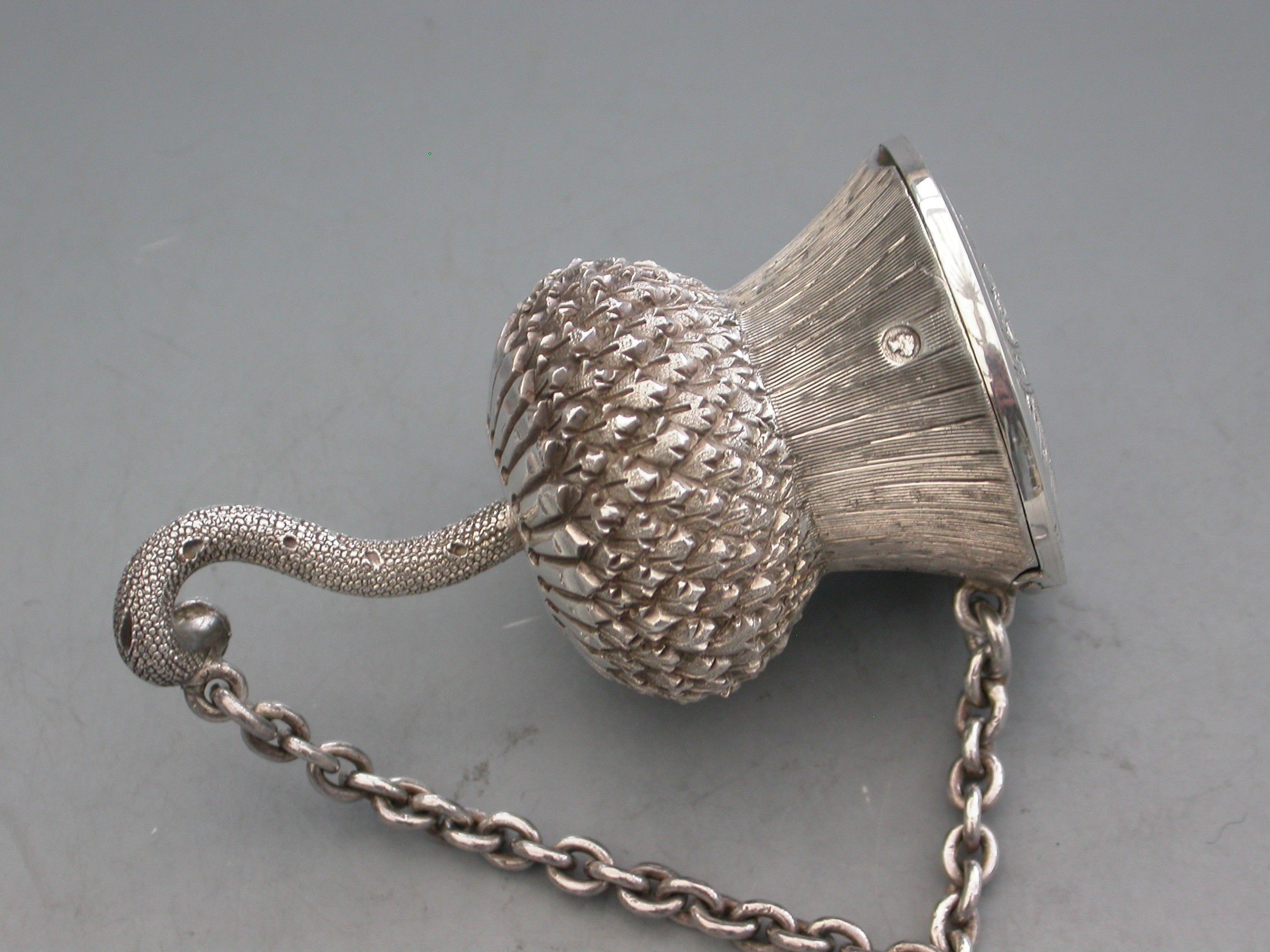 A Victorian Scottish novelty silver Vinaigrette made in the form of a Thistle, with attached suspension chain and ring. The lid engraved with contemporary initials and the motto - ""Dinna Forget"". Complete with original Mackay & Chisholm retailers silk and velvet lined leather case.