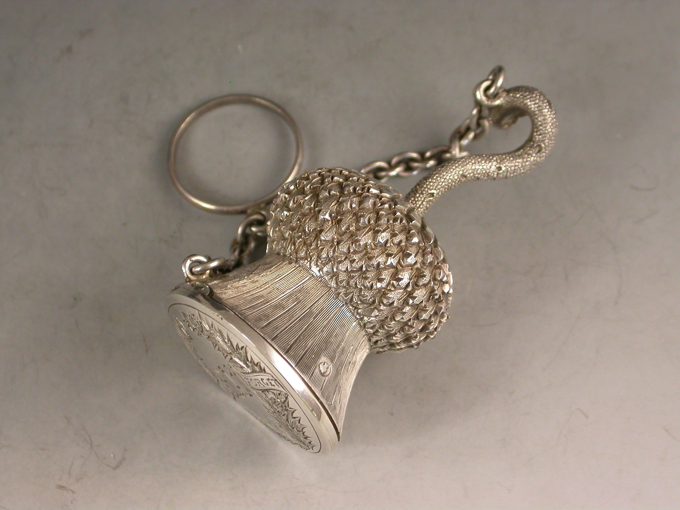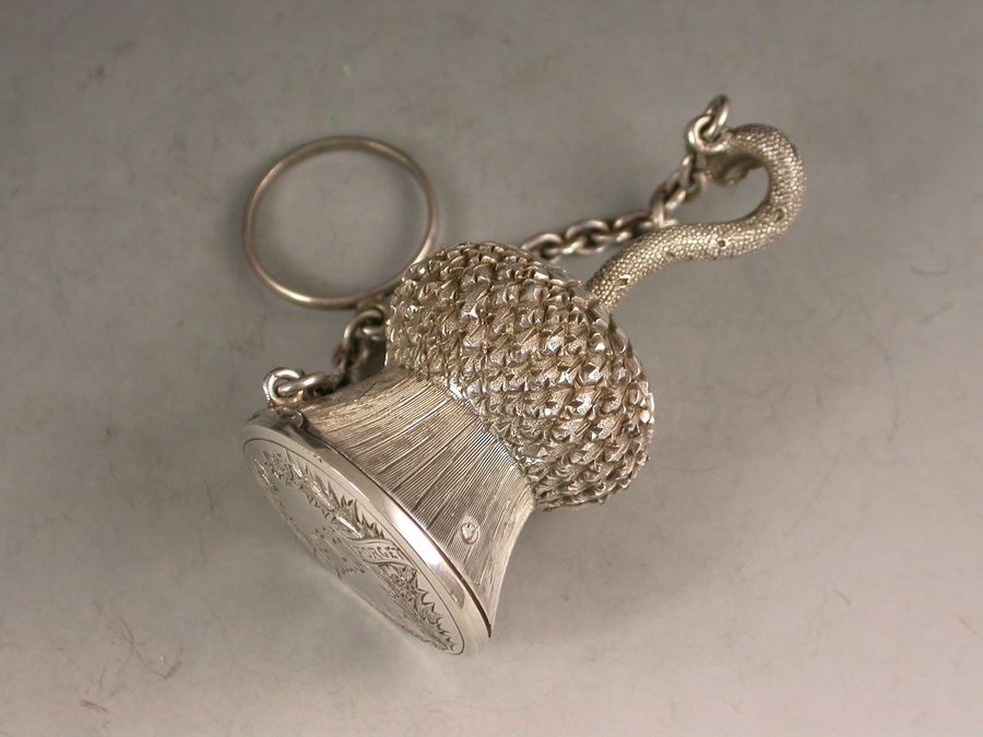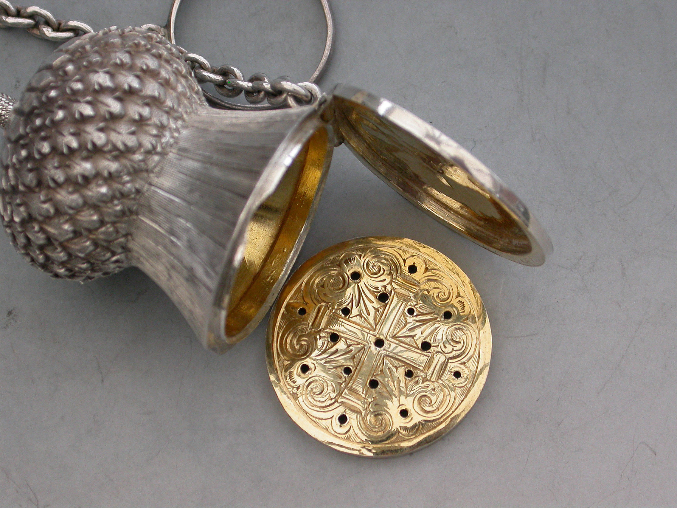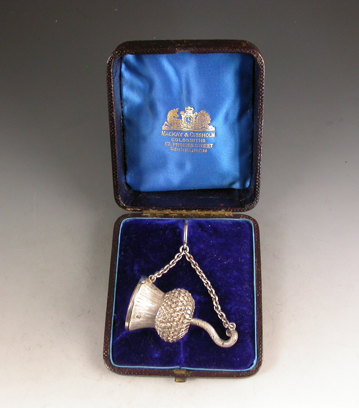 A Victorian Scottish novelty silver Vinaigrette made in the form of a Thistle, with attached suspension chain and ring. The lid engraved with contemporary initials and the motto - ""Dinna Forget"". Complete with original Mackay & Chisholm retailers silk and velvet lined leather case.