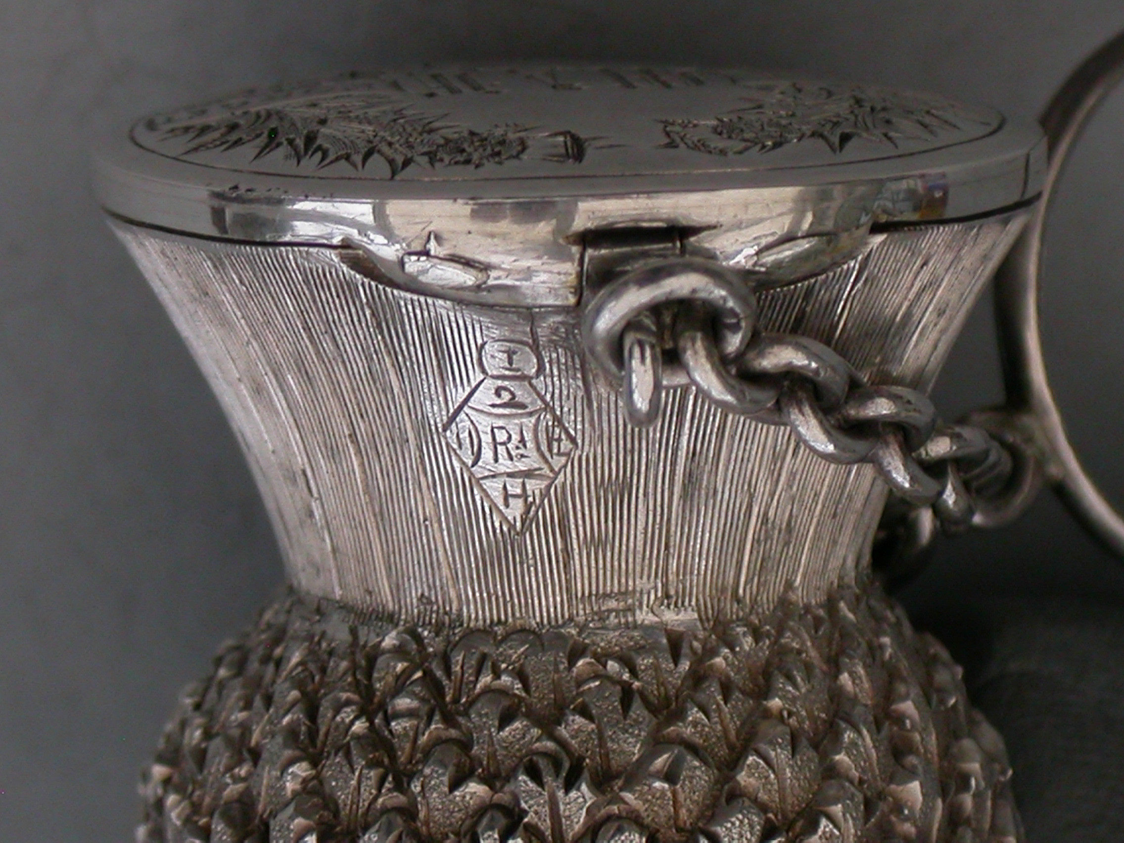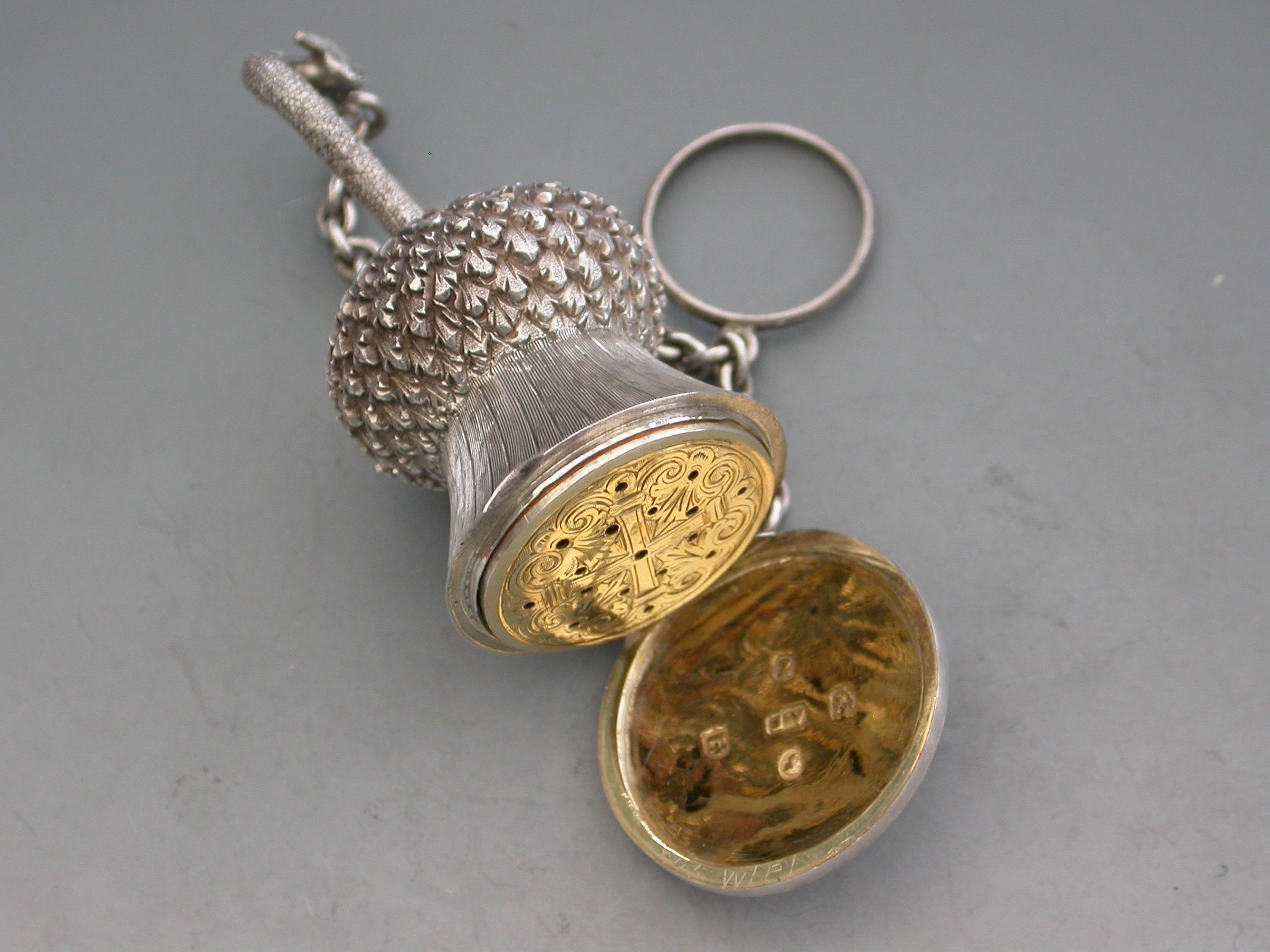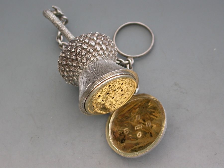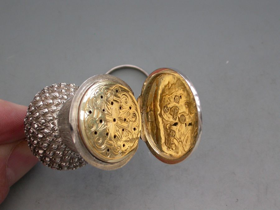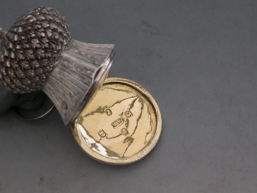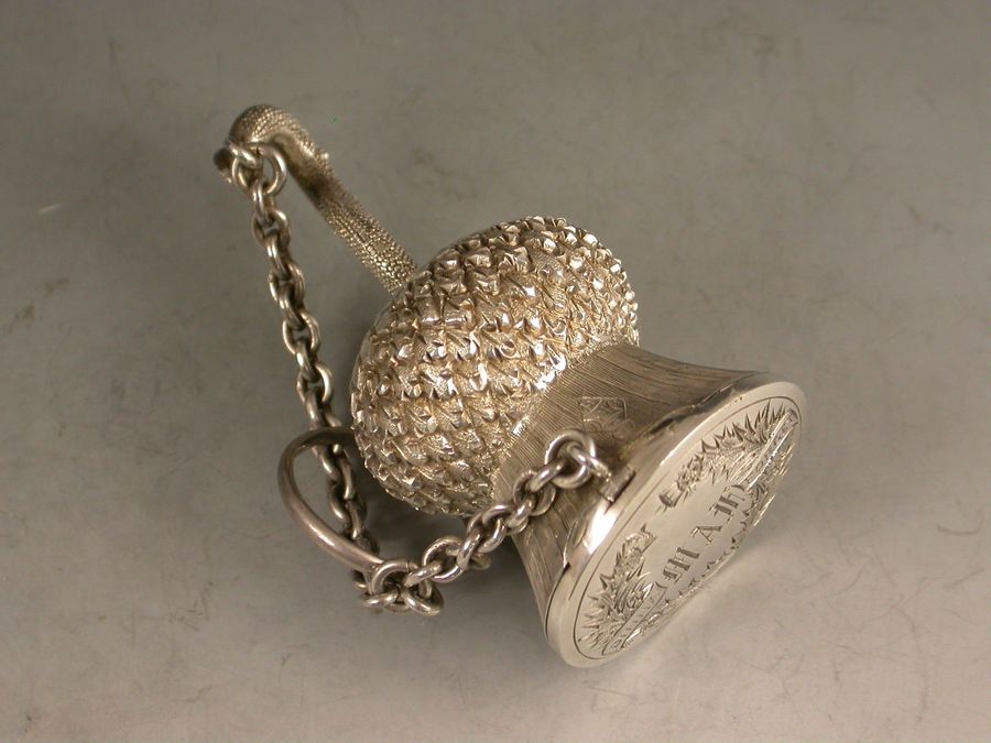 A Victorian Scottish novelty silver Vinaigrette made in the form of a Thistle, with attached suspension chain and ring. The lid engraved with contemporary initials and the motto - ""Dinna Forget"". Complete with original Mackay & Chisholm retailers silk and velvet lined leather case.