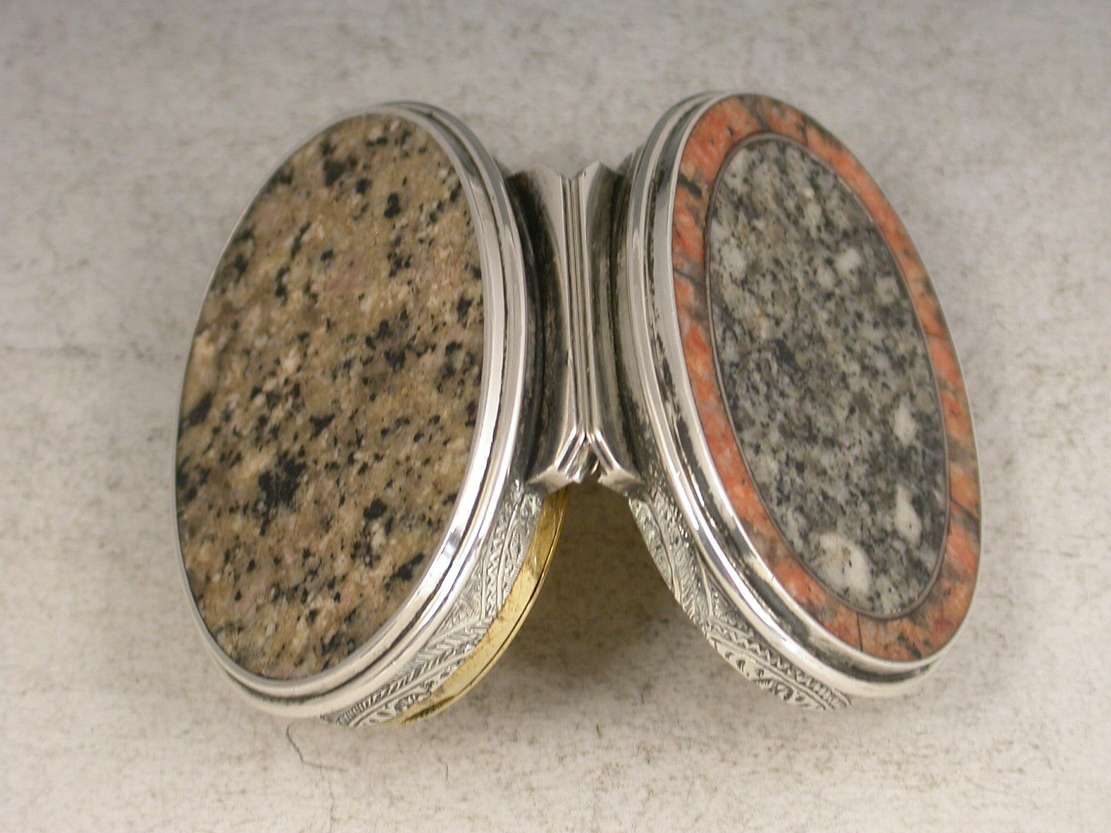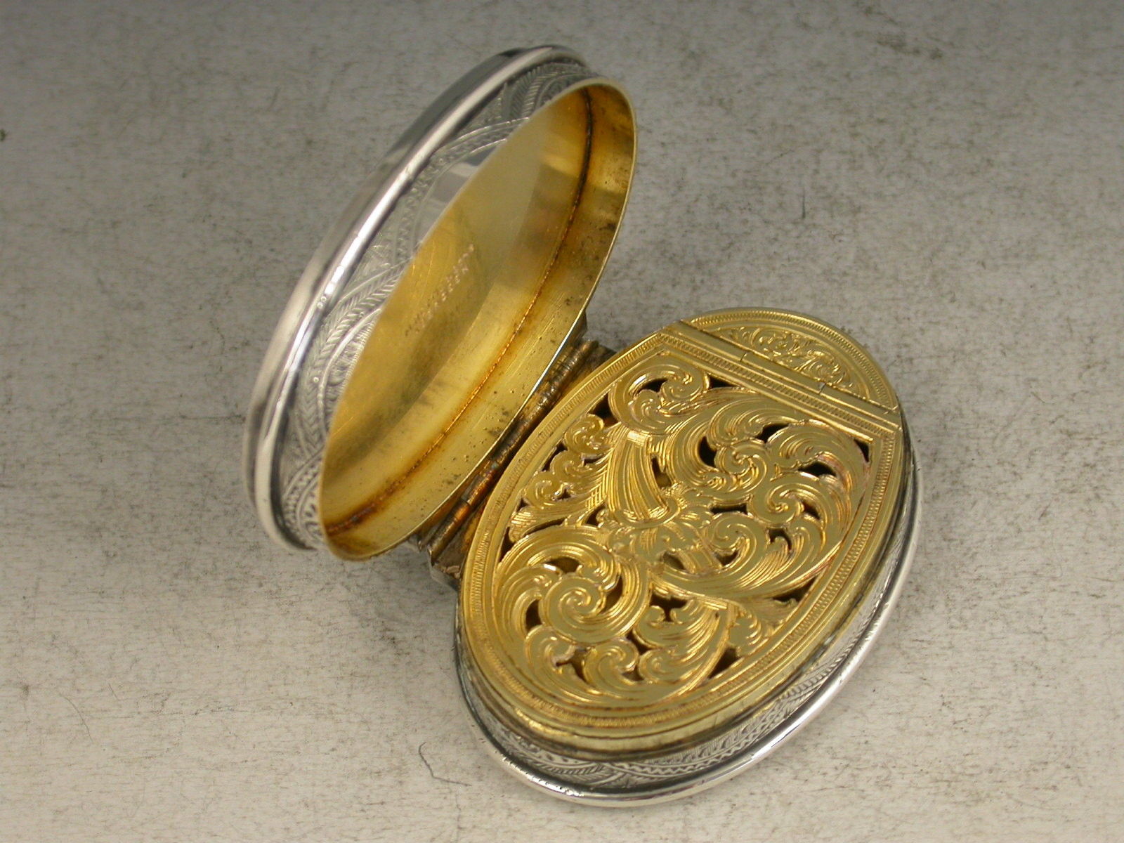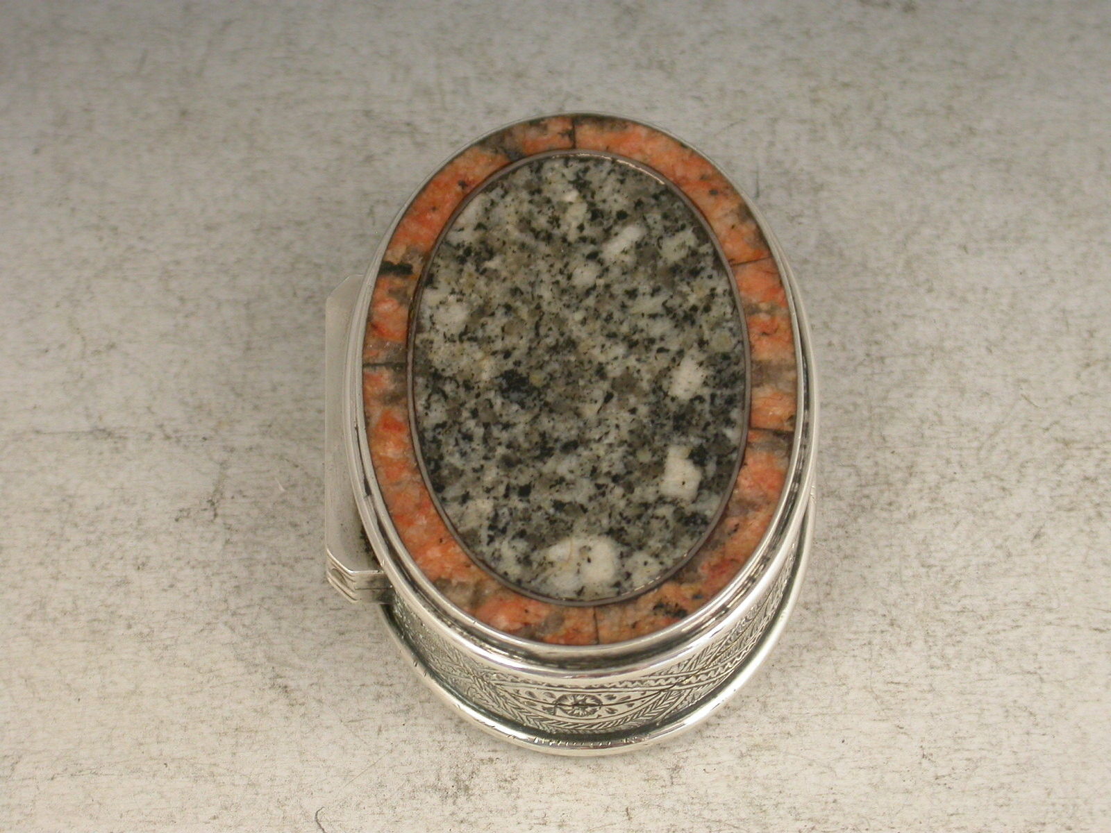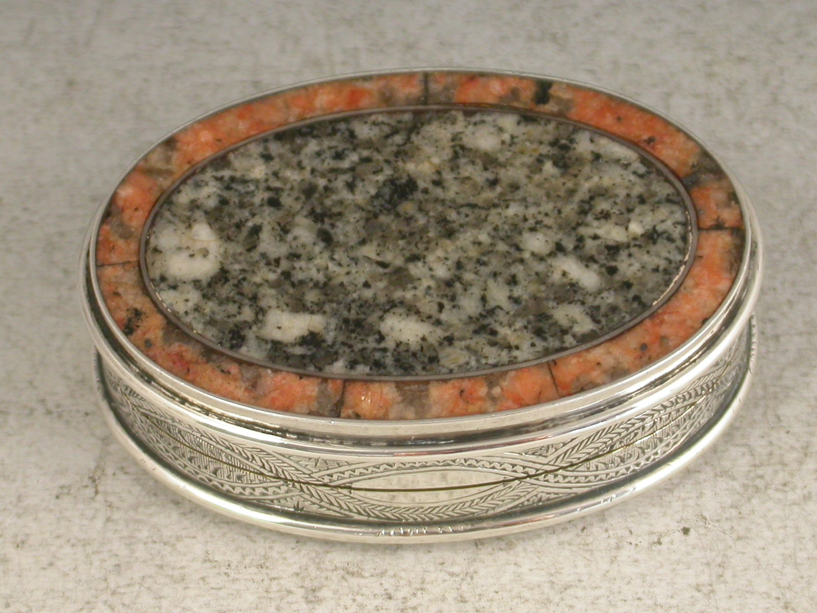 A very fine quality Victorian Scottish Provincial silver Vinaigrette of oval form, the silver body finely engraved with interlaced foliate designs. The hinged cover with inset pink granite border surrounding a grey granite panel, the base inset with a brownish grey granite panel, the silver gilt interior with a finely pierced and engraved foliate scroll grill.