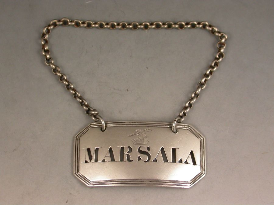 A Victorian Scottish silver Wine Label of cut-cornered rectangular form with triple reeded border, pierced for Marsala, engraved with a crest above the title.