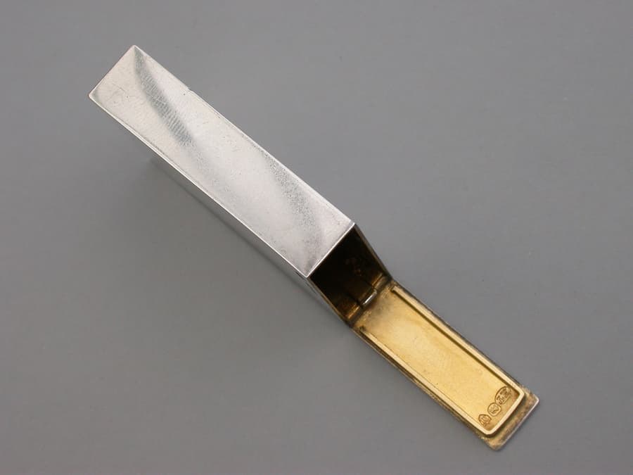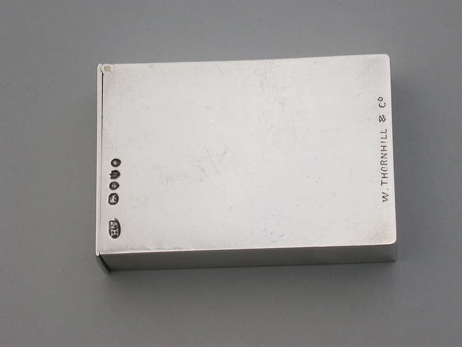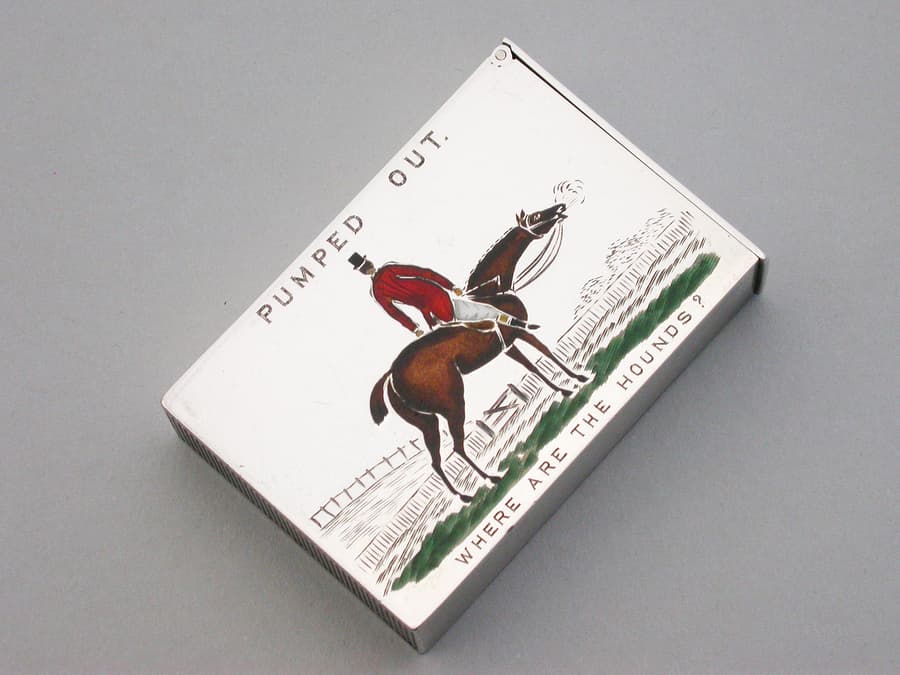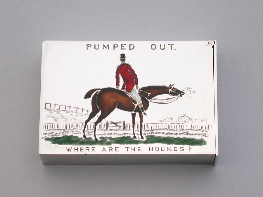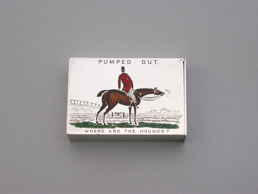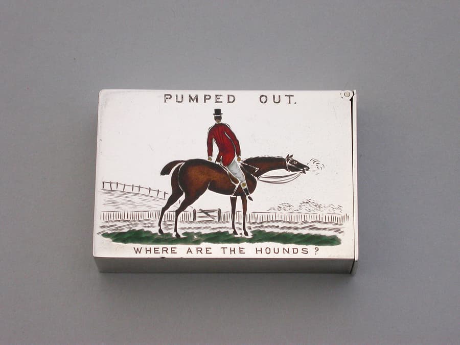 A good Victorian silver and enamel Vesta Case of plain rectangular form with flat-top hinged lid, the face partly enamelled with a huntsman on his horse and the legends; ""Pumped Out"" and ""Where are the Hounds?"". Silver gilt interior.