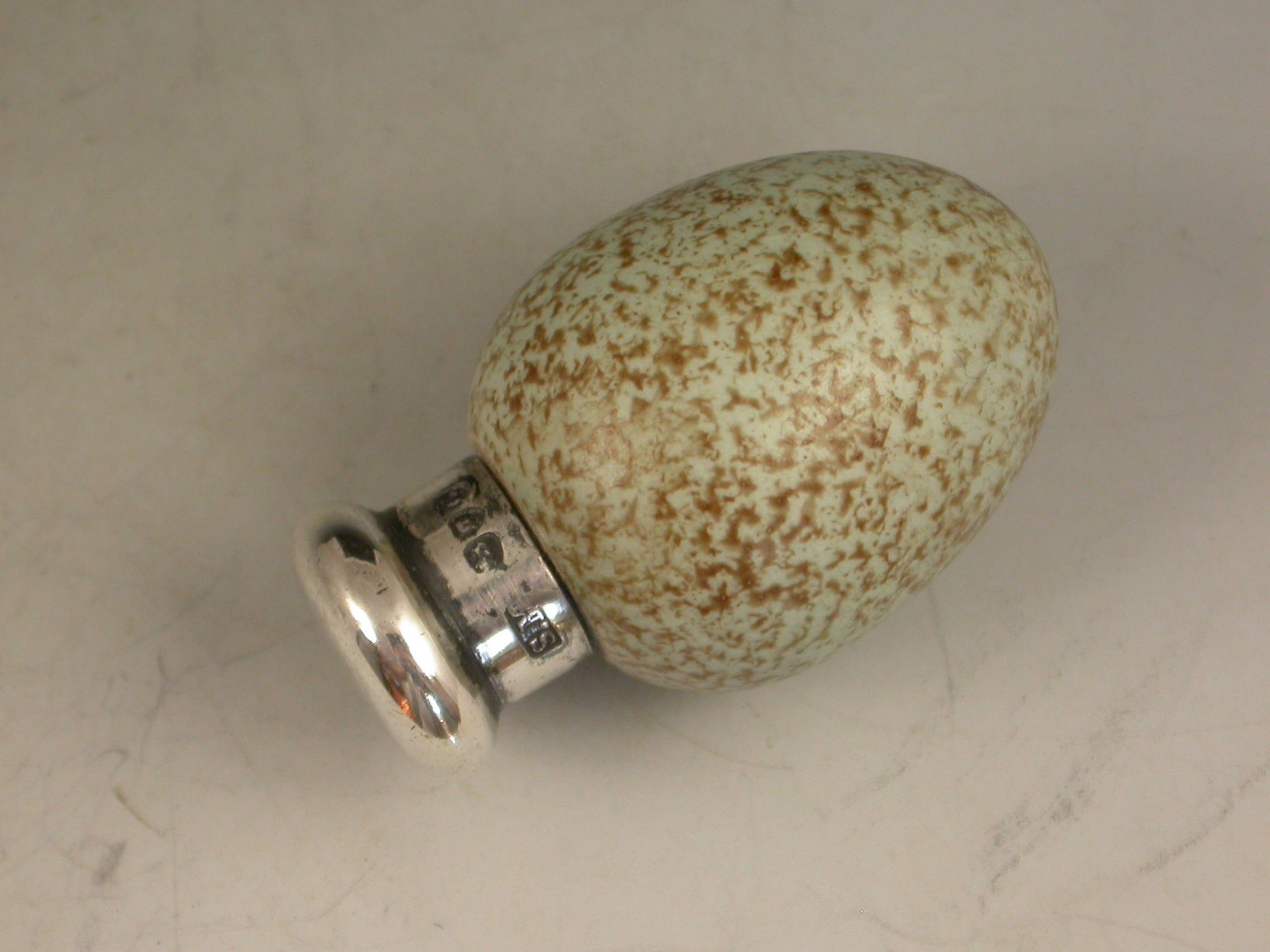 A good Victorian novelty silver and ceramic Scent Bottle made in the form of a Blackbirds Egg, with screw-off silver top and of small size. The egg stamped with a registered design number: 20772.
