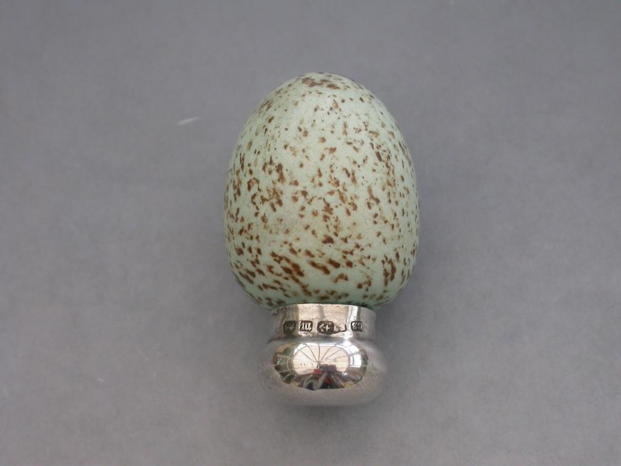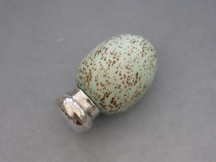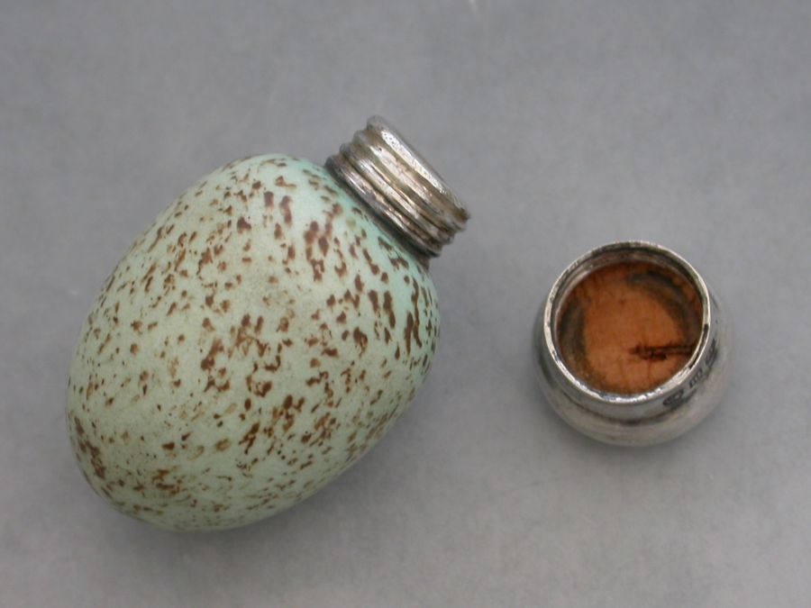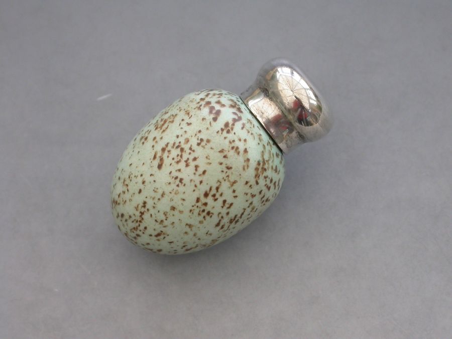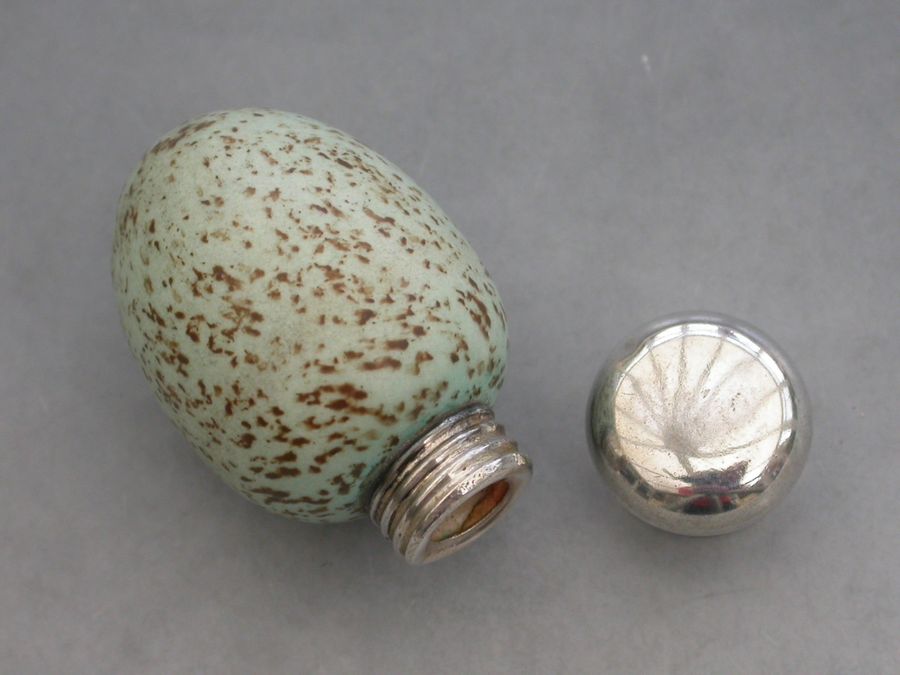 A good Victorian novelty silver and ceramic Scent Bottle made in the form of a Blackbirds Egg, with screw-off silver top and of small size. The egg stamped with a registered design number: 20772.