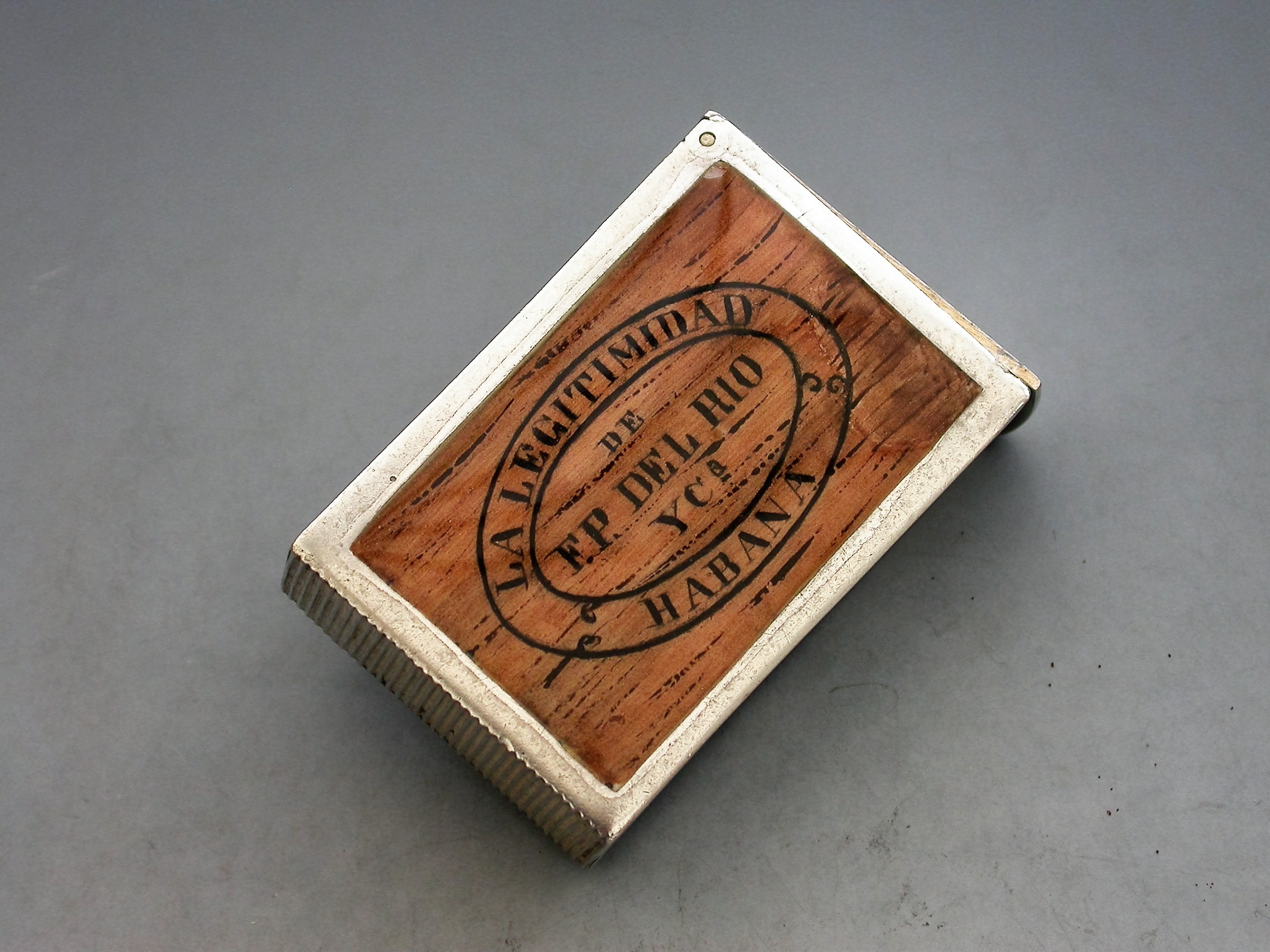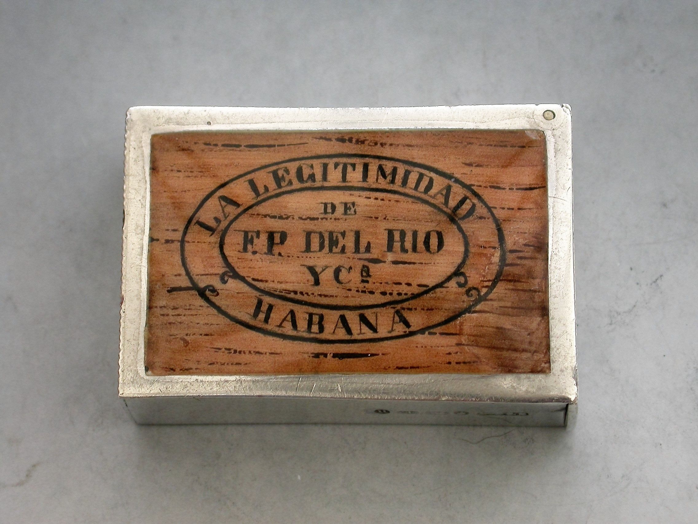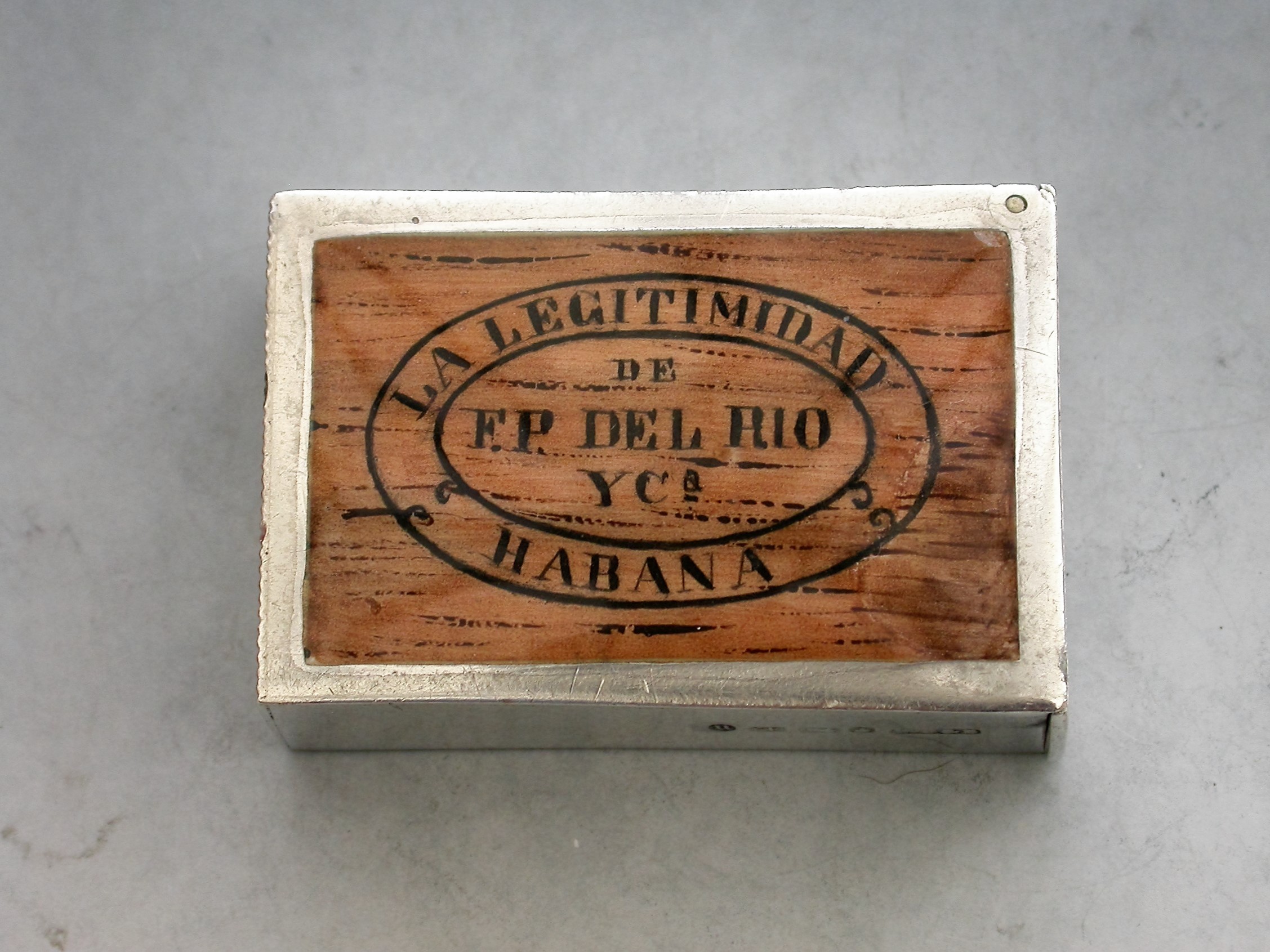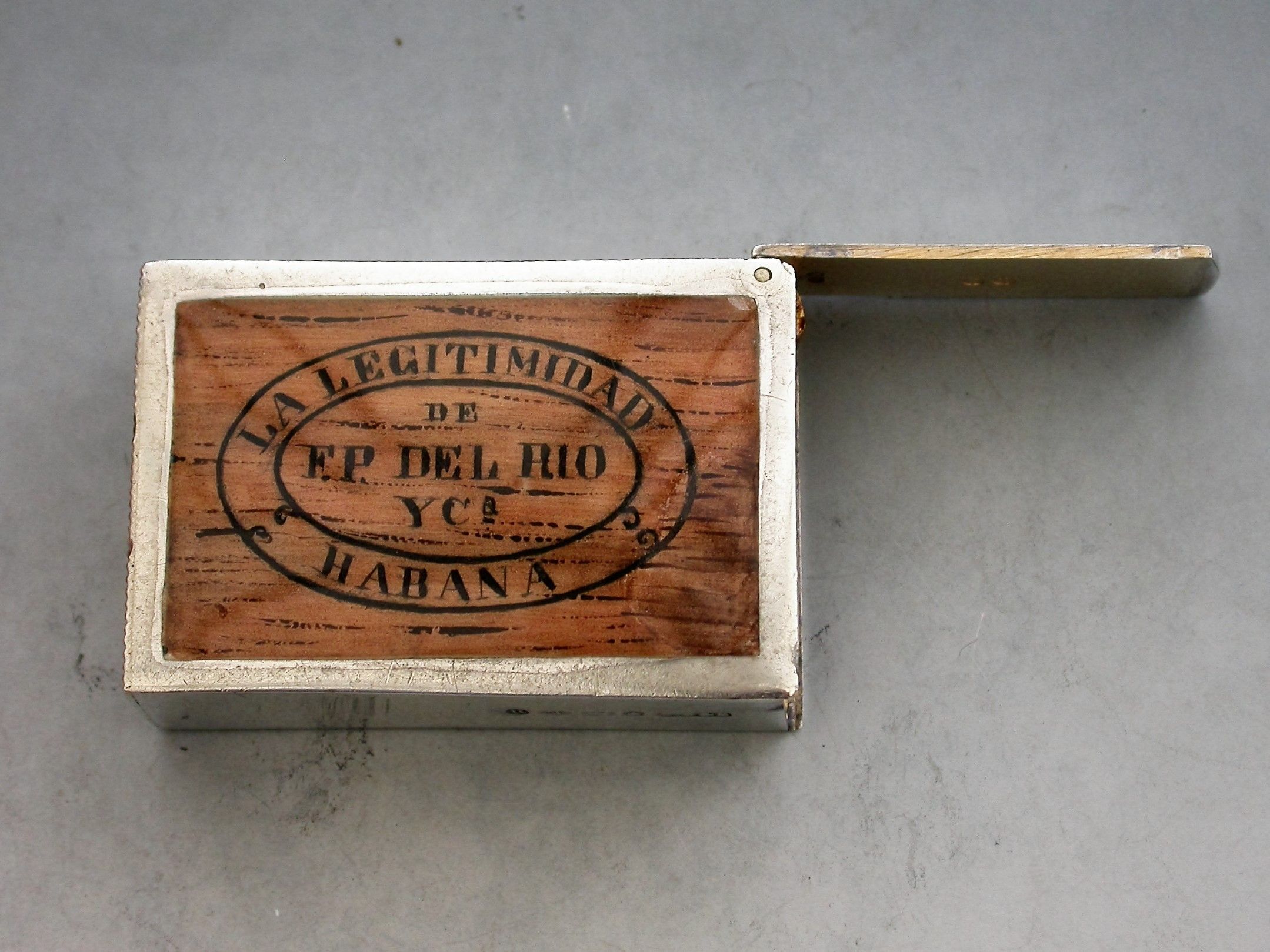 A Victorian silver and enamel Vesta Case made in the form of a 'La Legitimidad' Cuban Cigar Box (a pre revolution discontinued brand). The rectangular case with flat hinged lid opening to reveal a silver gilt interior, a striker to the base.