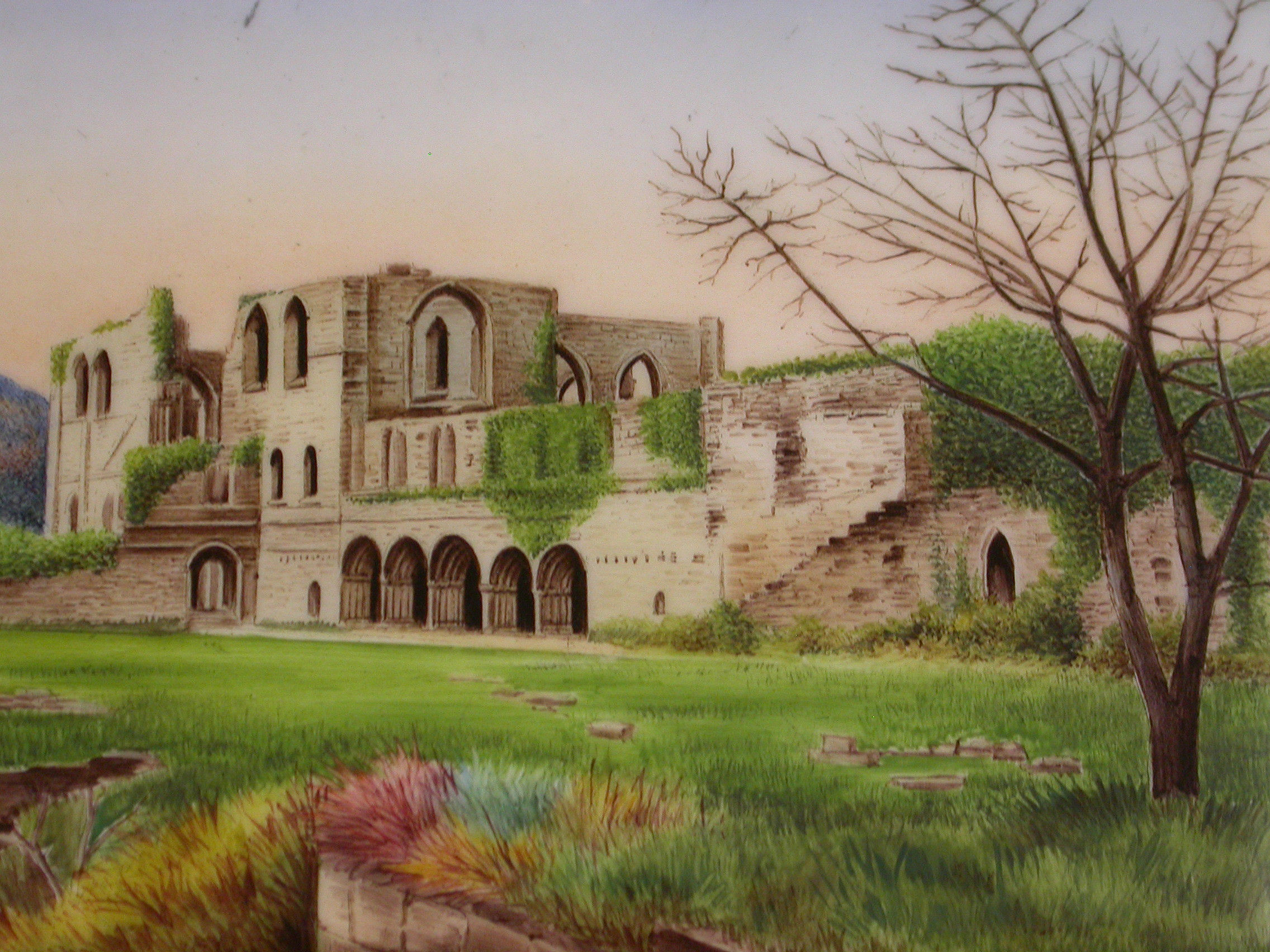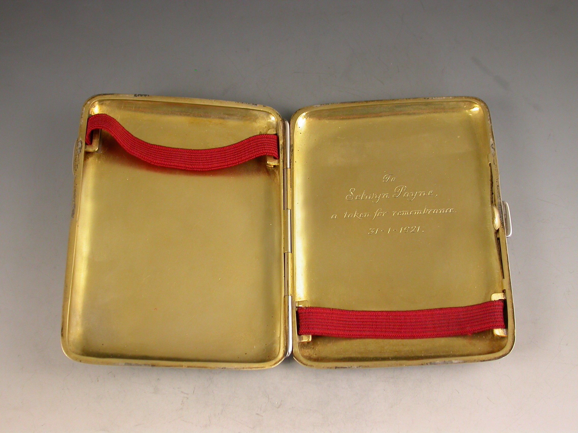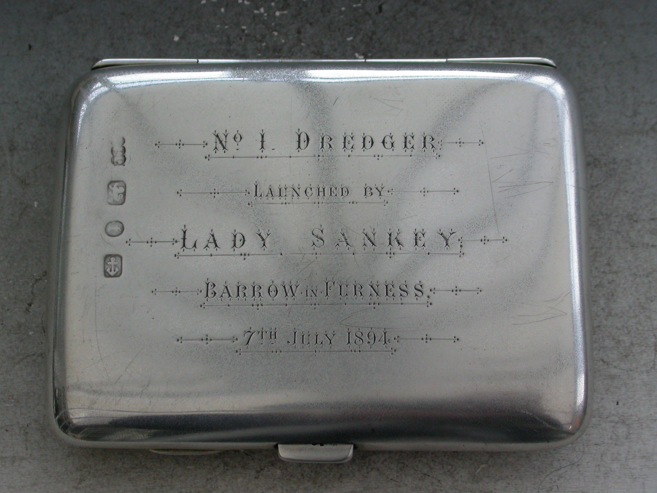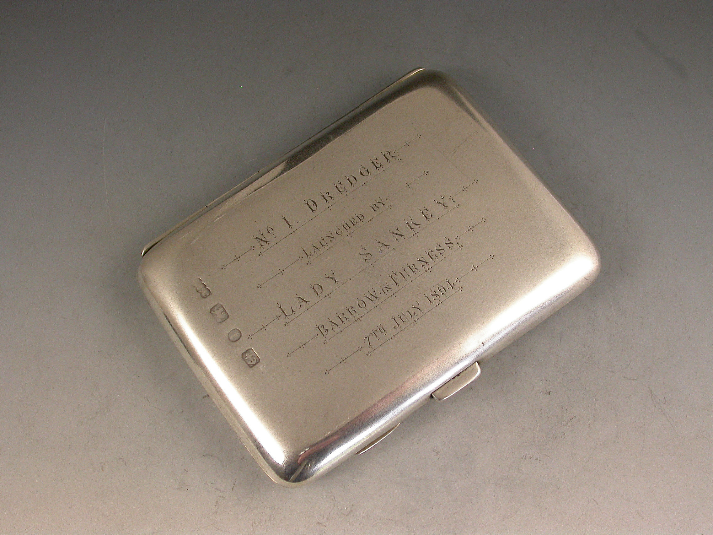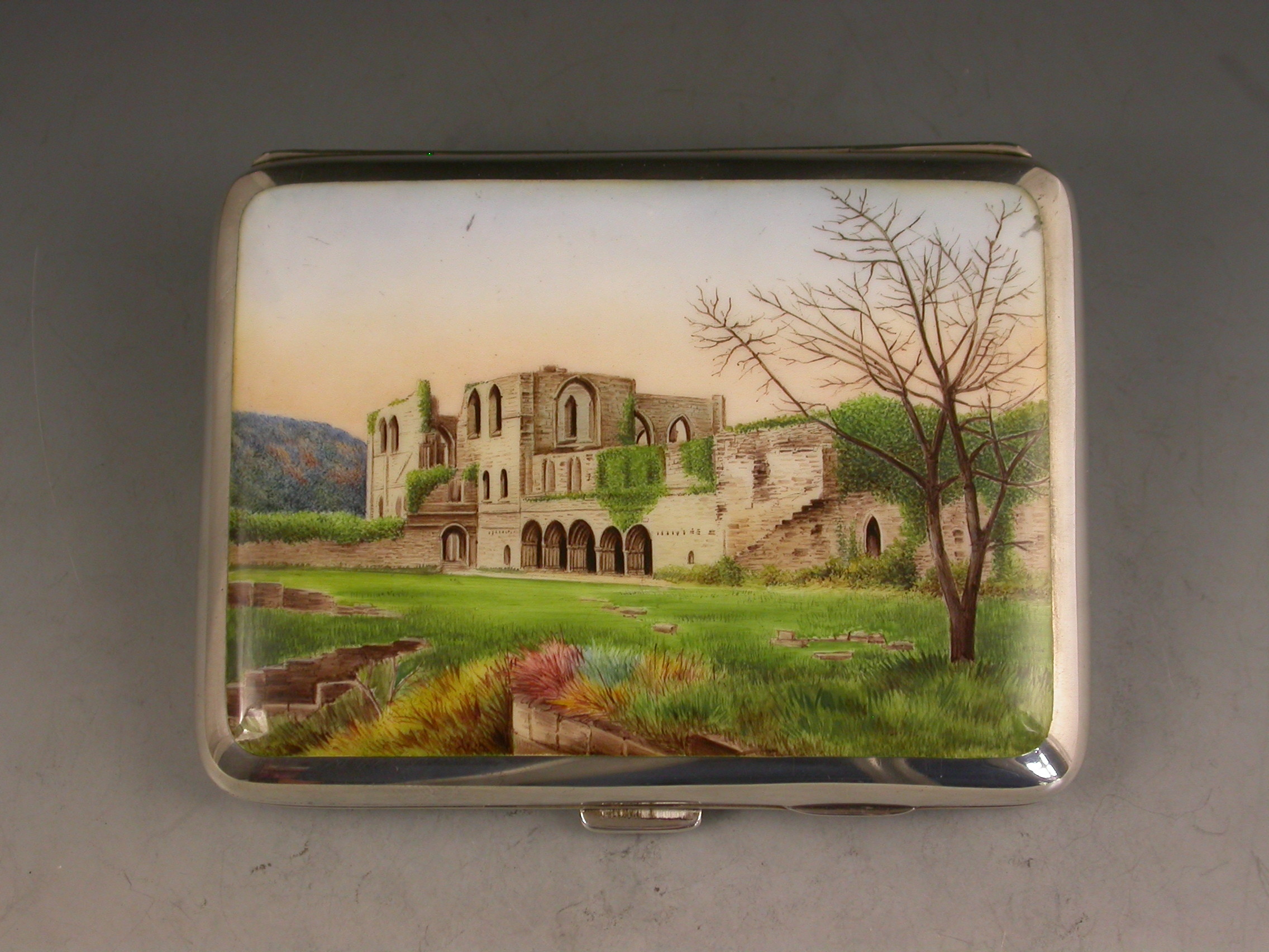 A good Victorian silver Cigarette Case of rounded rectangular form, the cover decorated with a painted enamel scene depicting a south-west view of Furness Abbey in Lancashire. Silver gilt interior and engraved presentation inscriptions inside and out relating to Barrow-in-Furness, presented by Lady Sankey.