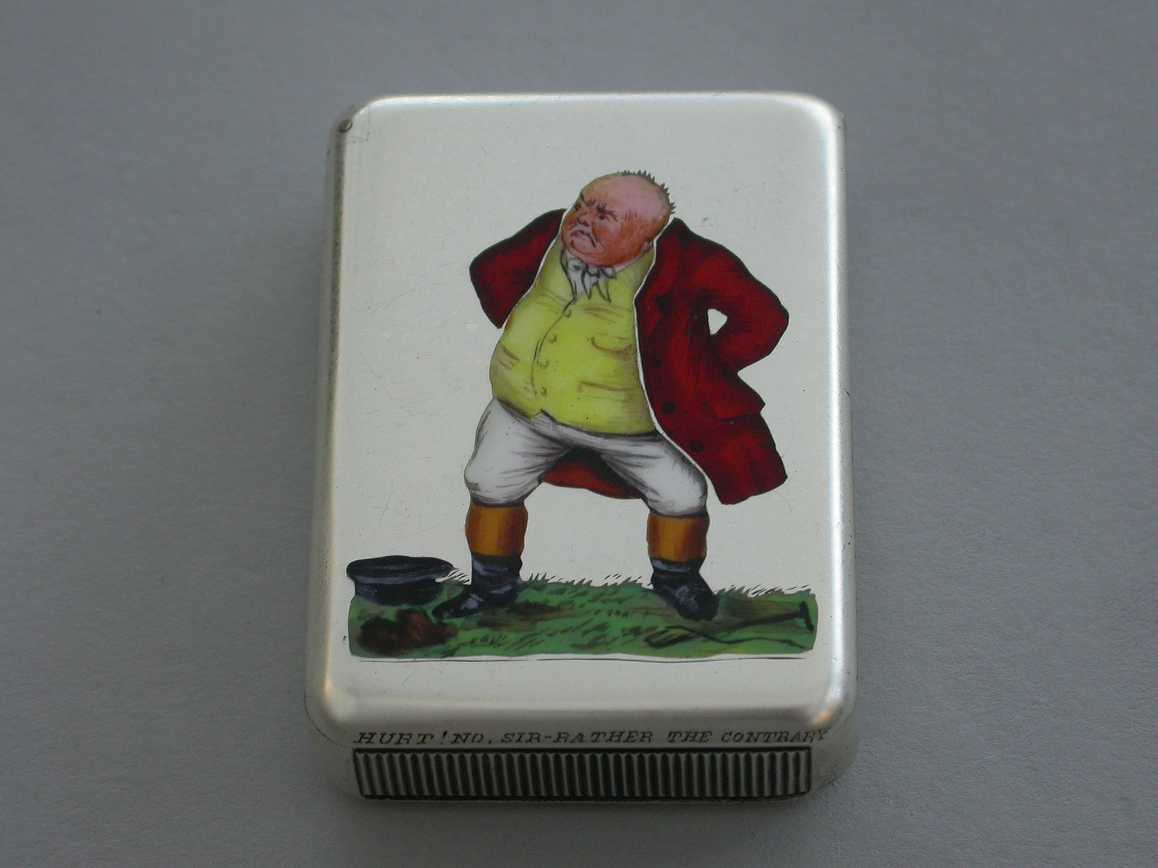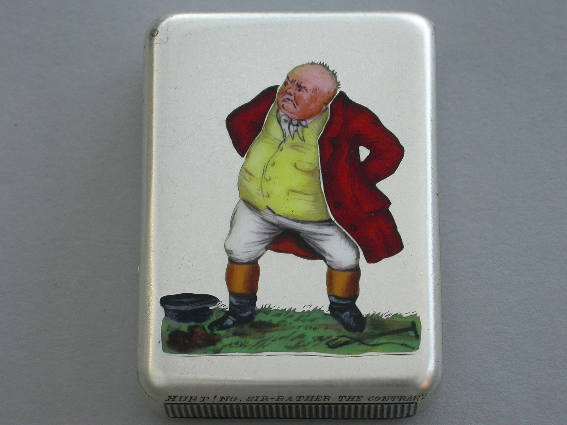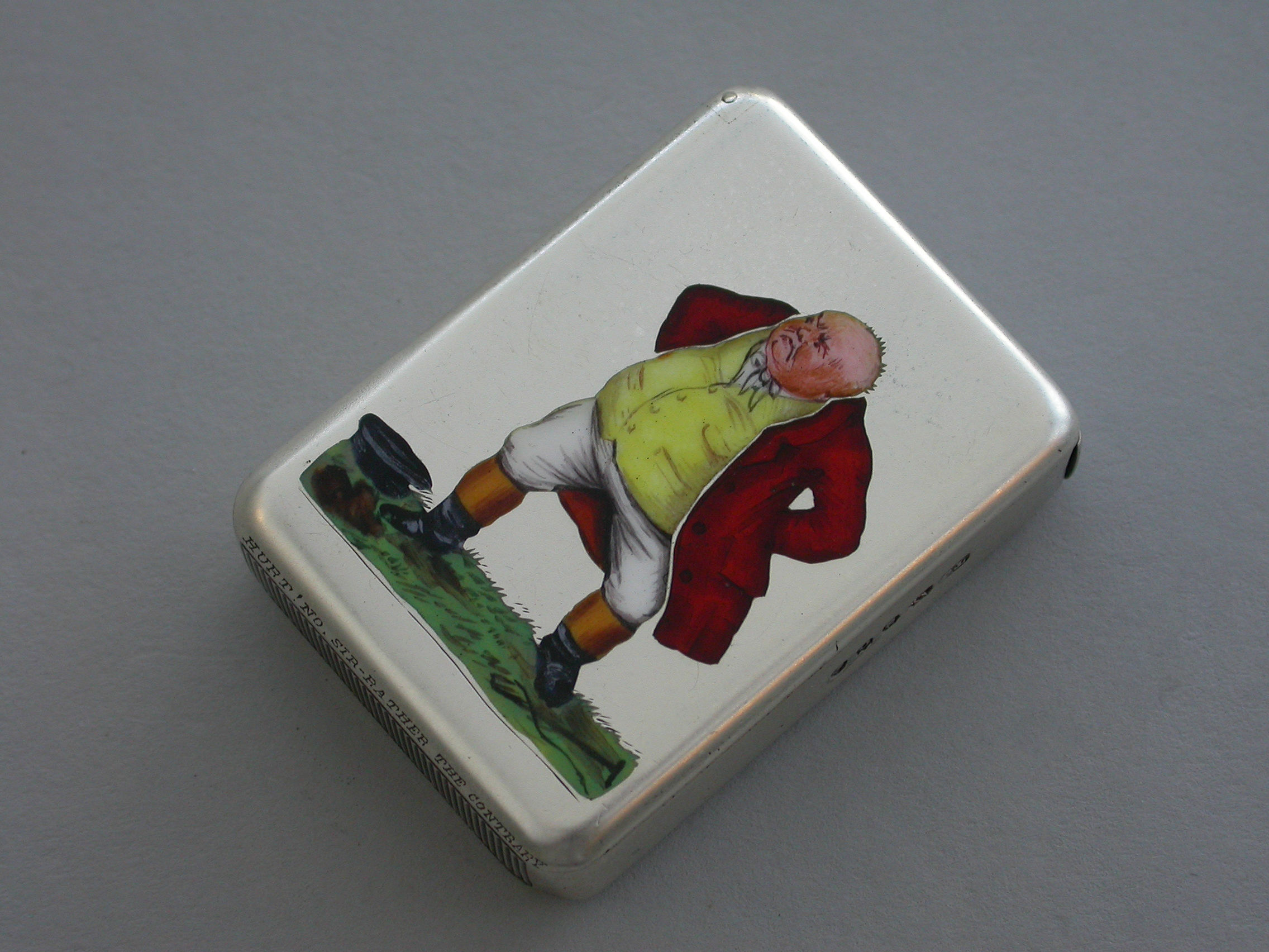 An extremely rare Victorian silver and enamel Vesta Case of rounded rectangular form with sprung hinged flat-top lid, the face enamelled with a depiction of Mr Jorrock's in his red hunting coat having just fallen from his horse and loosing his wig and hat.