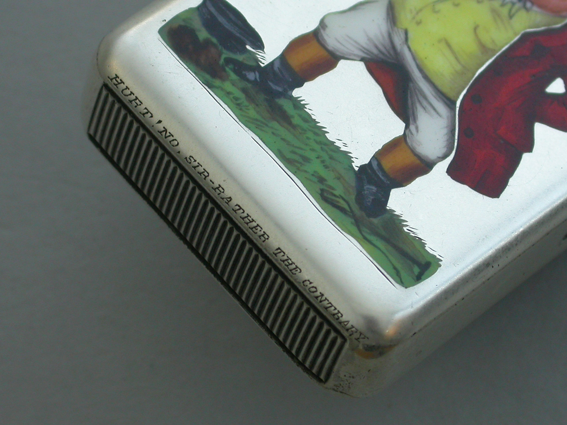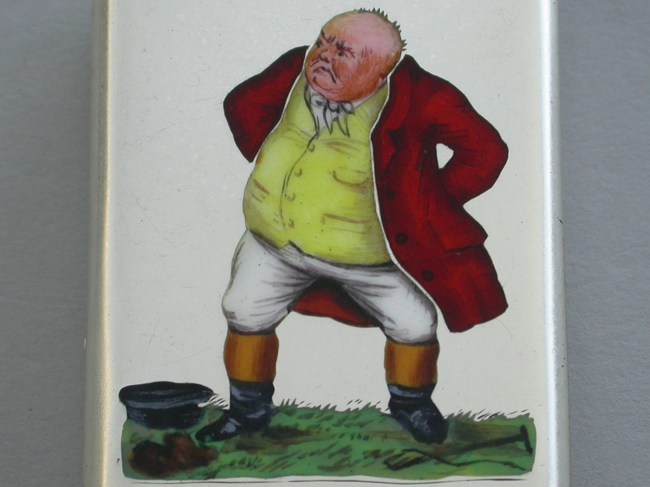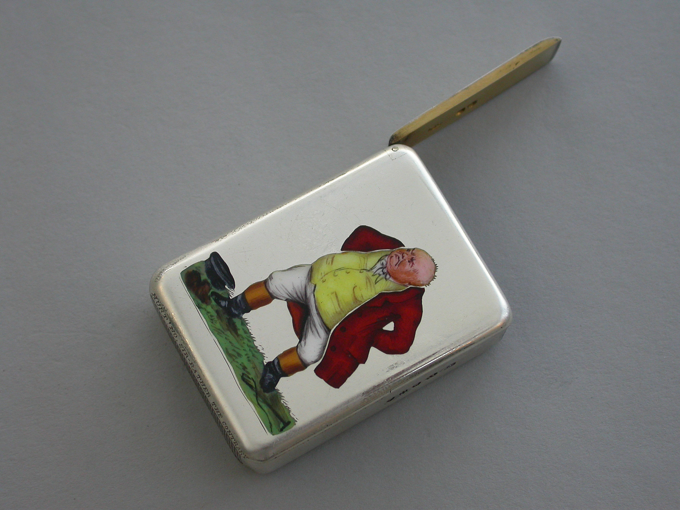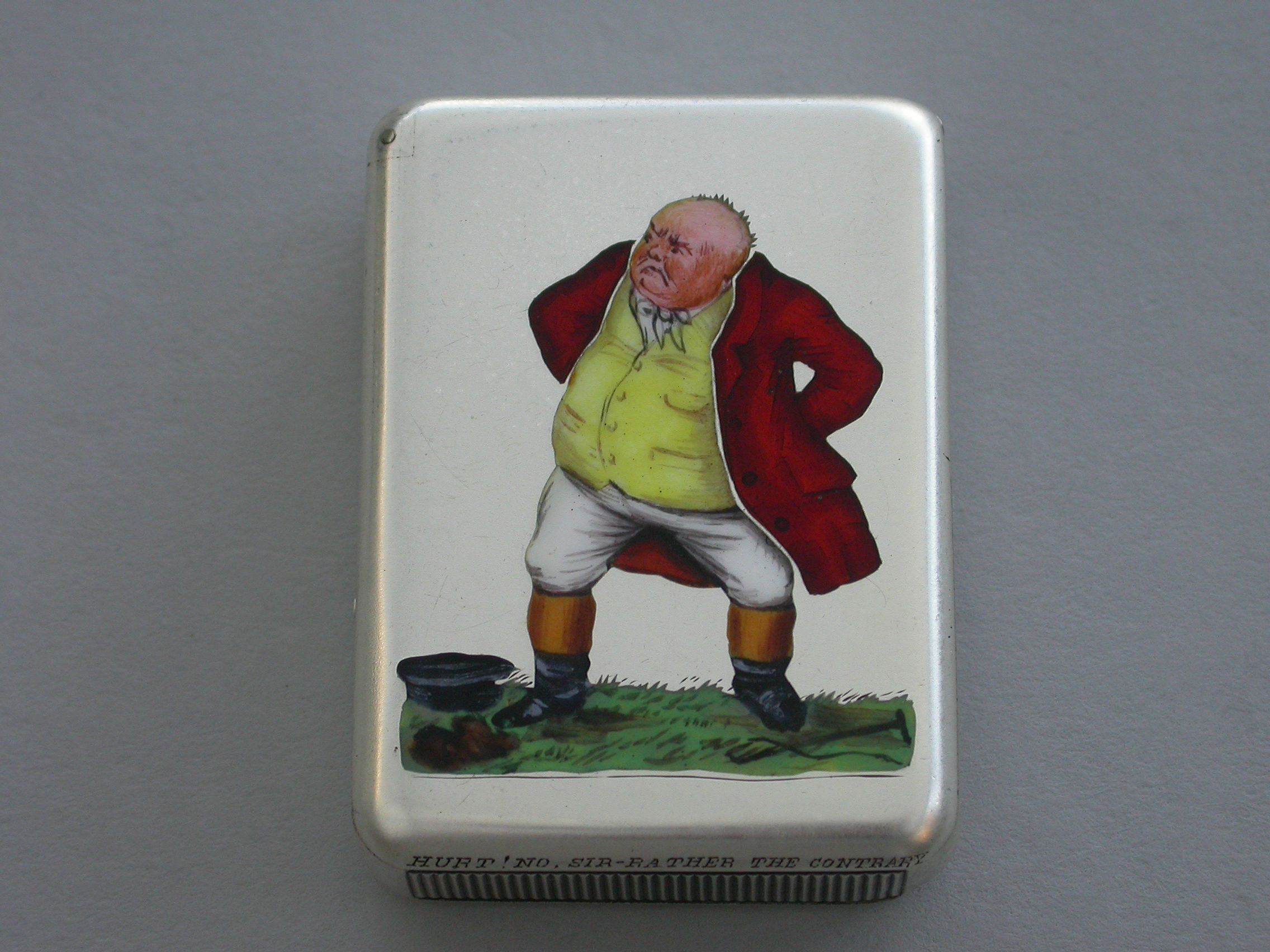 An extremely rare Victorian silver and enamel Vesta Case of rounded rectangular form with sprung hinged flat-top lid, the face enamelled with a depiction of Mr Jorrock's in his red hunting coat having just fallen from his horse and loosing his wig and hat.