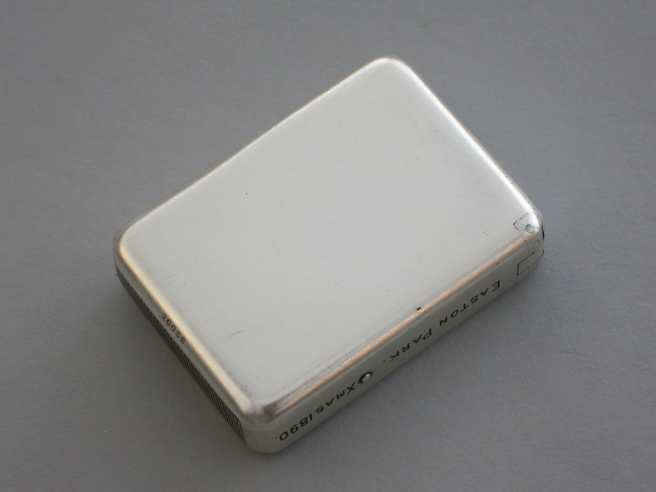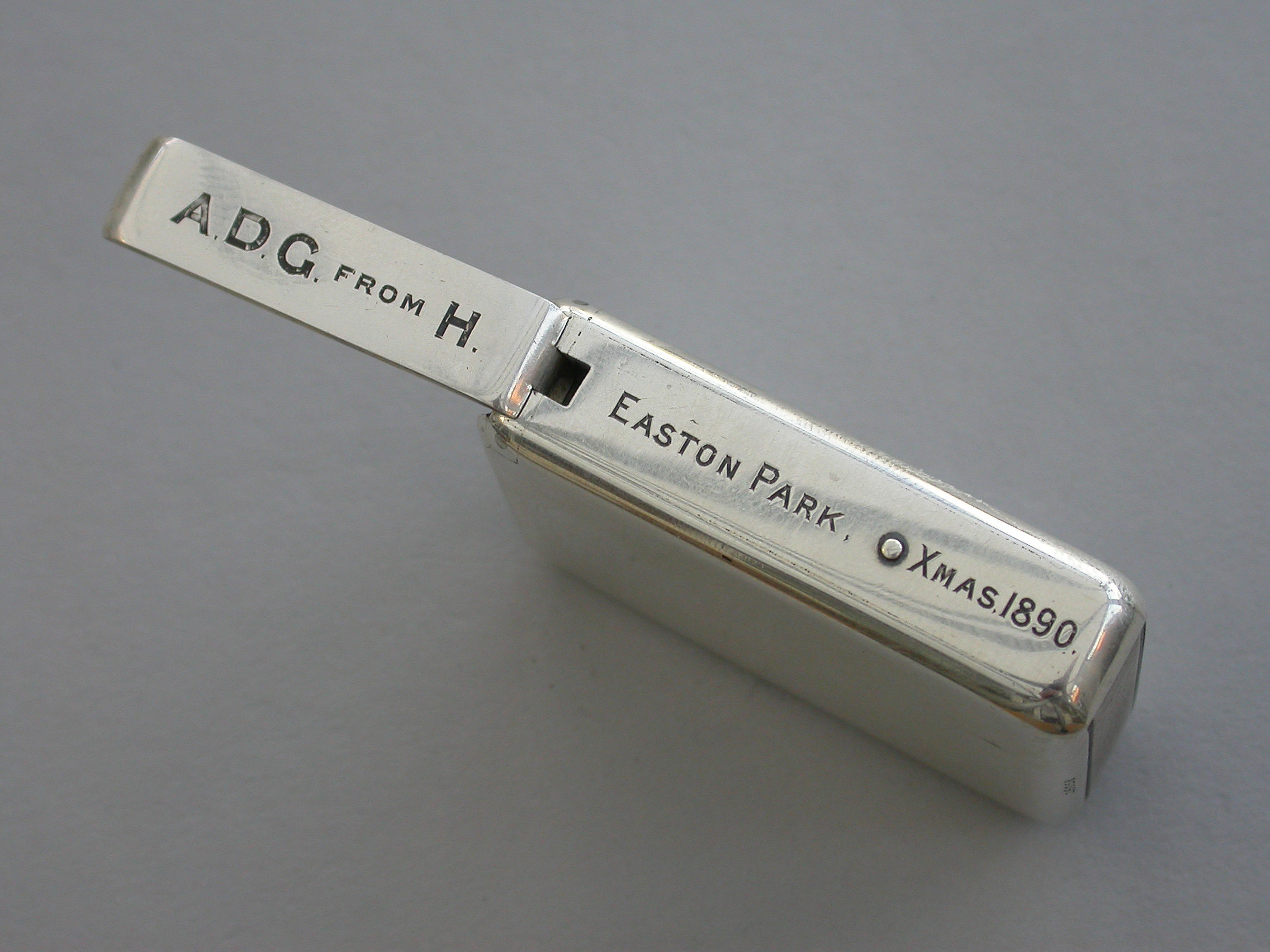 The sides of the case engraved with contemporary presentation inscription - Easton Park Xmas 1890. The end of the case next to the striker engraved - Hurt! No, Sir - Rather the Contrary. Silver gilt interior.