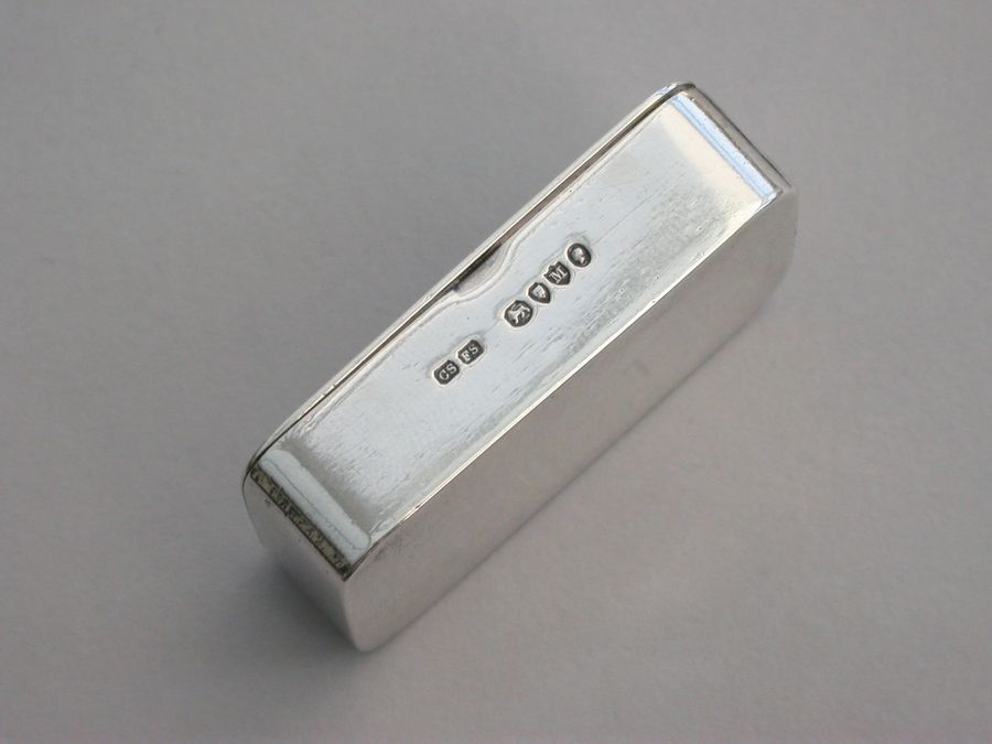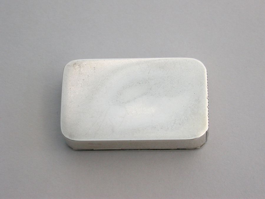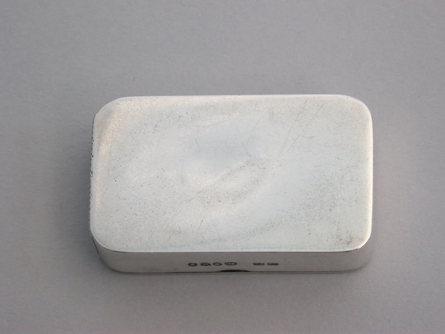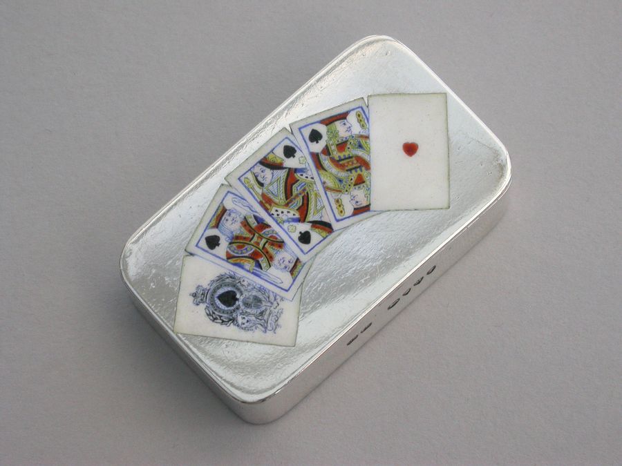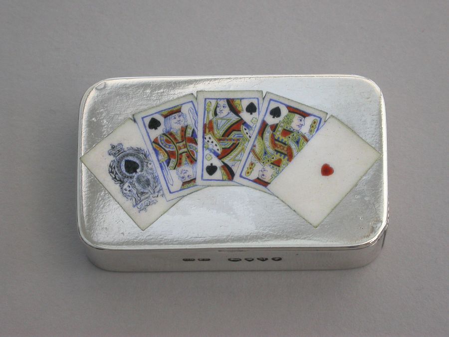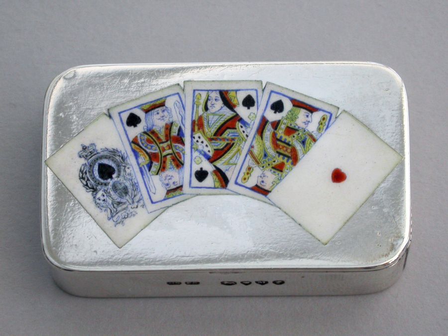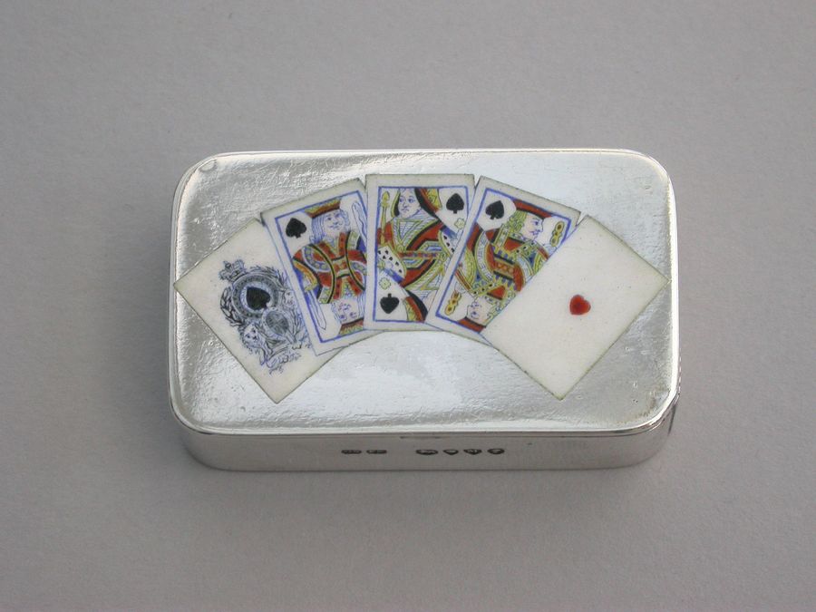 A fine quality Victorian silver Vesta Case of rounded rectangular form, with striker to one end, the lid enamelled with five playing cards: the Ace, King, Queen and Jack of Spades and the Ace of Hearts. The hinged cover running length-ways.