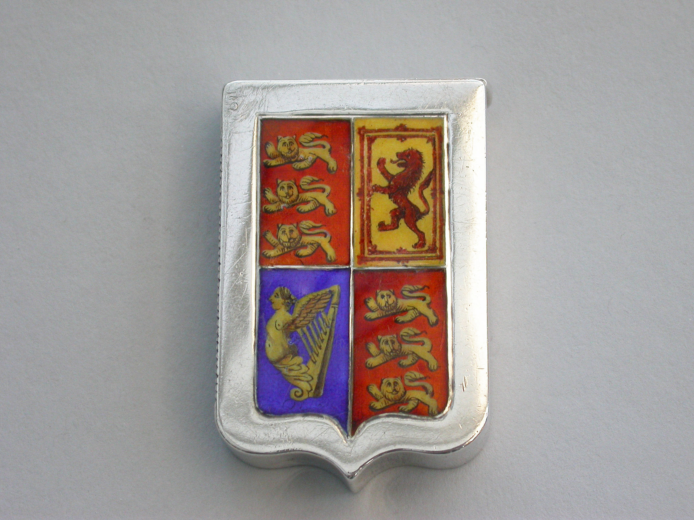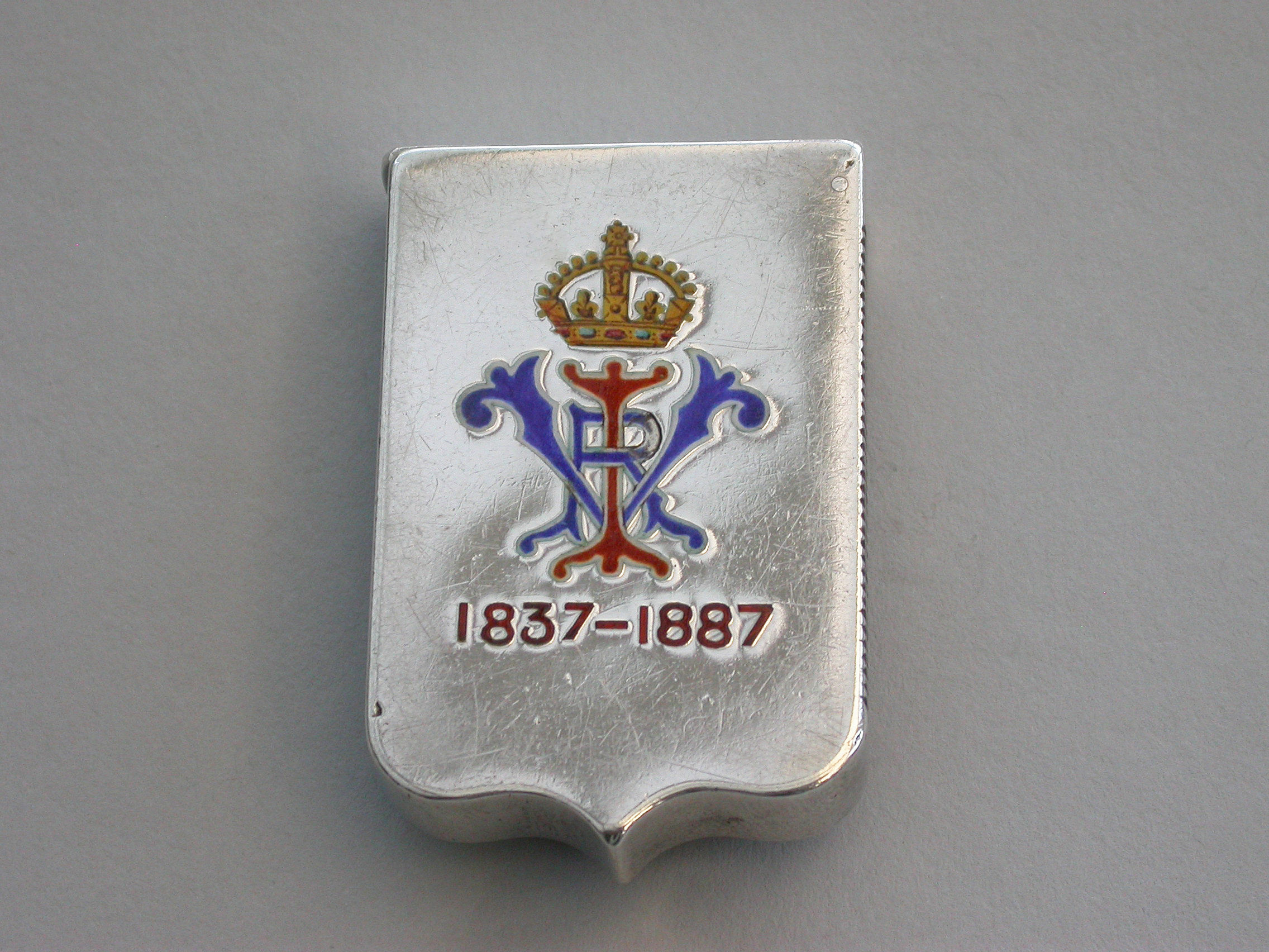 A fine quality and rare Victorian silver and enamel Vesta Case, of shield shape with sprung flat-top hinged lid, made to commemorate the Golden Jubilee of queen Victoria, the face enamelled with the Royal Standard flag and the reverse with queens Victoria's cypher and Royal Crown above the dates 1837 - 1887.