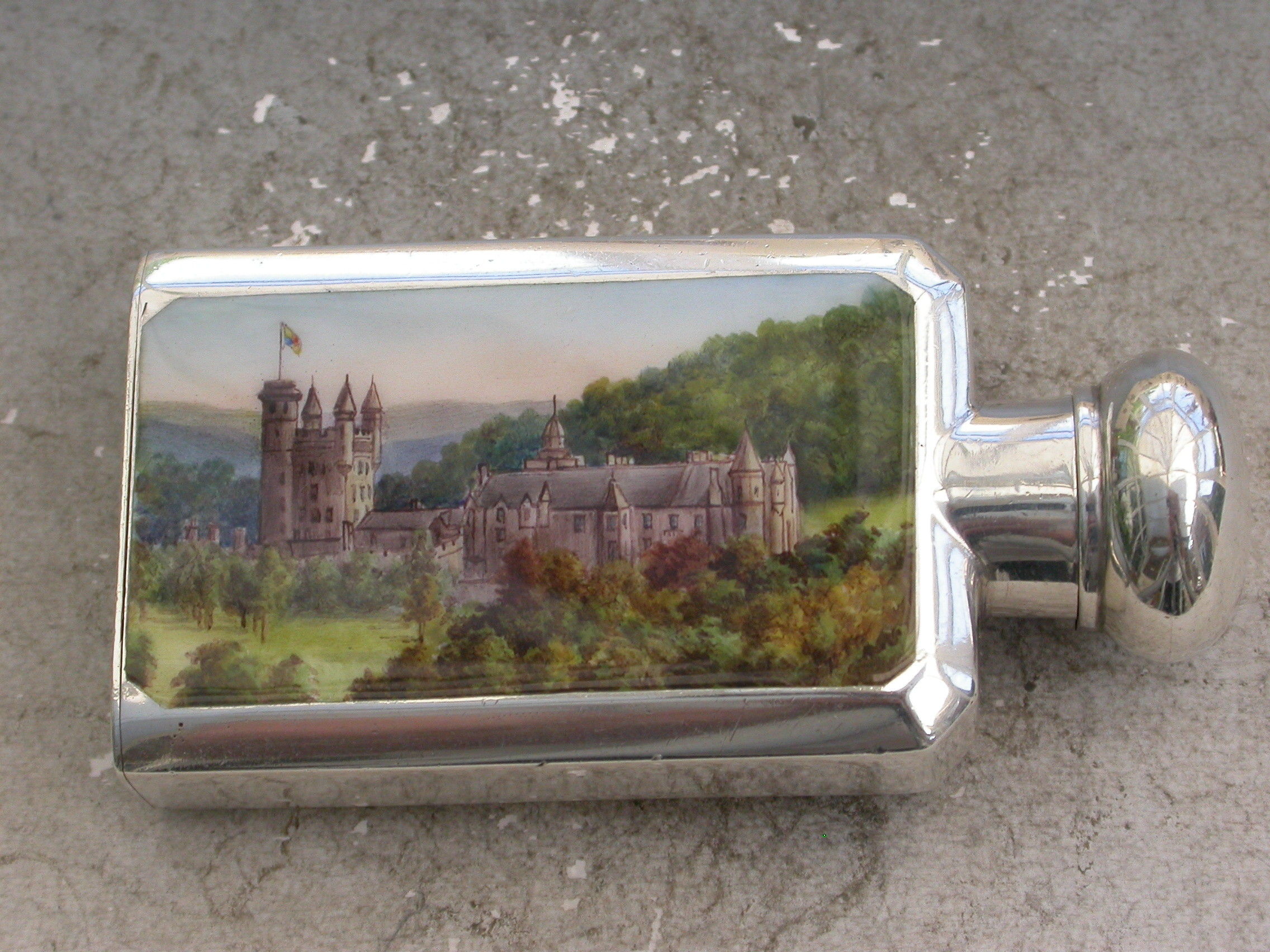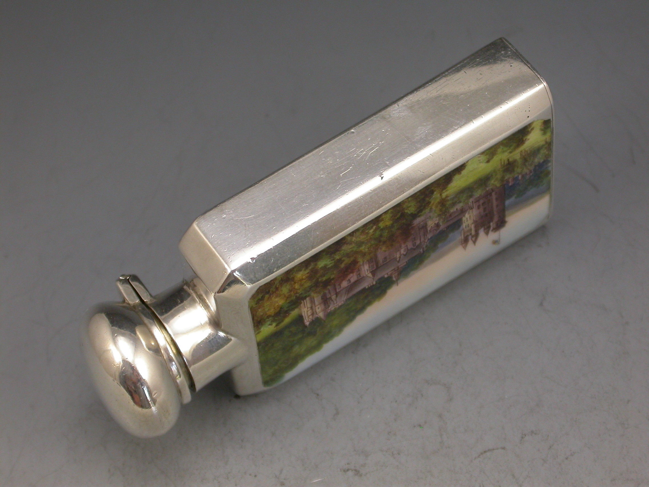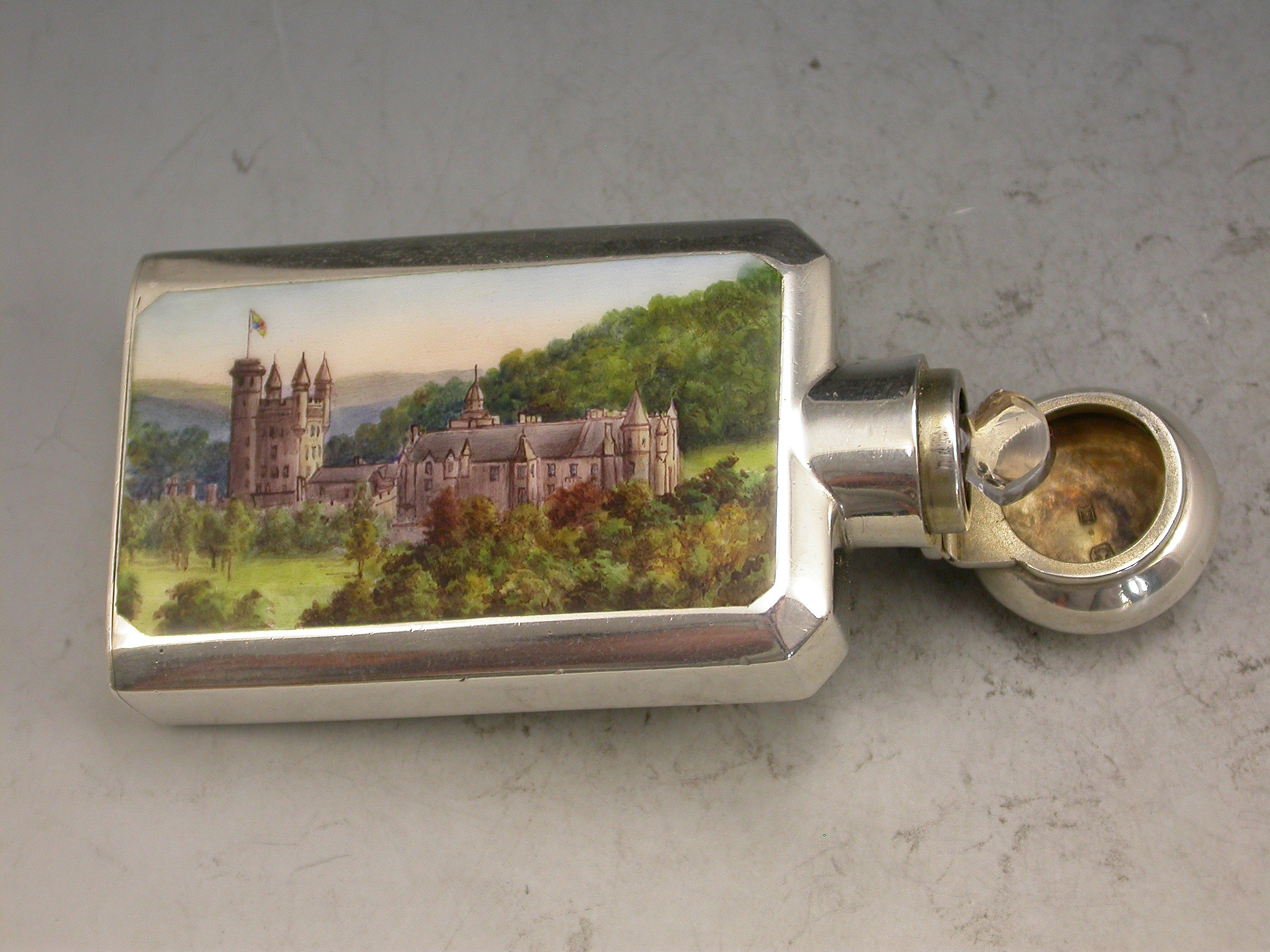A superb late Victorian glass lined silver Scent Bottle of shaped rectangular form with beveled edges and hinged circular domed cover, silver gilt interior with glass stopper. The face enamelled with a panel depicting Balmoral Castle in Royal Deeside, Aberdeenshire, Scotland. The reverse engraved with contemporary initials