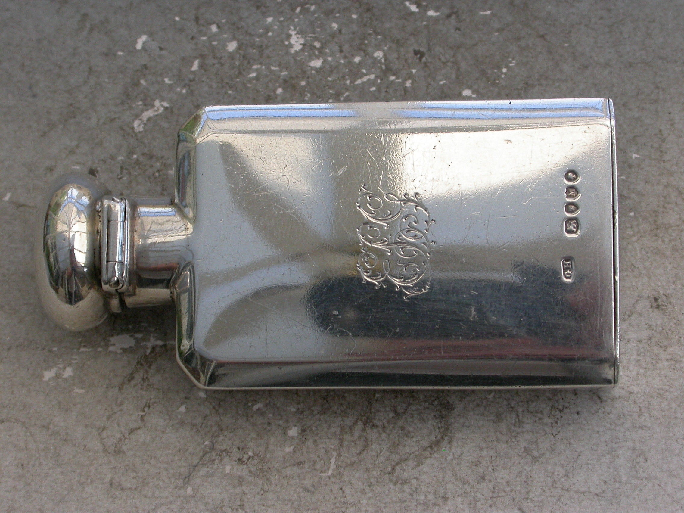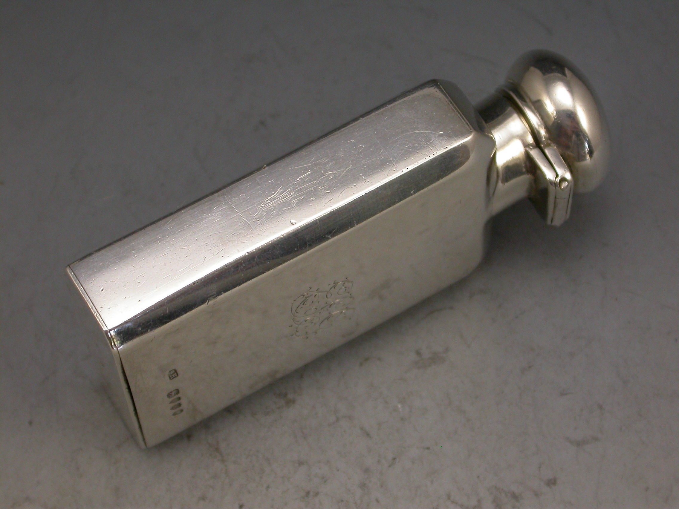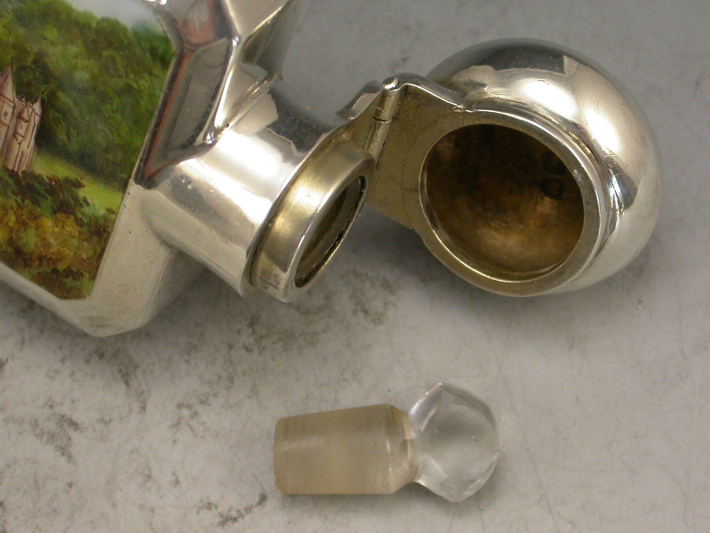 A superb late Victorian glass lined silver Scent Bottle of shaped rectangular form with beveled edges and hinged circular domed cover, silver gilt interior with glass stopper. The face enamelled with a panel depicting Balmoral Castle in Royal Deeside, Aberdeenshire, Scotland. The reverse engraved with contemporary initials