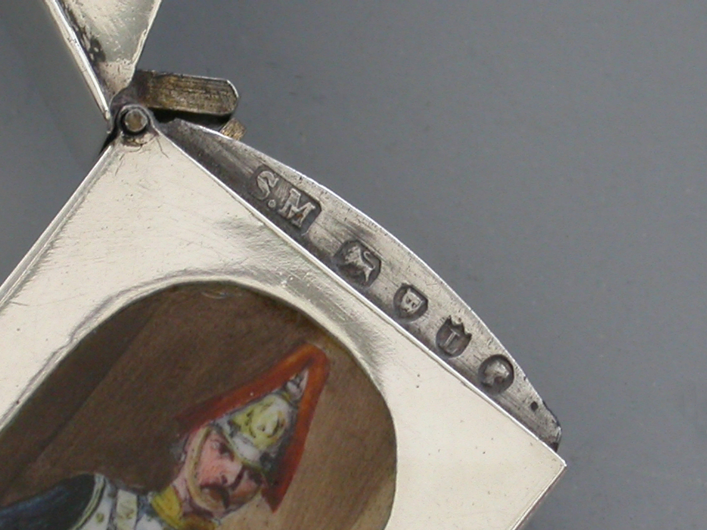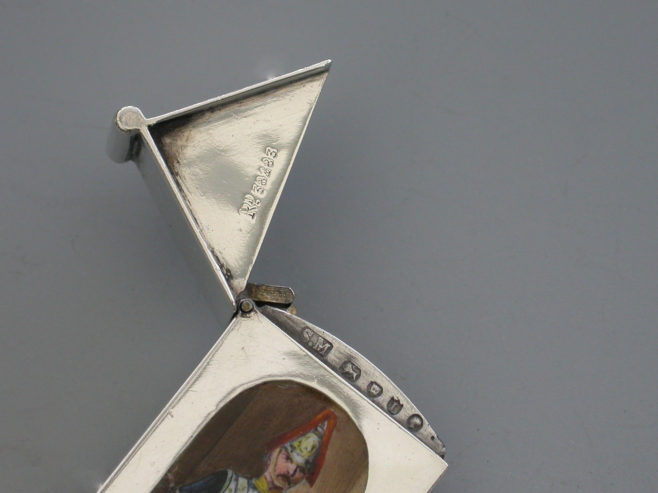 This is one from a series of silver and enamel Vesta Cases depicting ‘Soldiers of the Queen’ produced by Mordan around the time of Victoria’s Golden Jubilee in 1887. It was originally thought that the Sentry Box Vesta was limited to a series of perhaps 10 or 12 different examples made specifically for the Jubilee. Around 25 plus different Regiments have now been recorded.