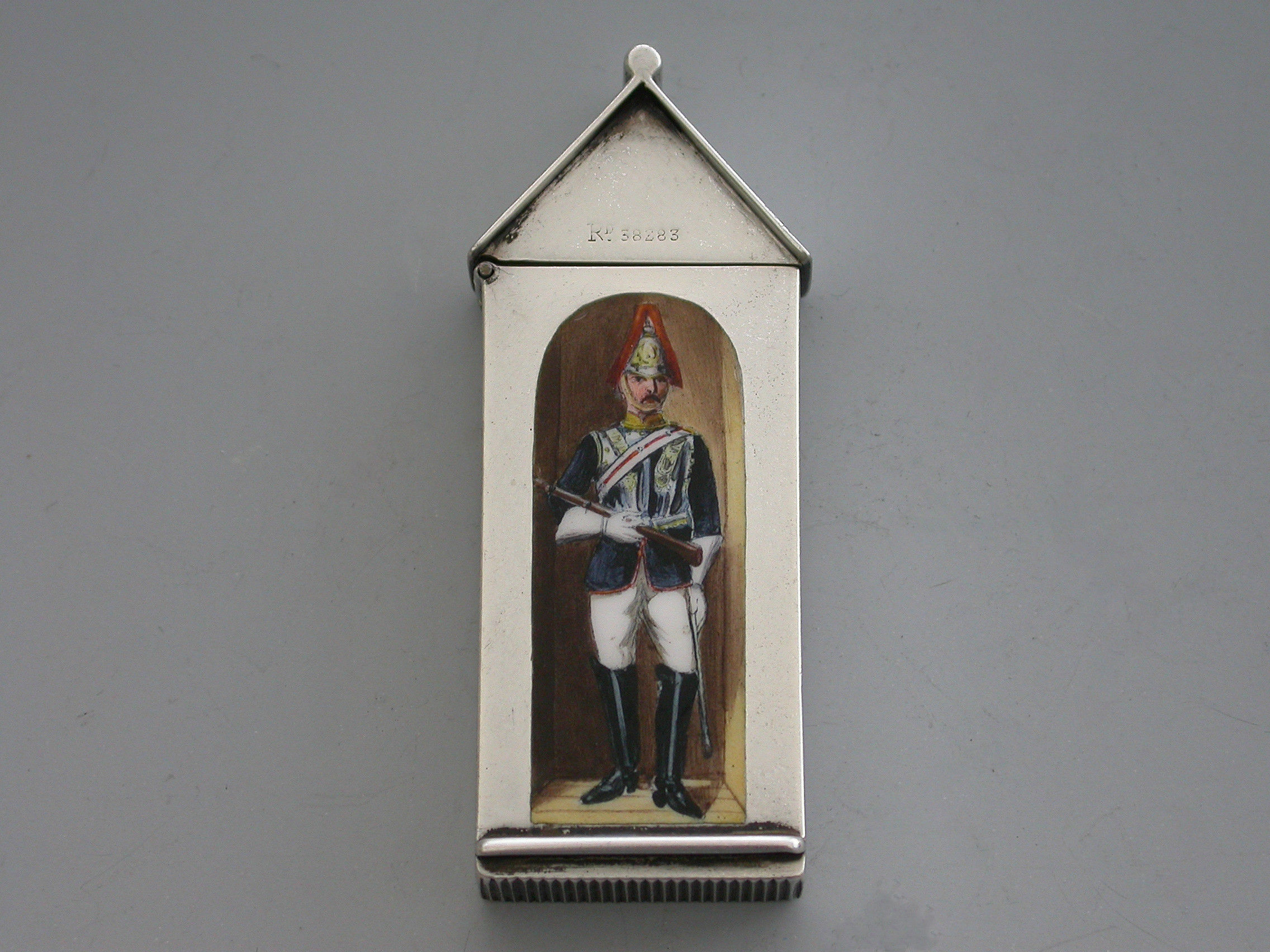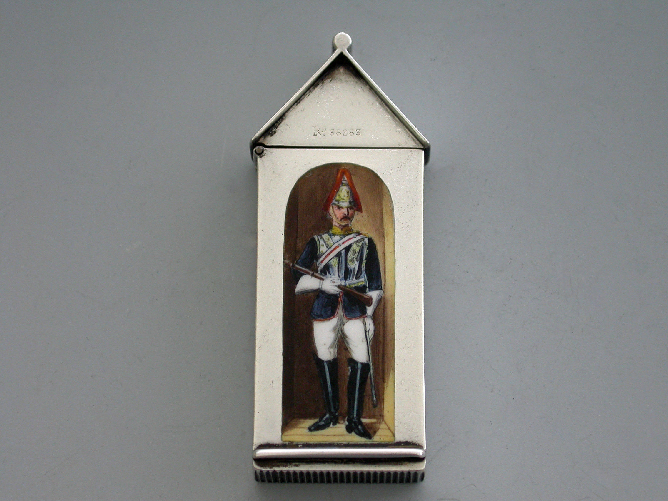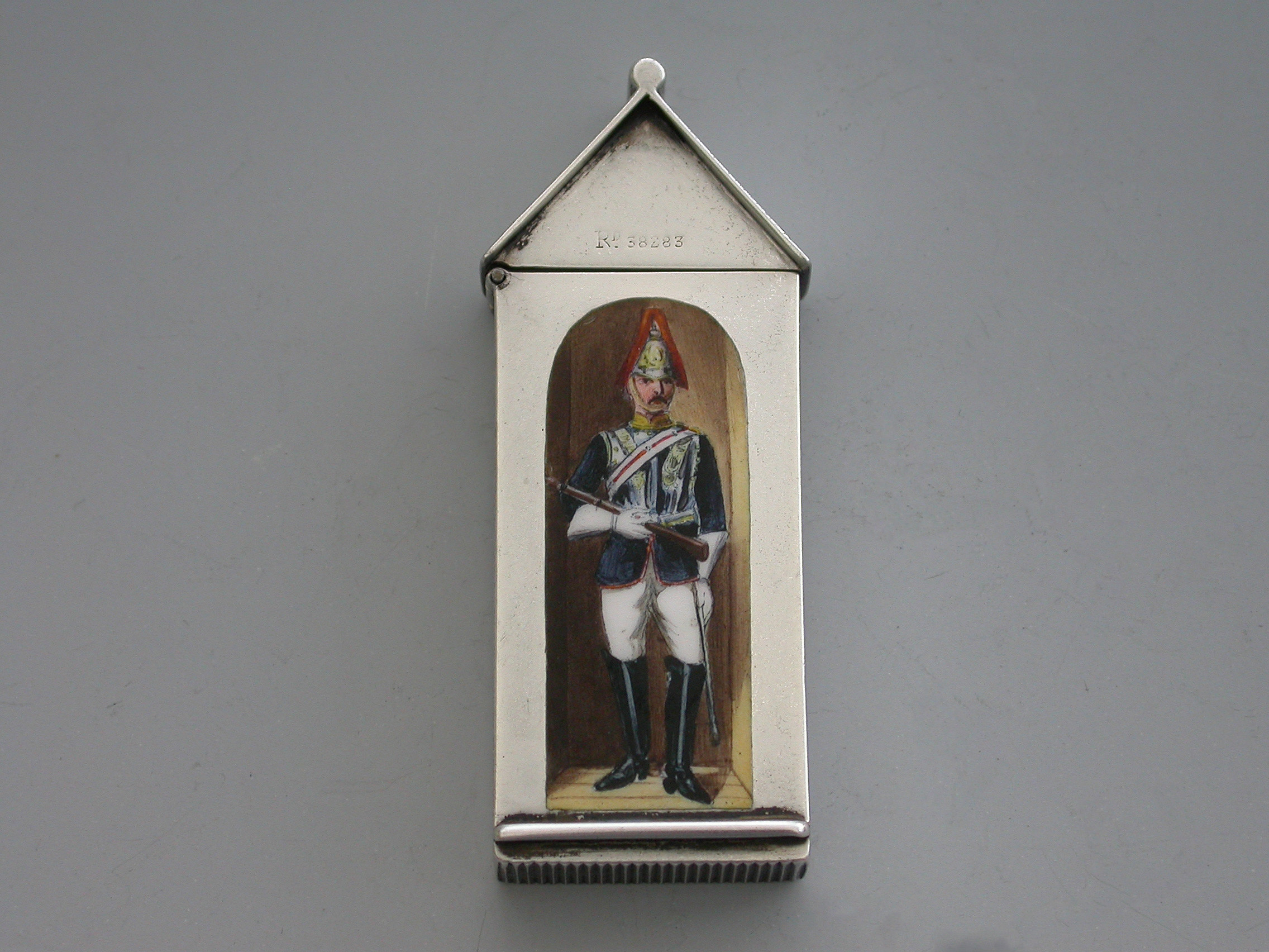 A fine and rare Victorian silver and enamel Vesta Case of Sentry Box form with hinged peaked lid, the face enamelled with a trooper from ‘The Royal Horse Guards' (The Blues). The cover stamped with the Registration Number 38283.