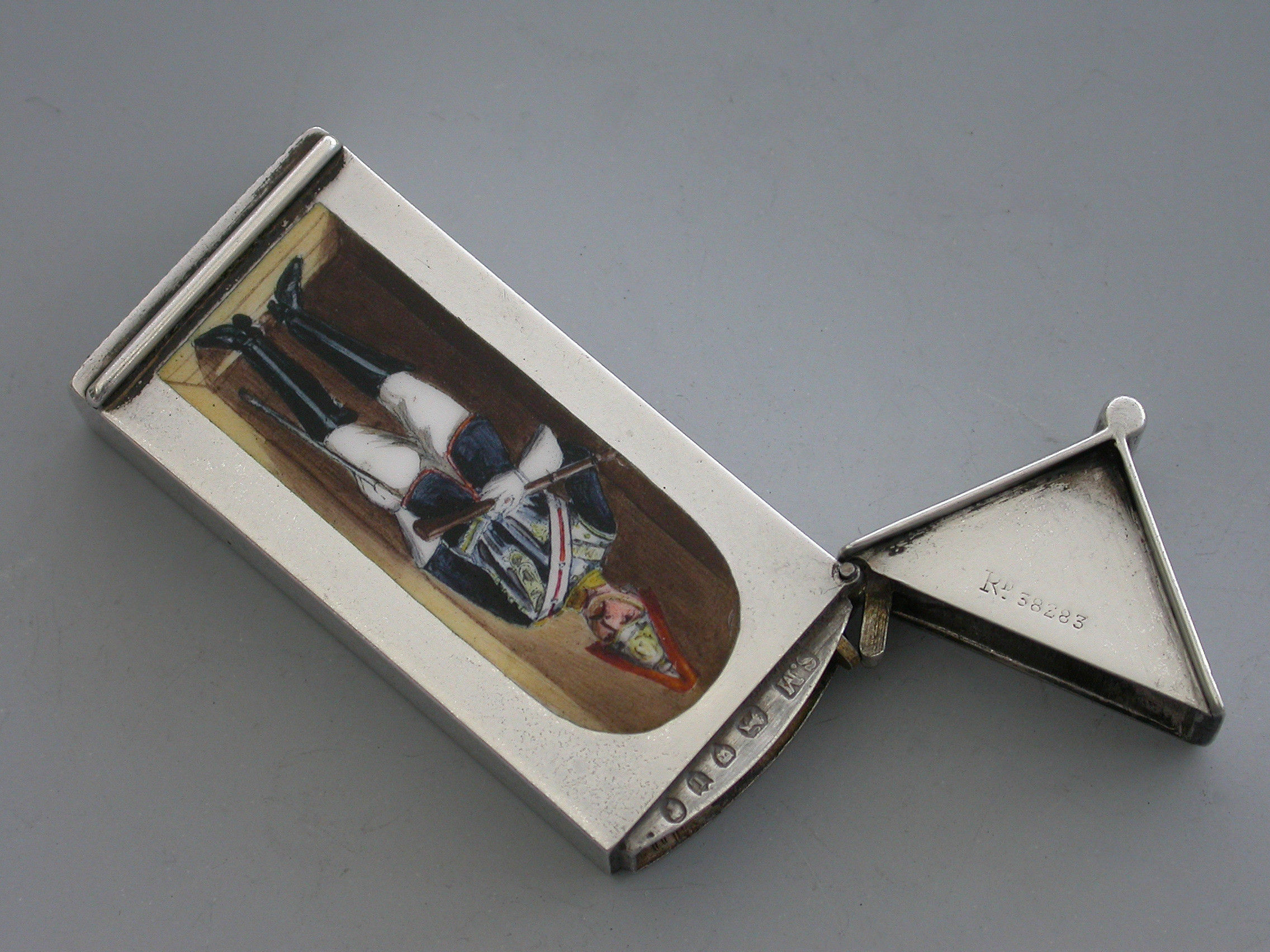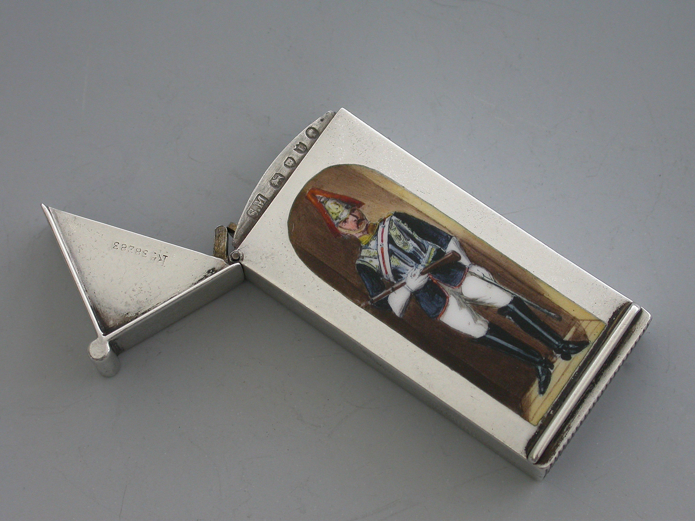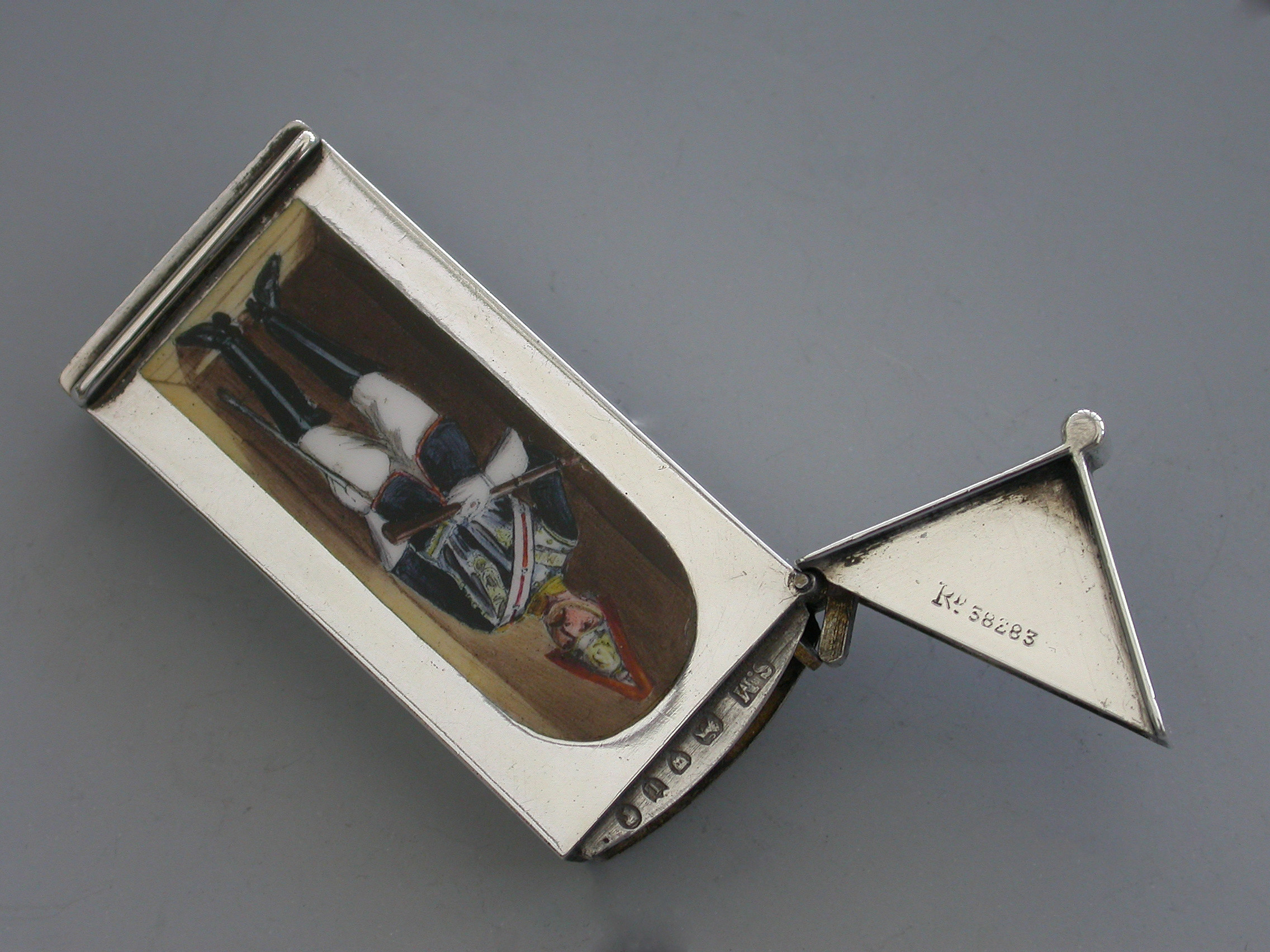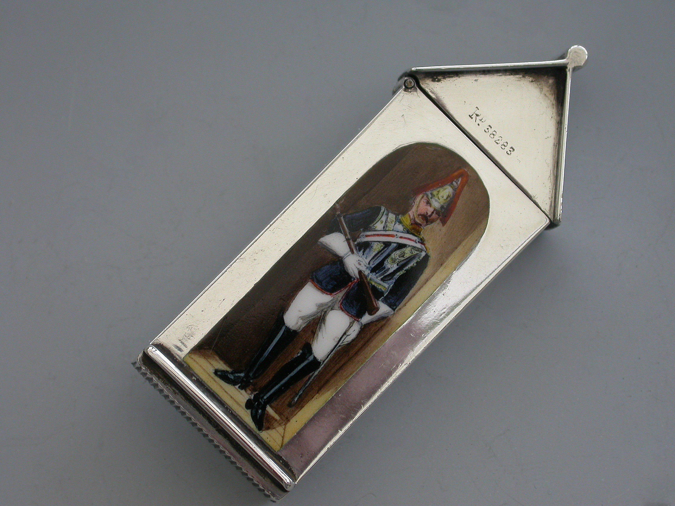 A fine and rare Victorian silver and enamel Vesta Case of Sentry Box form with hinged peaked lid, the face enamelled with a trooper from ‘The Royal Horse Guards' (The Blues). The cover stamped with the Registration Number 38283.