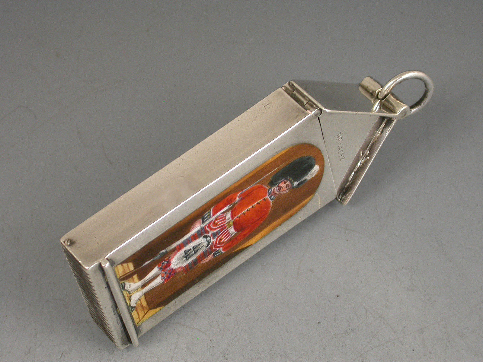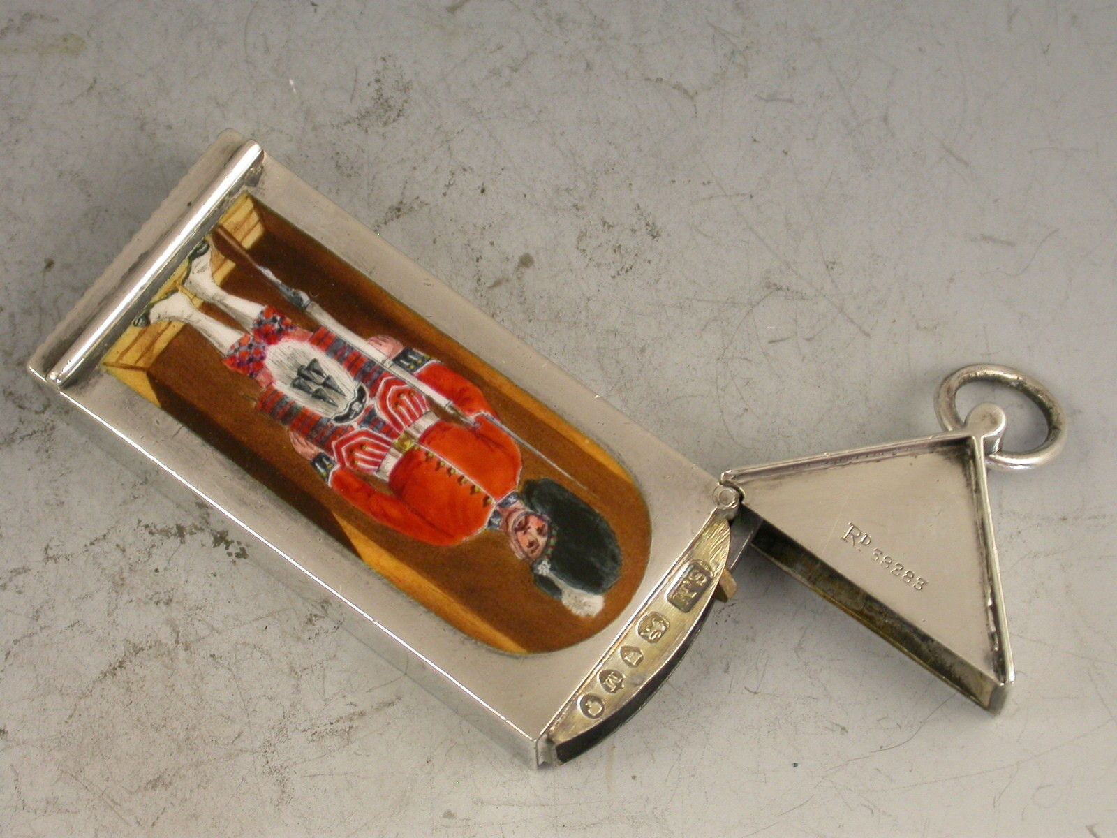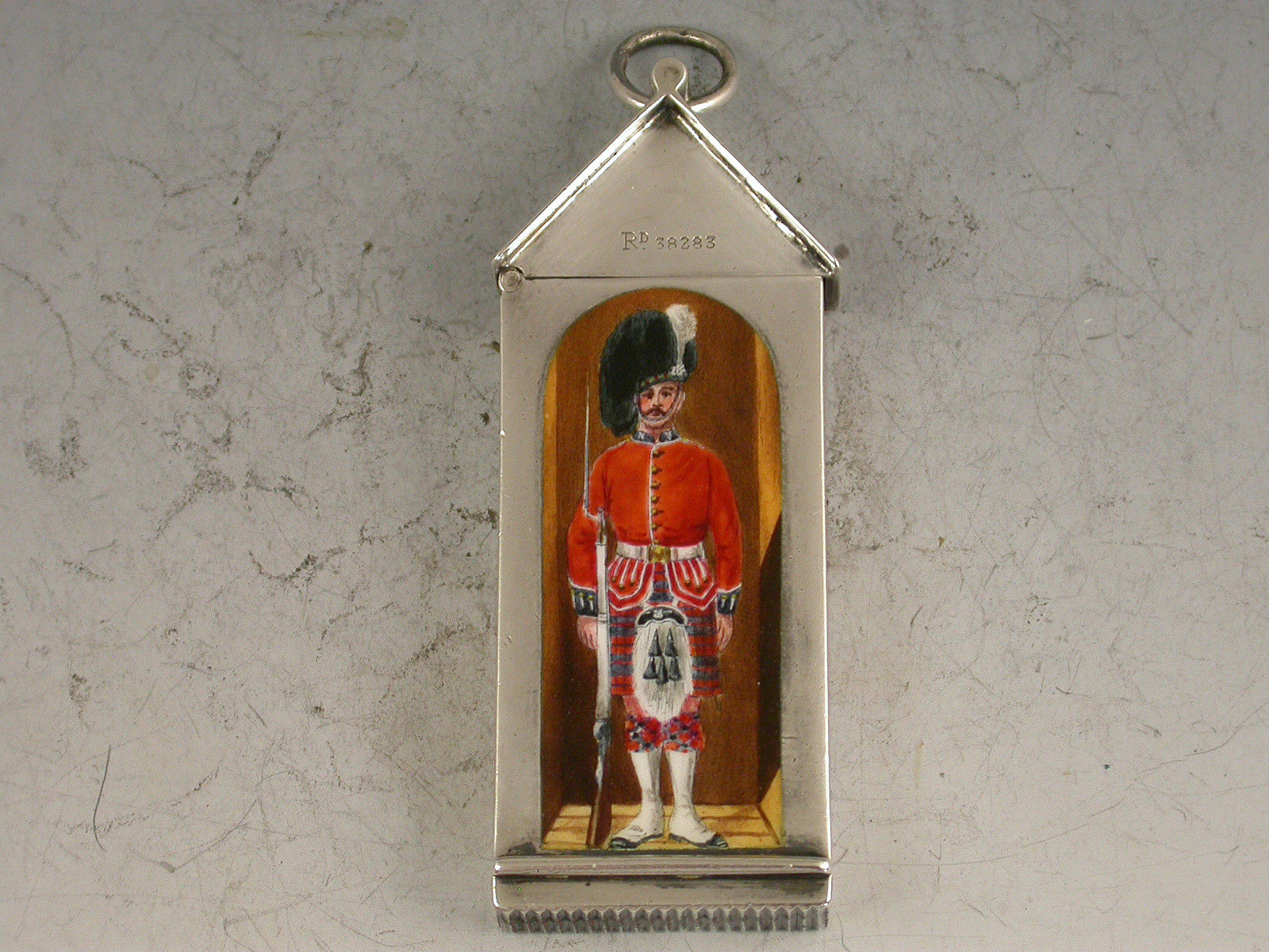 This is one from a series of silver and enamel Vesta Cases depicting ‘Soldiers of the Queen’ produced by Mordan around the time of Victoria’s Golden Jubilee in 1887. It was originally thought that the Sentry Box Vesta was limited to a series of perhaps 10 or 12 different examples made specifically for the Jubilee. Around 25 plus different Regiments have now been recorded.